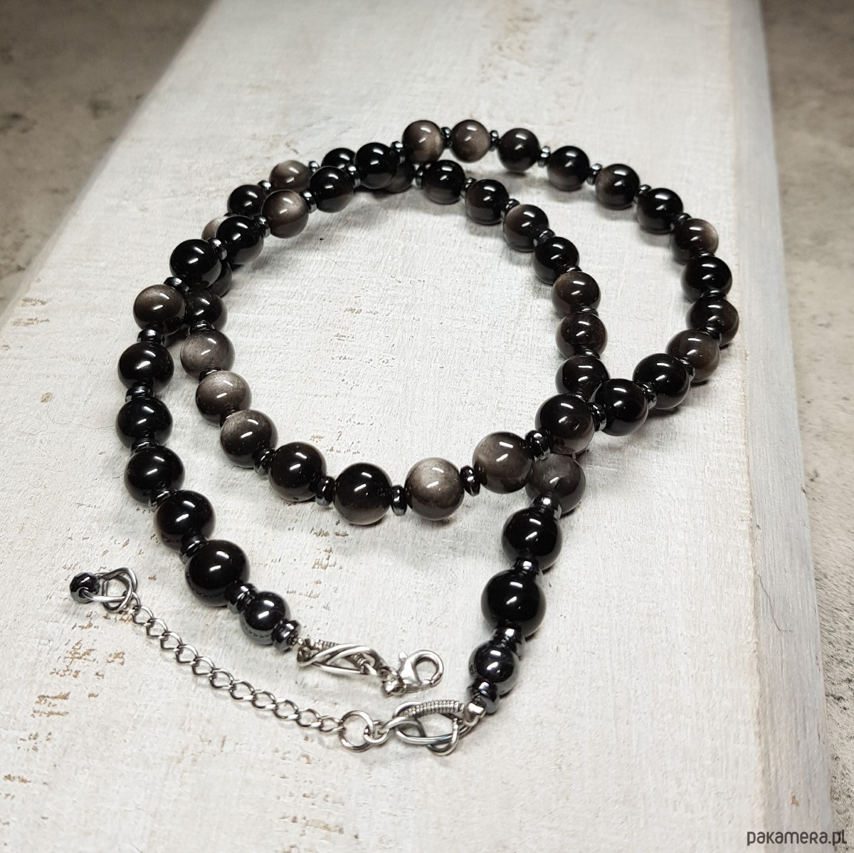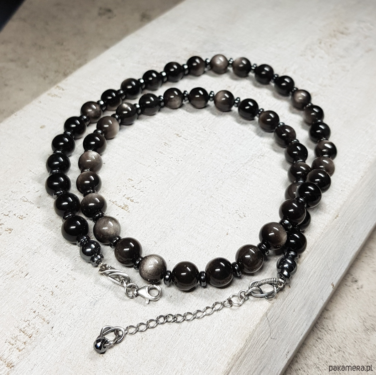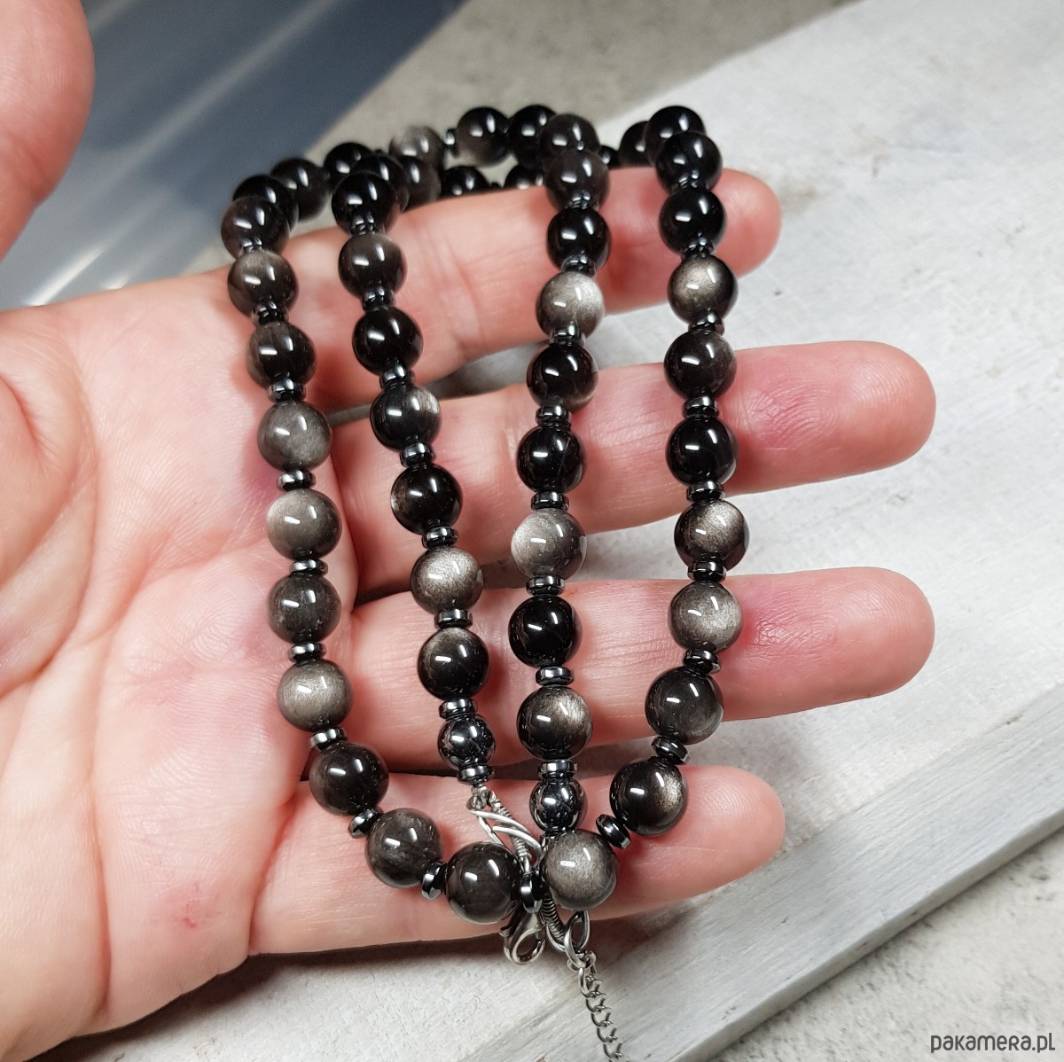 Sznur korali wykonany z kulek 8mm srebrzystego obsydianu i przekładek hematytu. obsydian jest w klasie AAA, każda kula ma piękną srebrzystą poświatę. Wykończenia i zapięcie wykonane w srebrze 999 i 925, oksydowanym i wypolerowanym.. Długość korali wynosi 55 cm plus przedłużka 3 cm.