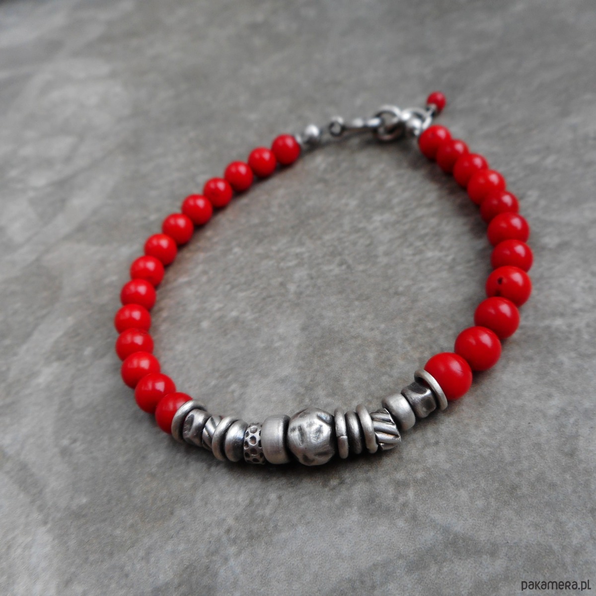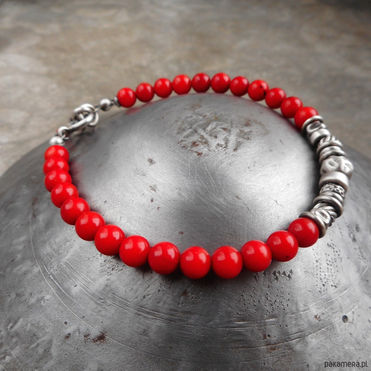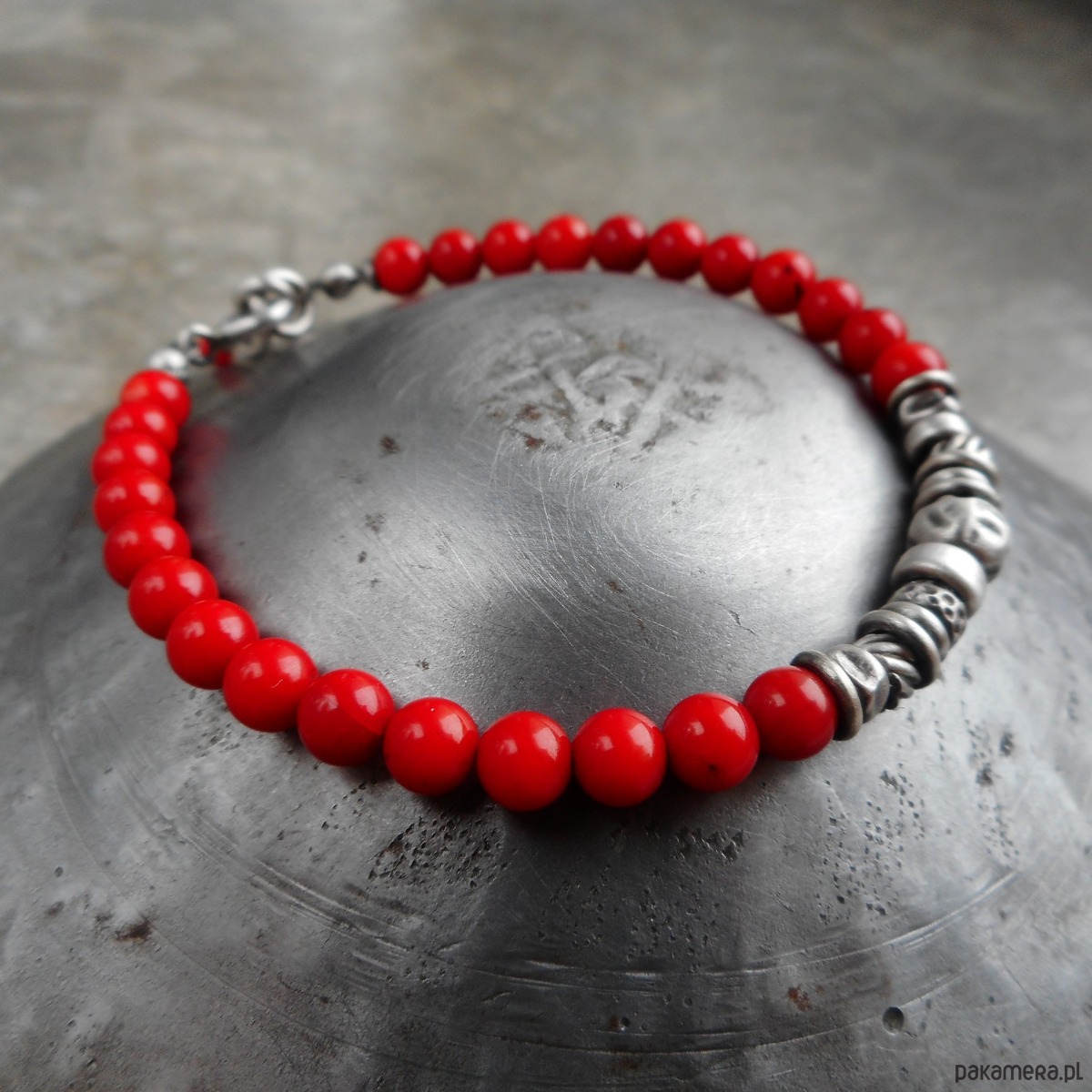 Wyjątkowa bransoletka z kamieni naturalnych i szlachetnego srebra; klasyczna i elegancka, z pięknymi, intensywnie czerwonymi koralami i srebrnymi gniecionymi przekładkami.