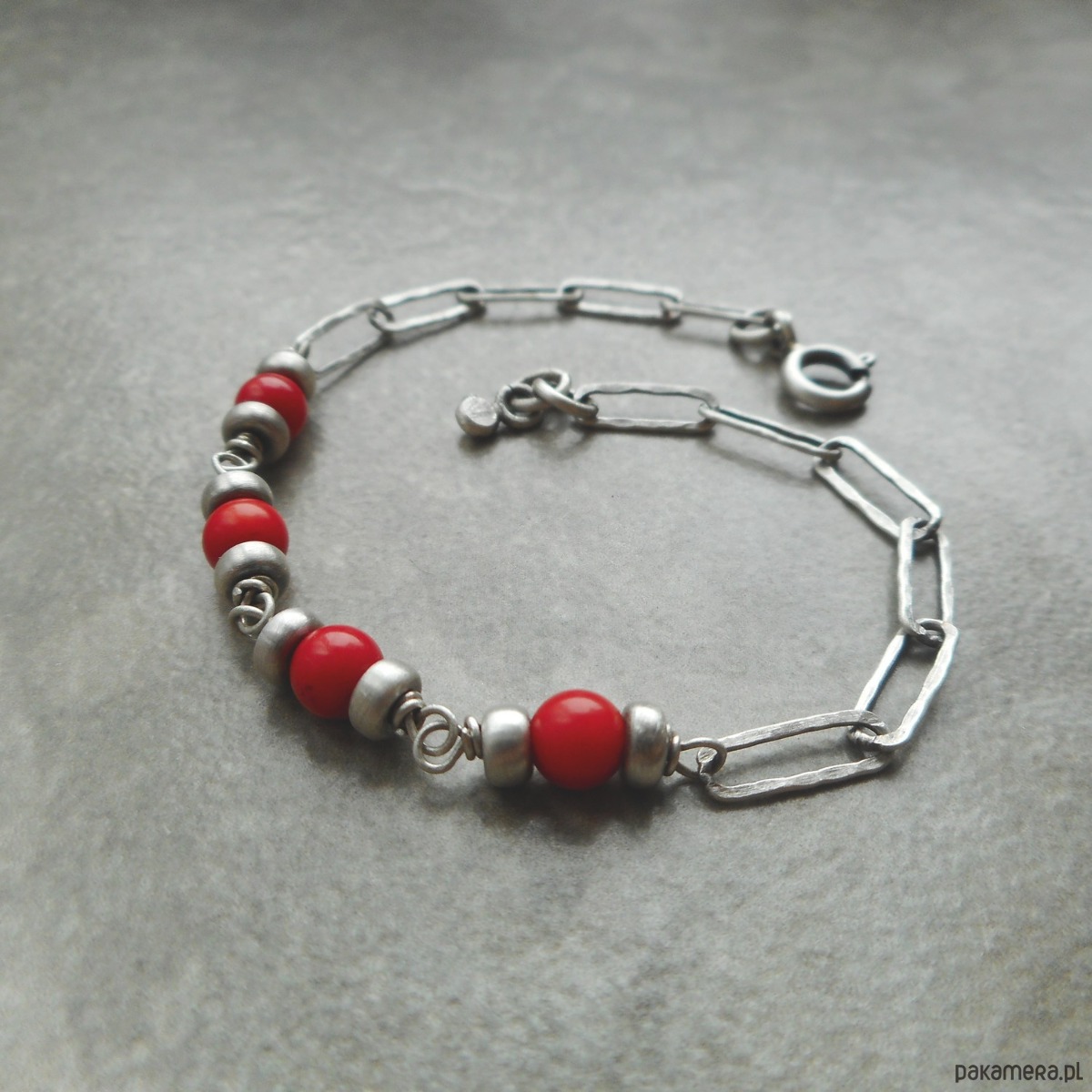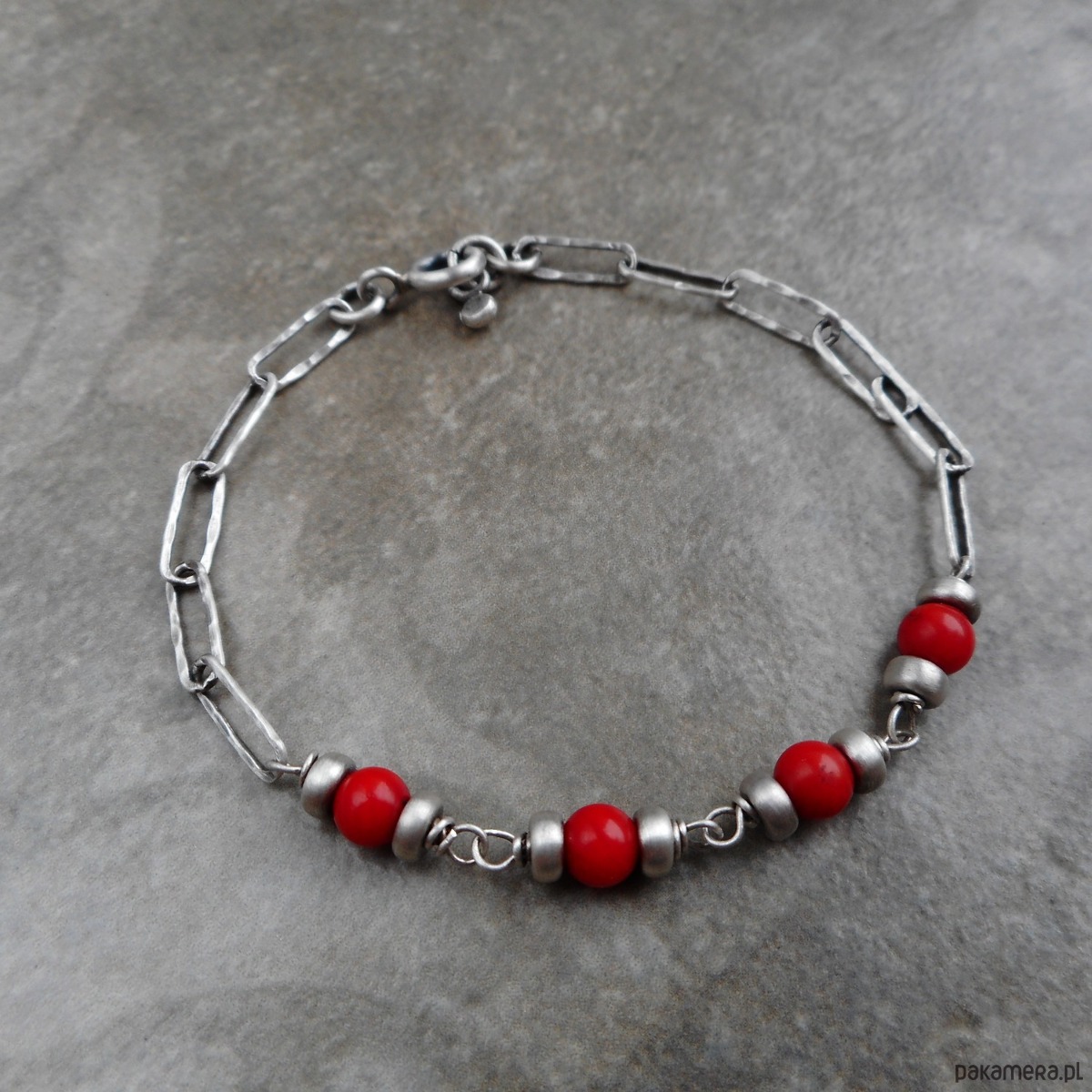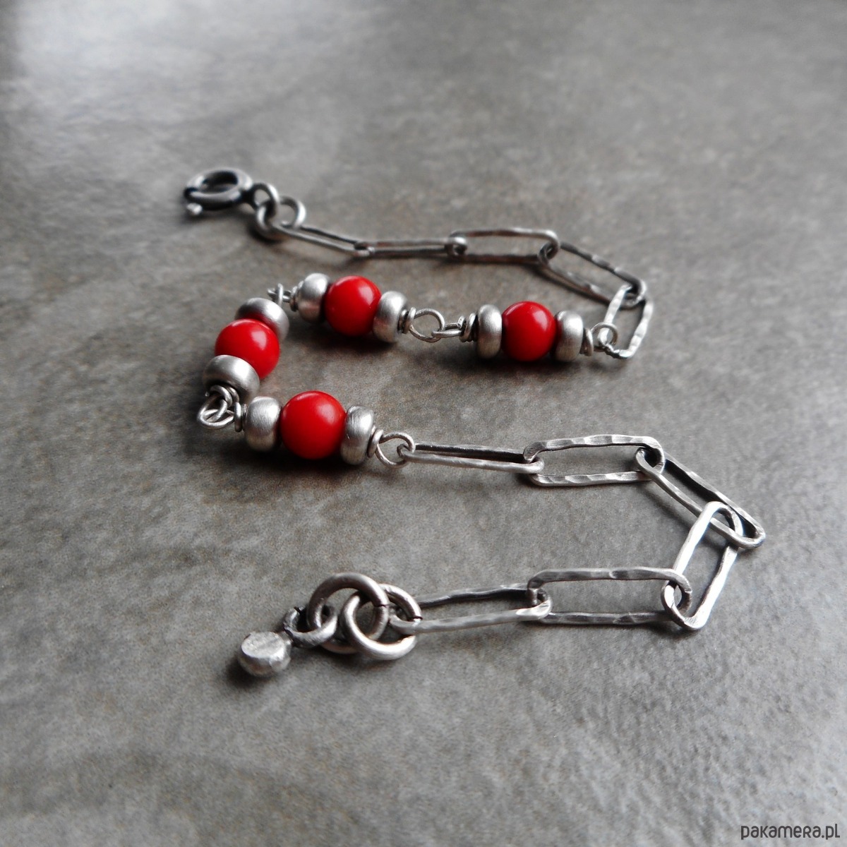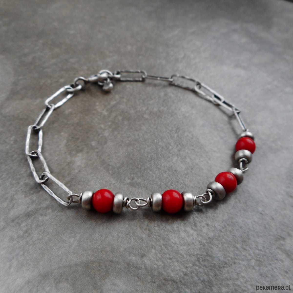 Bransoletka z kamieni naturalnych i szlachetnego srebra; prosta w formie, przeplatana srebrnymi przekładkami, z intensywnie czerwonymi kuleczkami korala.