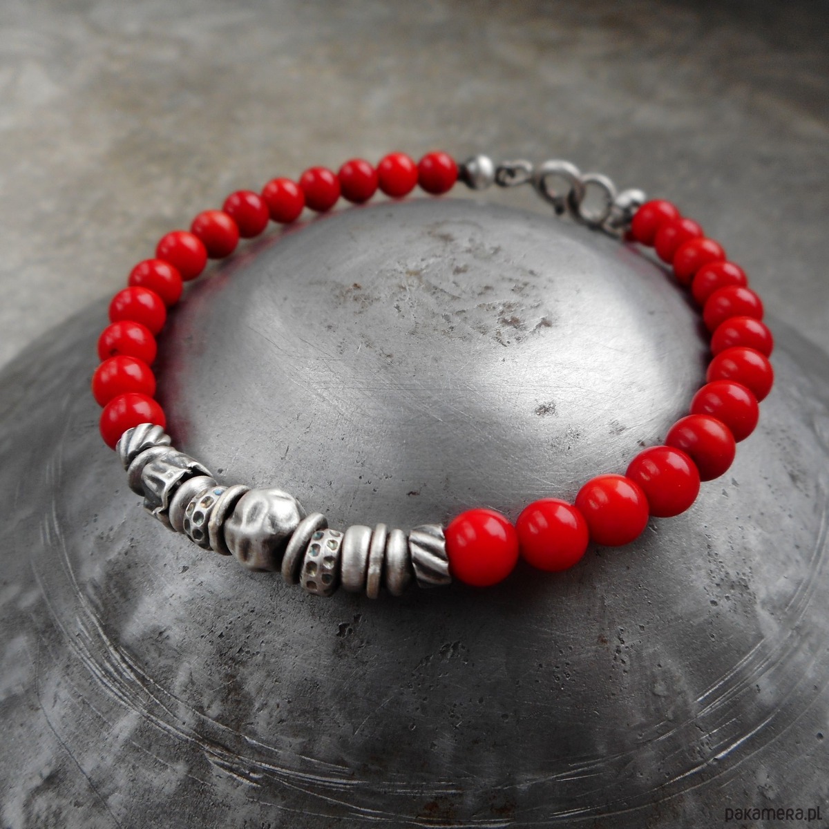 Wyjątkowa bransoletka z kamieni naturalnych i szlachetnego srebra; klasyczna i elegancka, z pięknymi, intensywnie czerwonymi koralami i srebrnymi gniecionymi przekładkami.