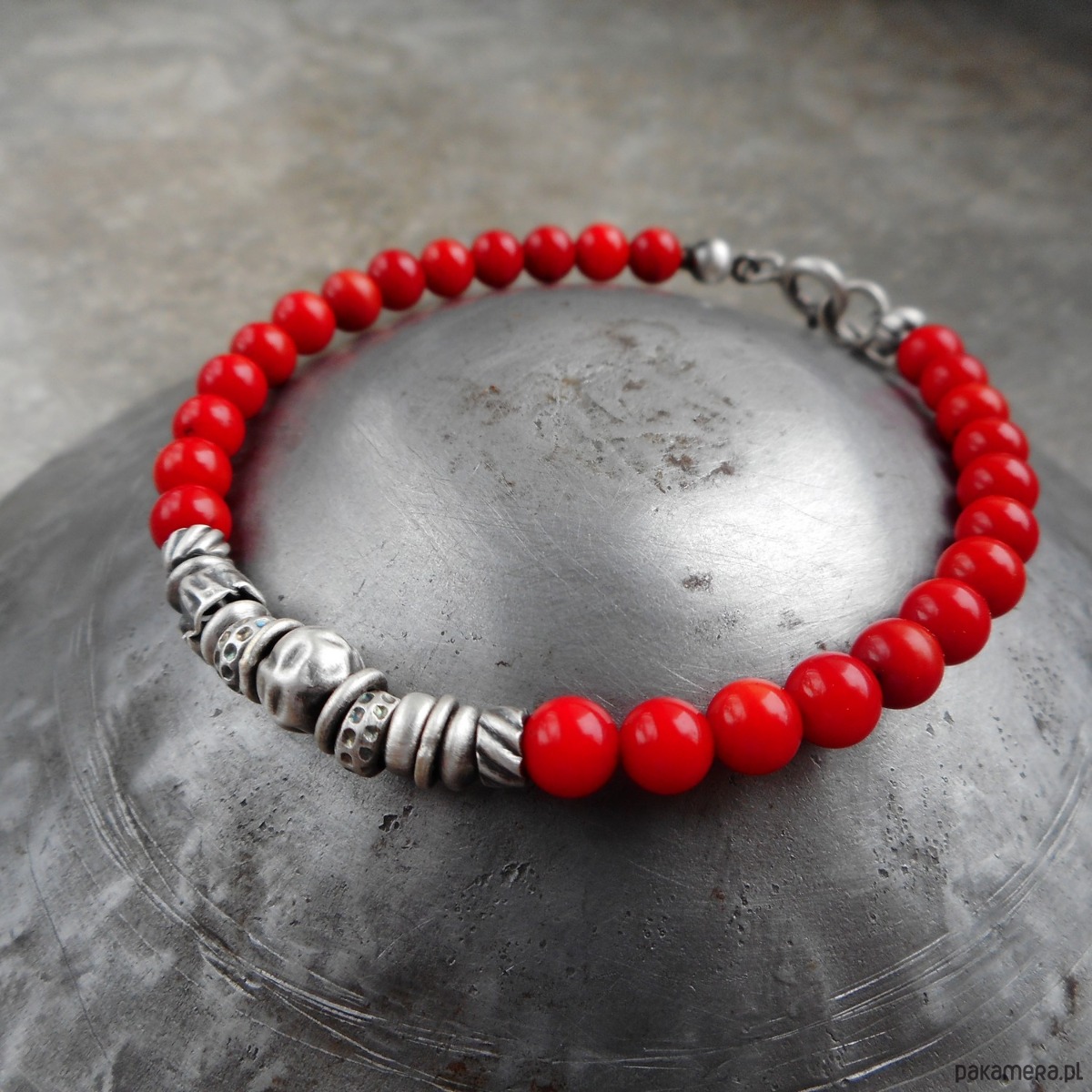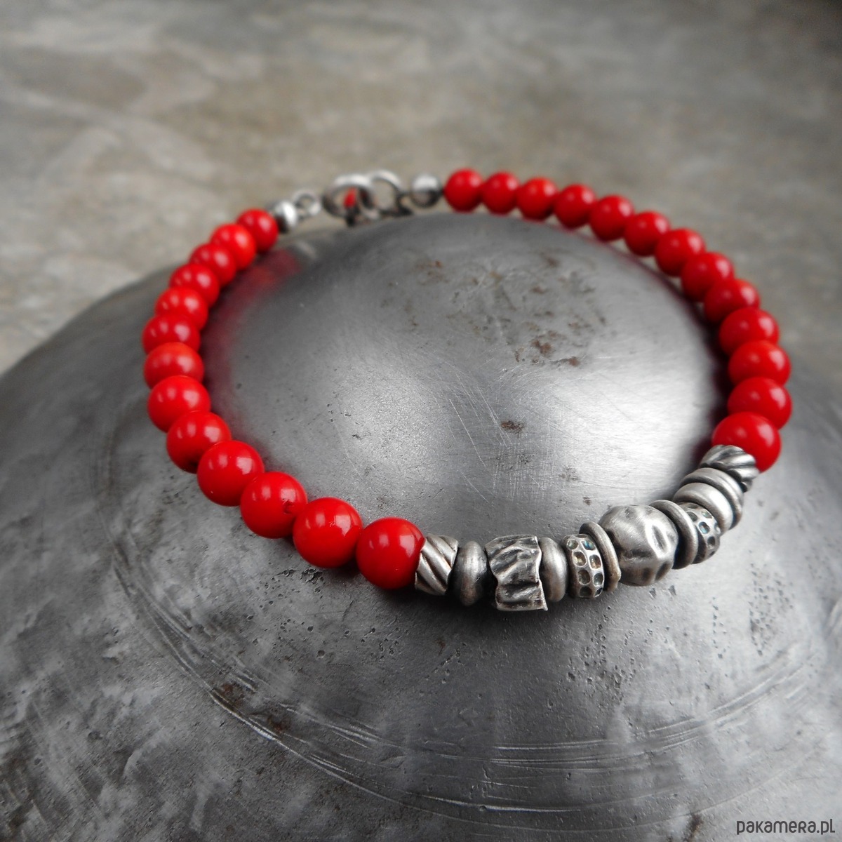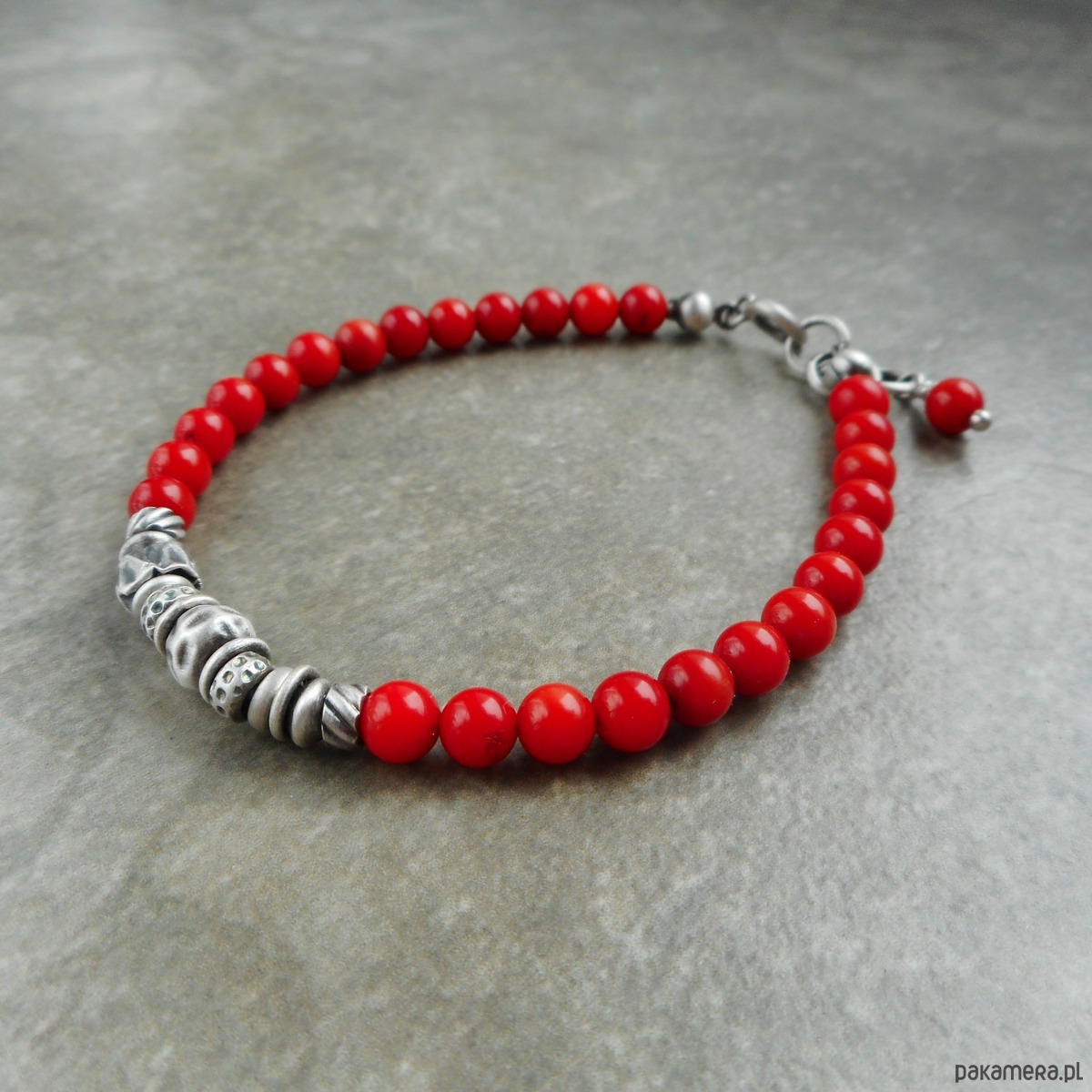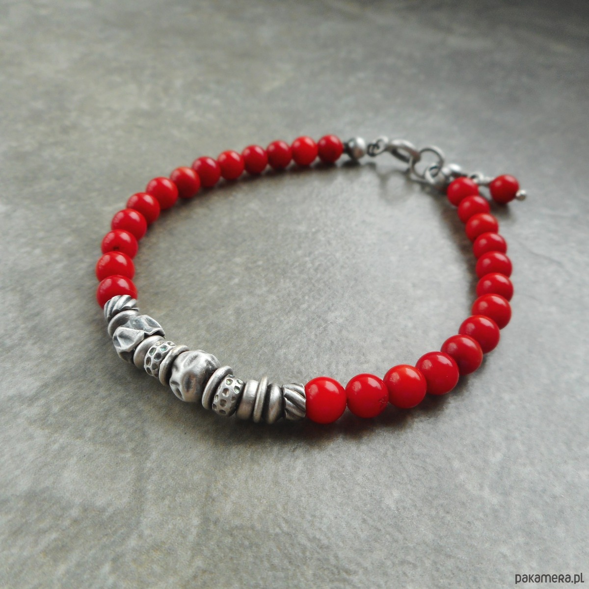 Wyjątkowa bransoletka z kamieni naturalnych i szlachetnego srebra; klasyczna i elegancka, z pięknymi, intensywnie czerwonymi koralami i srebrnymi gniecionymi przekładkami.