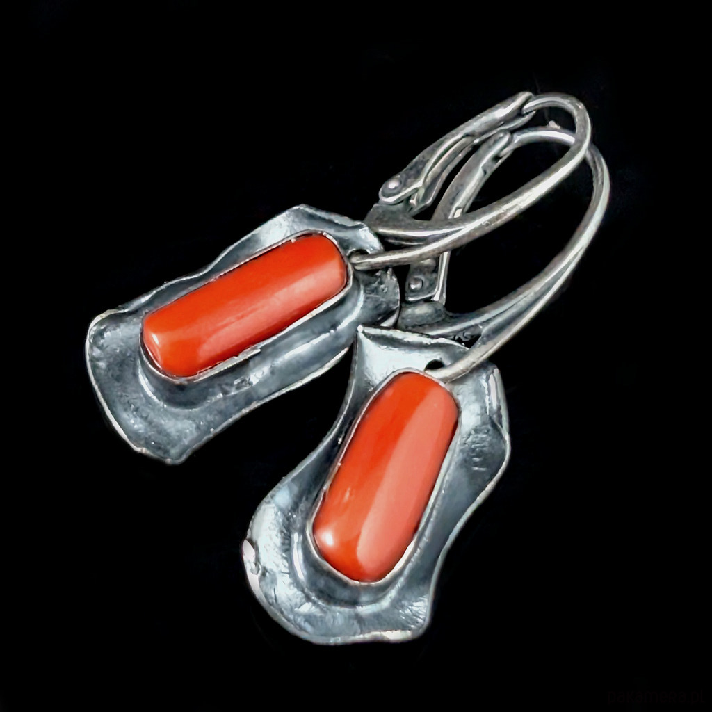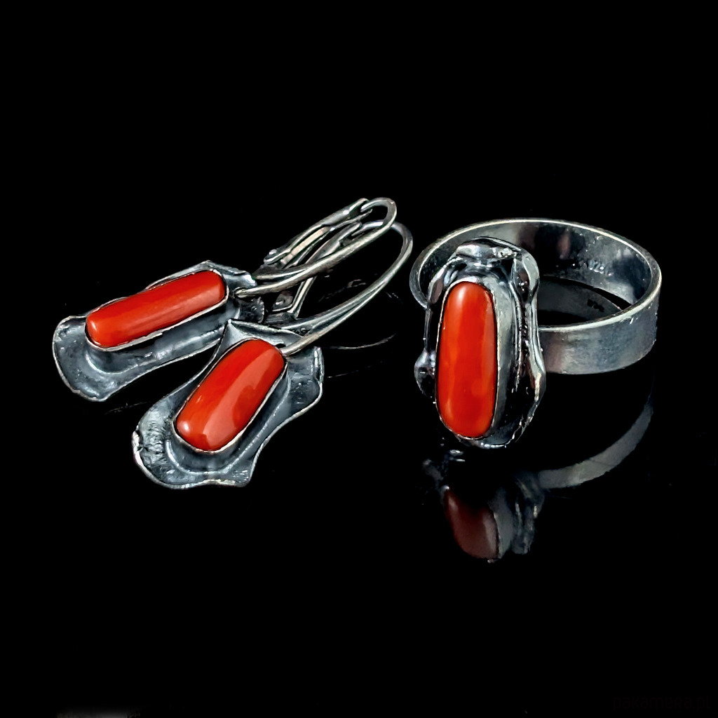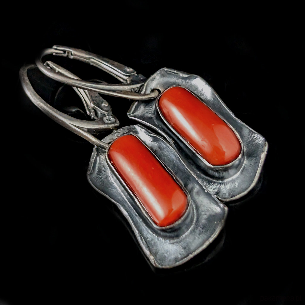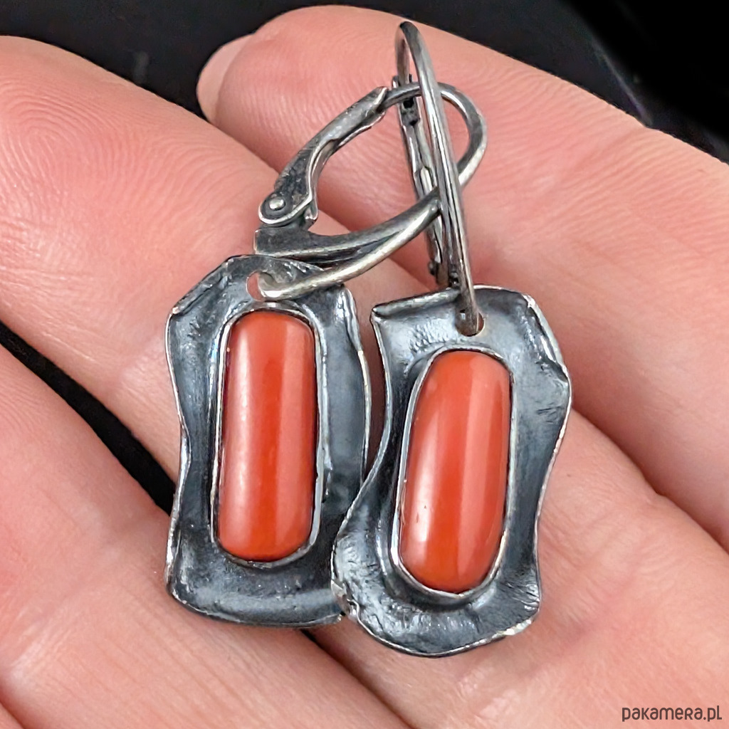 Kolczyki z oprawionymi w oksydowane srebro próby 925 koralami szlachetnymi. Oprawa ma 19 x 11 mm. Z biglami max 35 mm. Waga jednego kolczyka 2,3 grama. Kolczyki zapakowane w ozdobne pudełeczko, polecam z pierściniem do kompletu.
