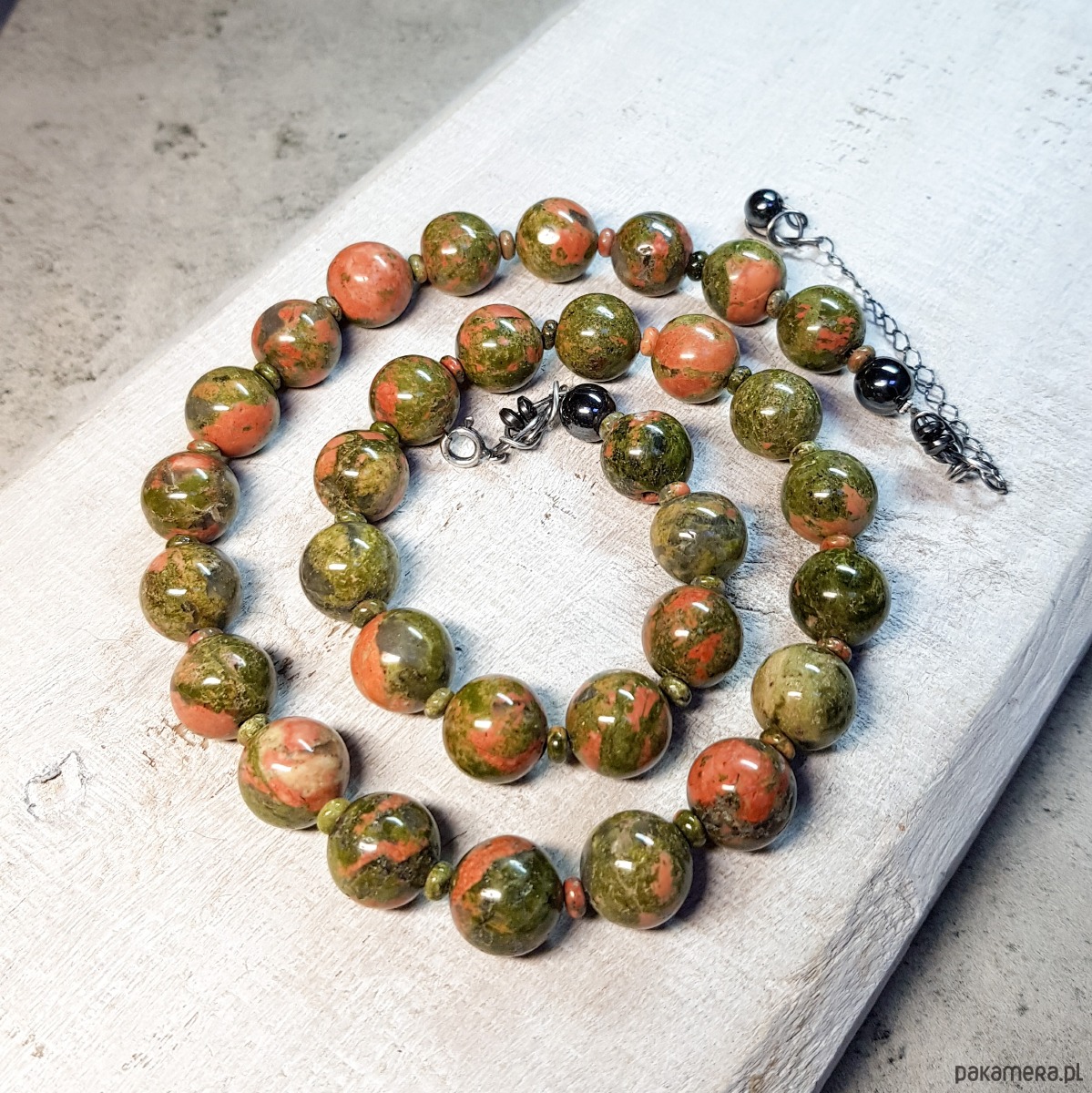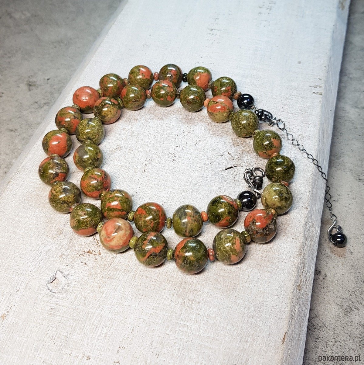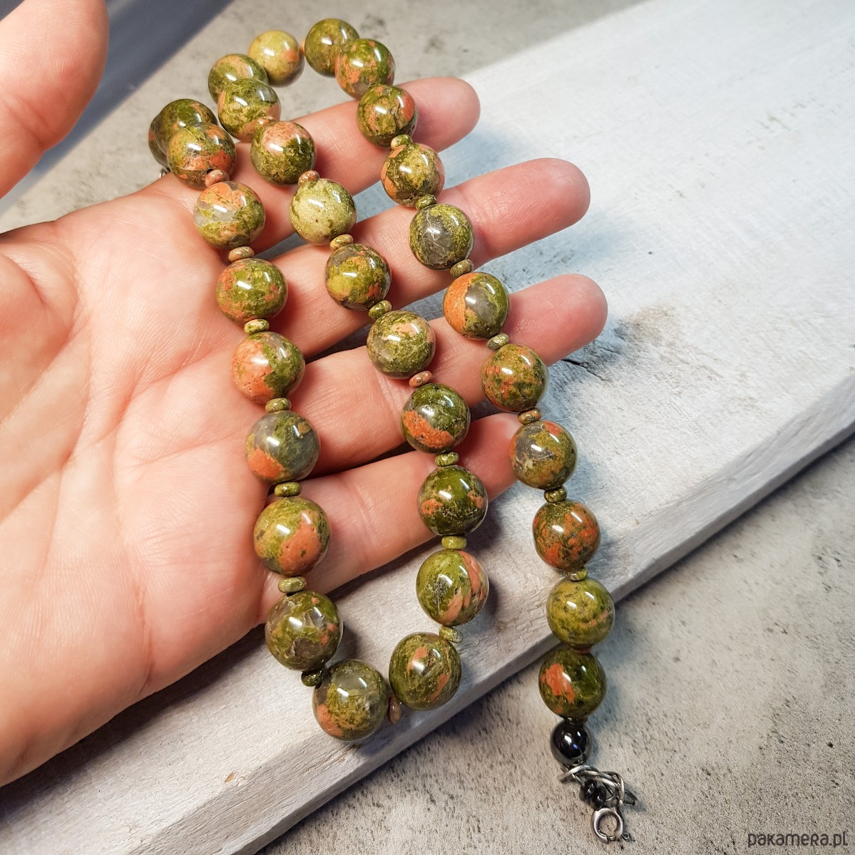 Sznur korali wykonany ręcznie z naturalnych dużych 12mm unakitu. Wykończenia i zapięcie wykonane w srebrze 925, oksydowanym i wypolerowanym. Długość korali wynosi ok. 52cm plus przedłużka 5cm.