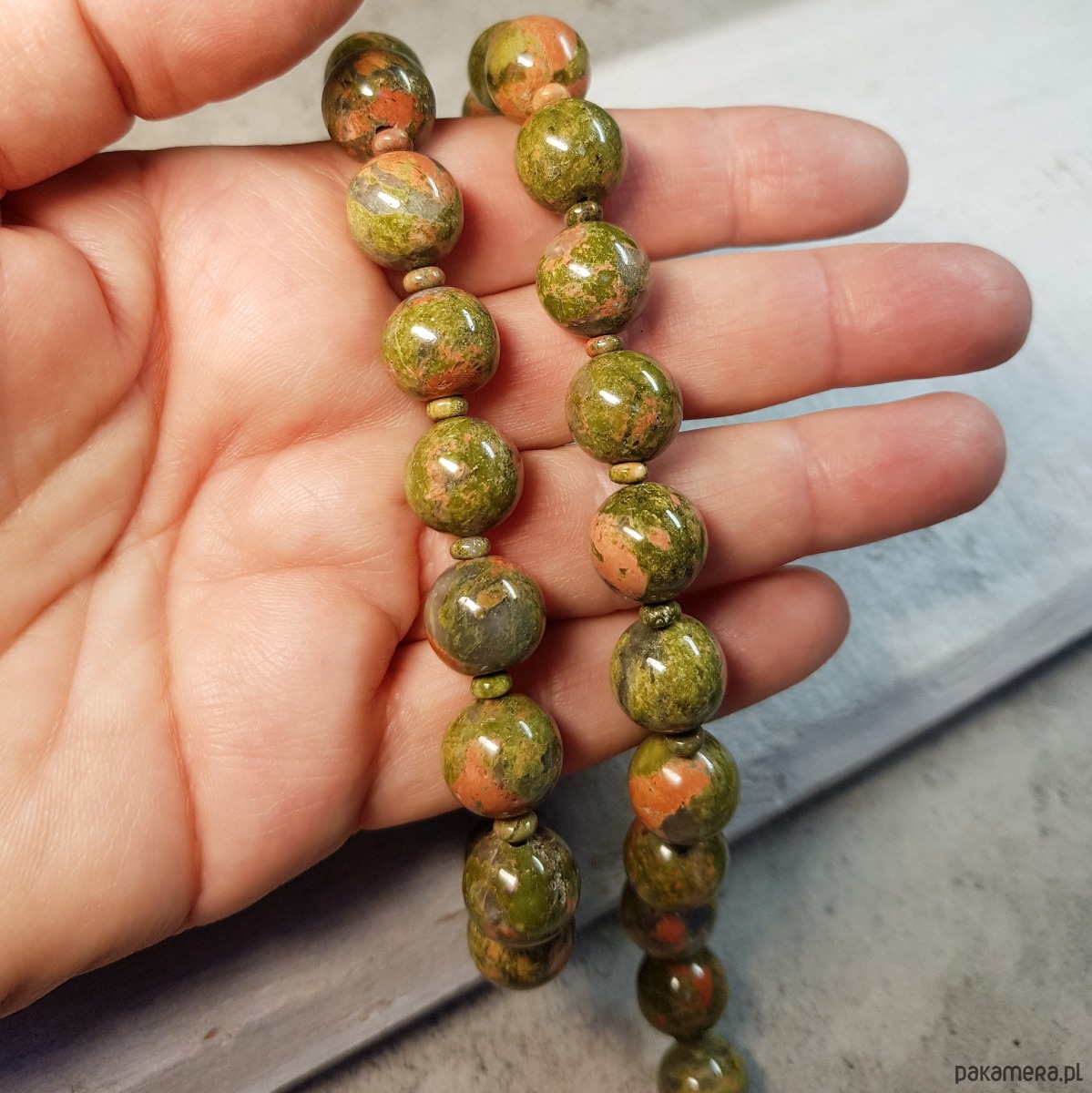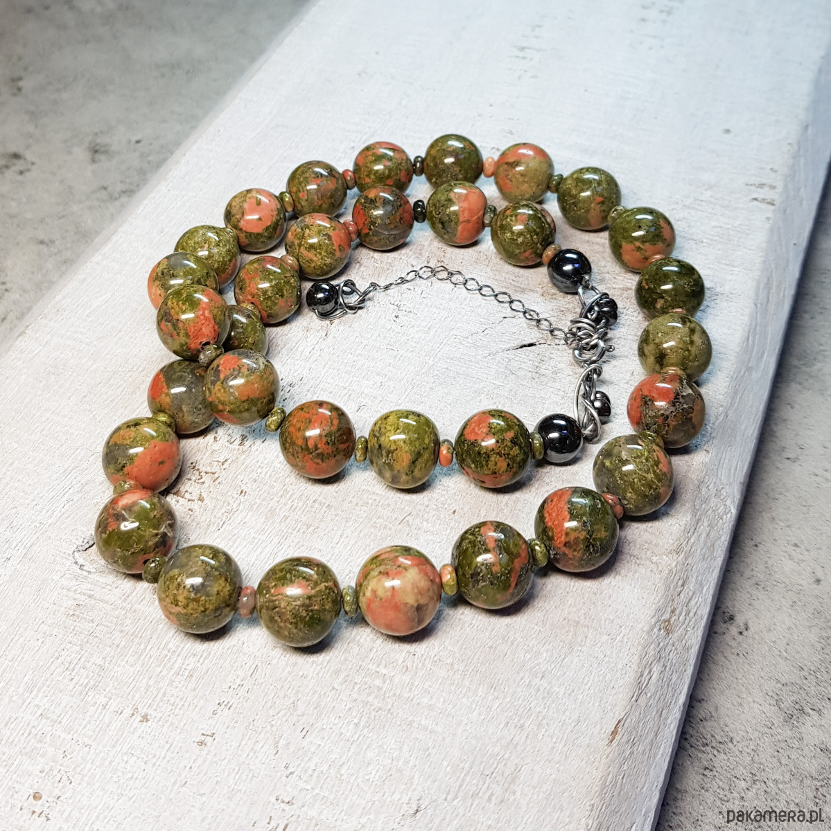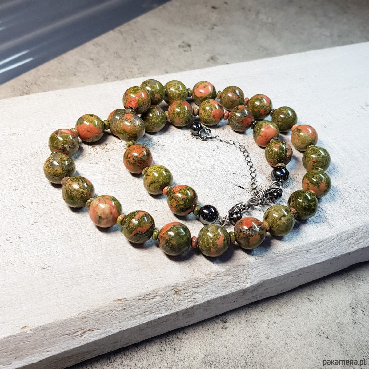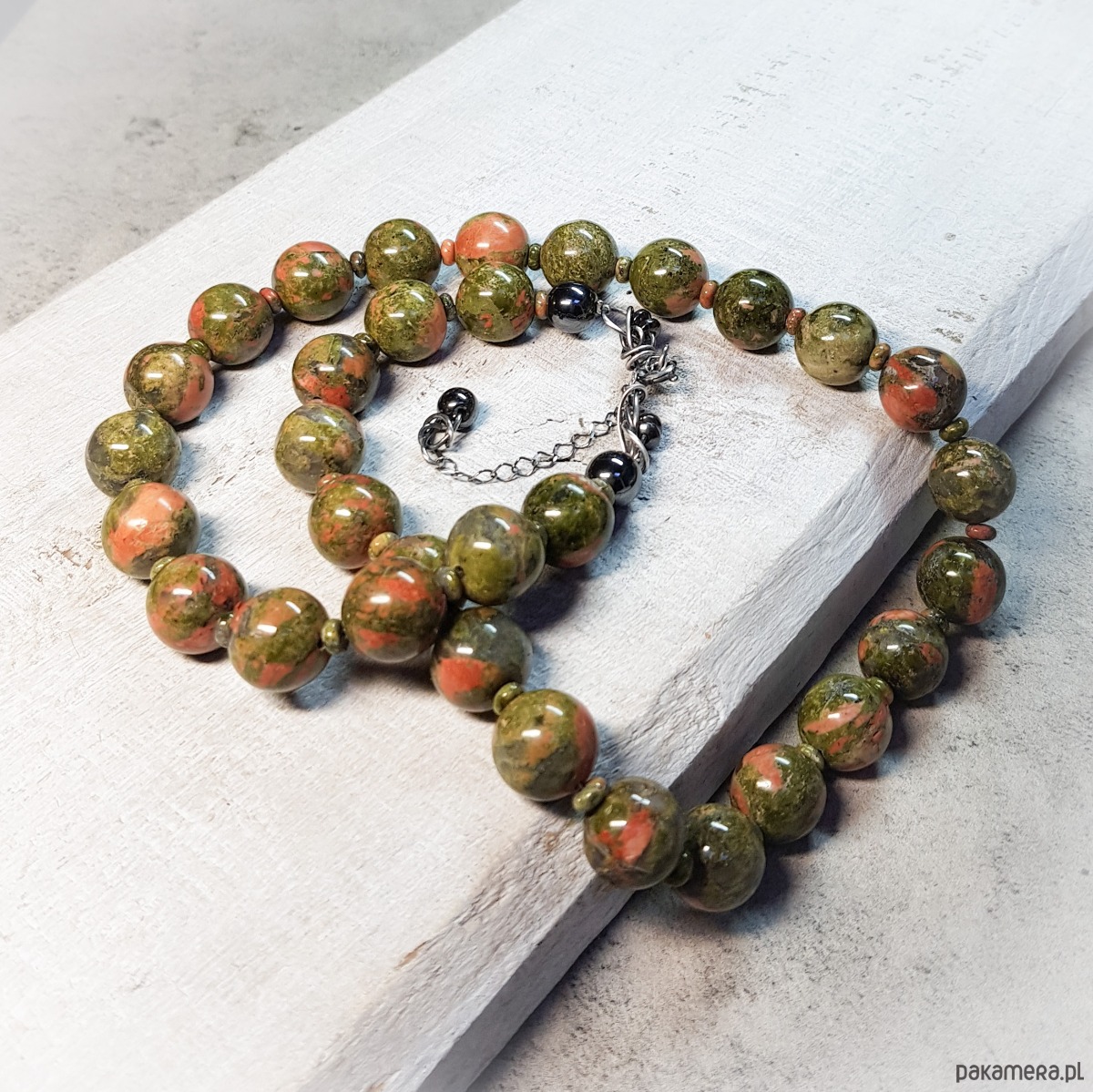 Sznur korali wykonany ręcznie z naturalnych dużych 12mm unakitu. Wykończenia i zapięcie wykonane w srebrze 925, oksydowanym i wypolerowanym. Długość korali wynosi ok. 52cm plus przedłużka 5cm.