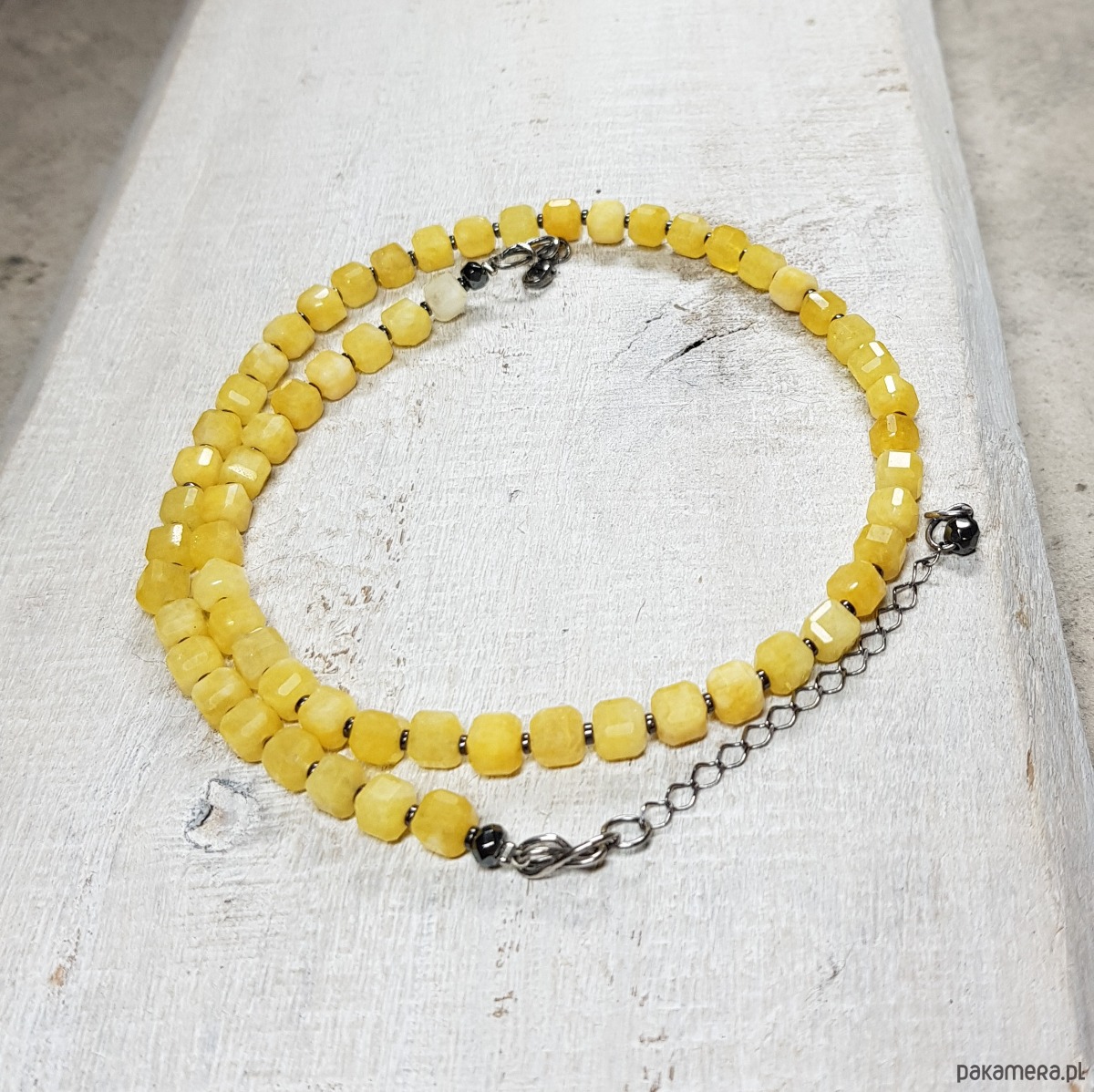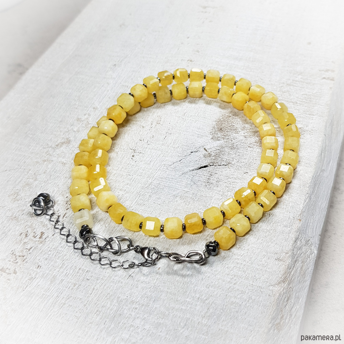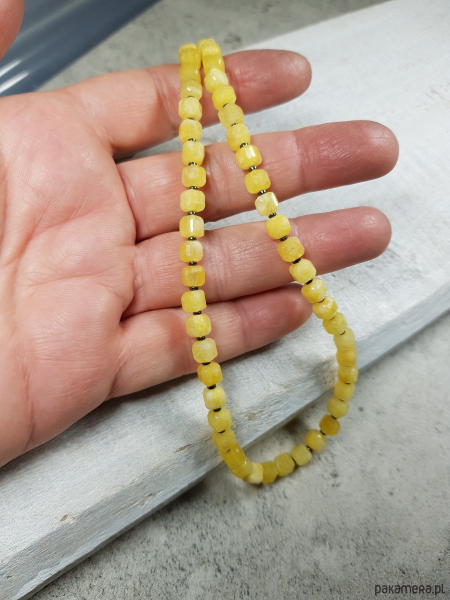 Sznur korali wykonany z fasetowanych kostek 5mm jaspisu w ciekawym mleczno żółtym kolorze i przekładek hematytu. Zapięcie wykonane w srebrze 999 i 925.