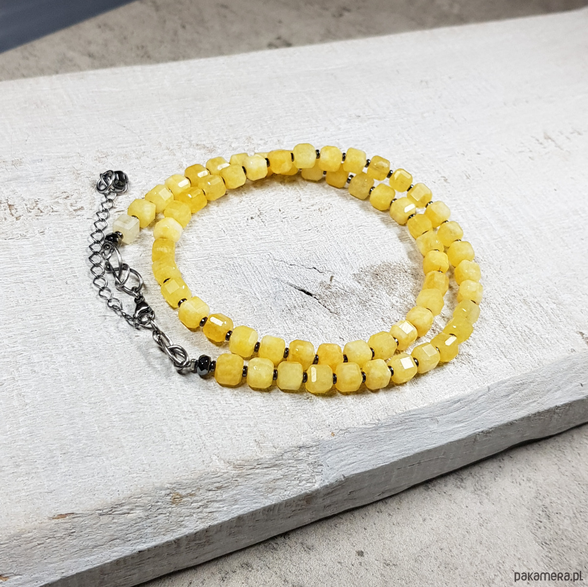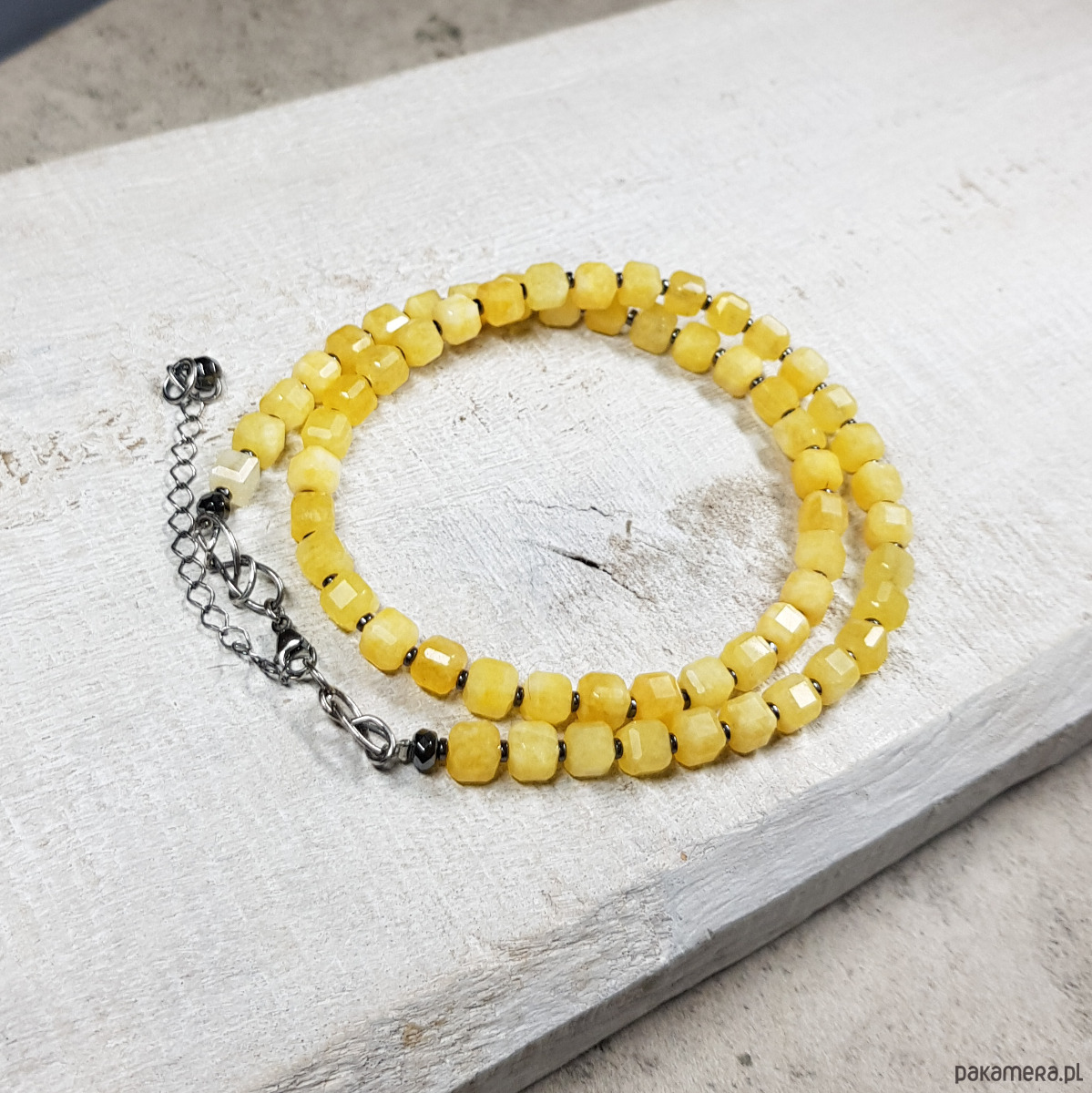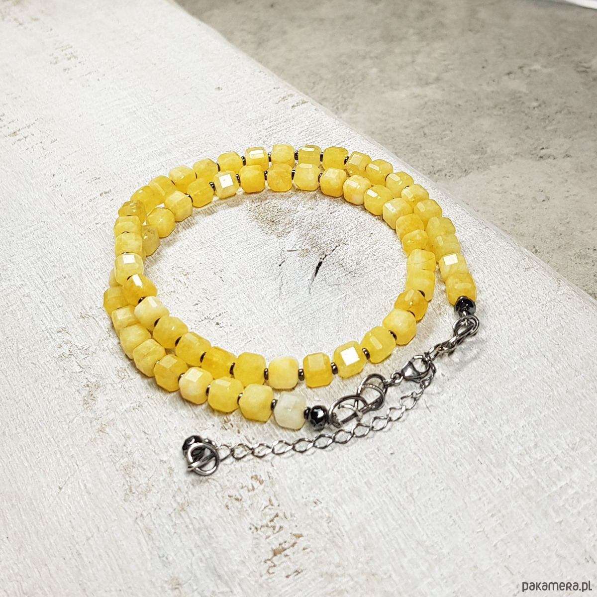 Sznur korali wykonany z fasetowanych kostek 5mm jaspisu w ciekawym mleczno żółtym kolorze i przekładek hematytu. Zapięcie wykonane w srebrze 999 i 925.