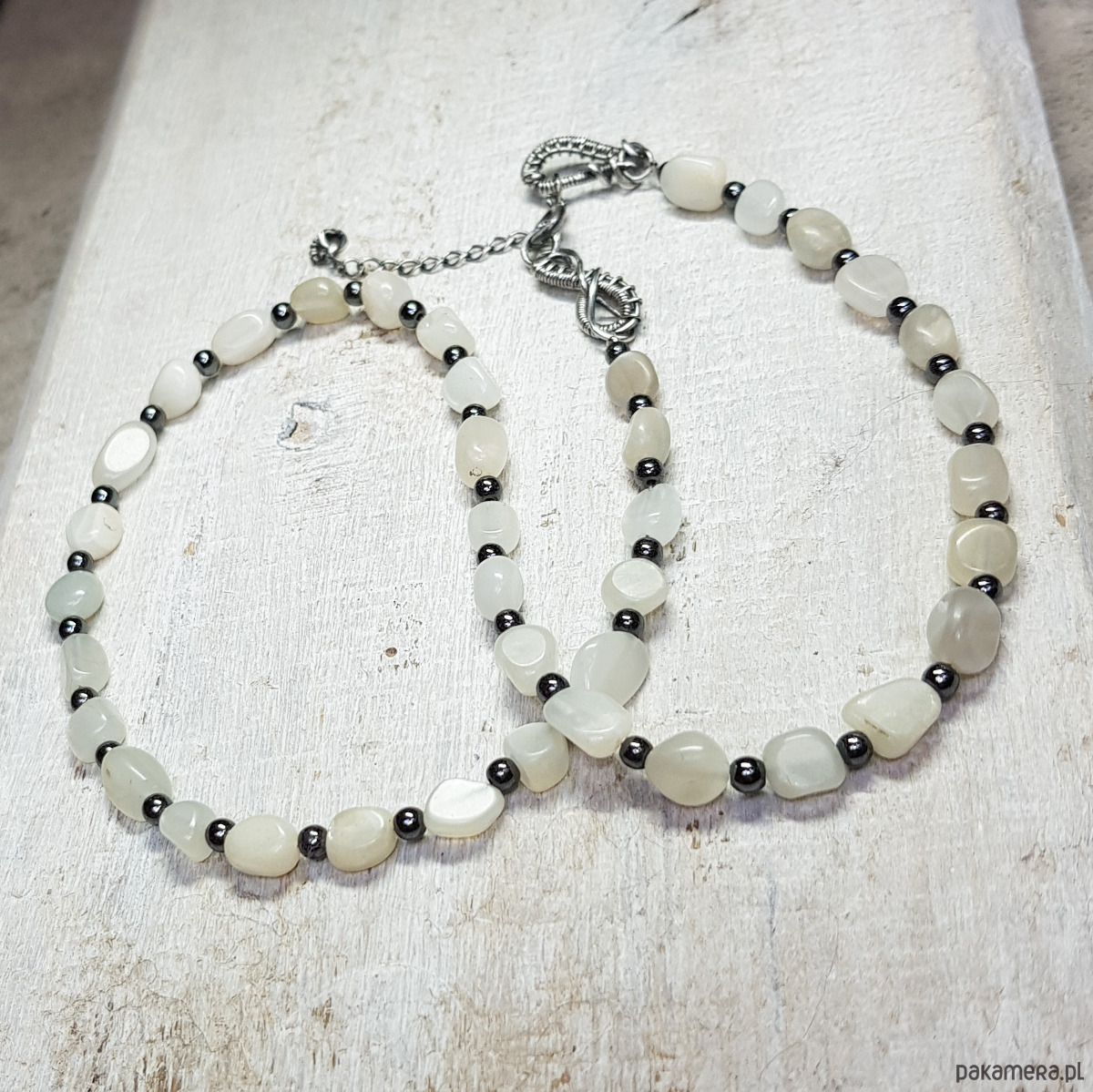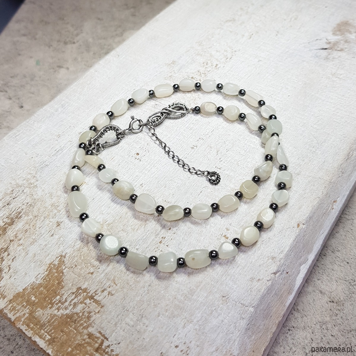 Sznur korali wykonany z nieregularnych bryłek 6-8mm kamienia księżycowego i przekładek hematytu. Wykończenia i zapięcie wykonane w srebrze 999 i 925, oksydowanym i wypolerowanym. Długość korali wynosi 45 cm plus przedłużka 3,5 cm.