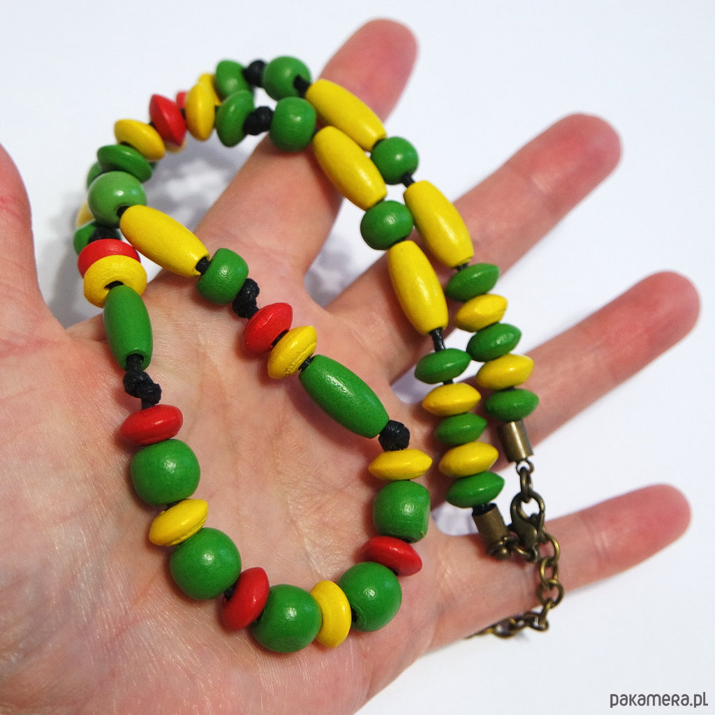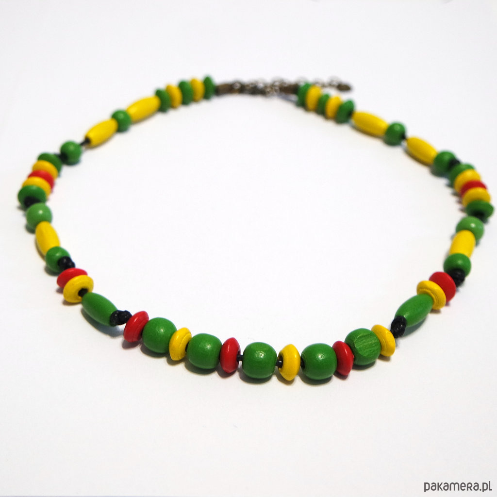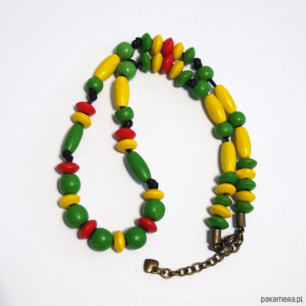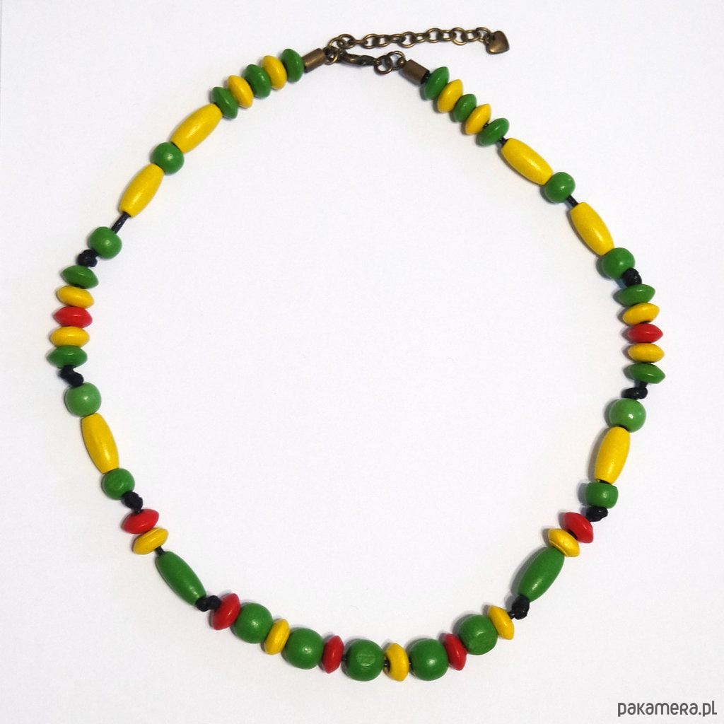 Naszyjnik wykonany z koralików drewnianych nawleczonych na woskowany sznurek.