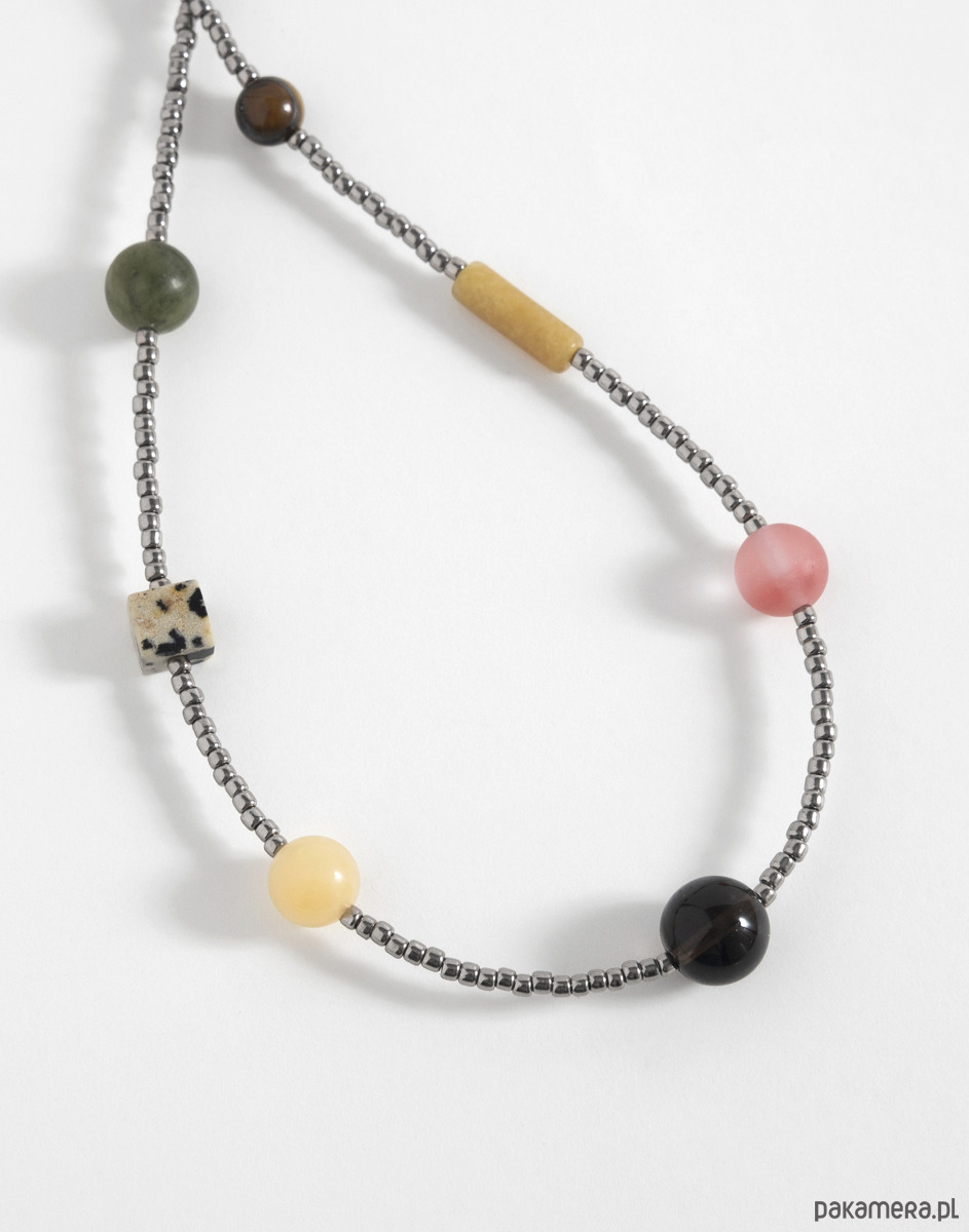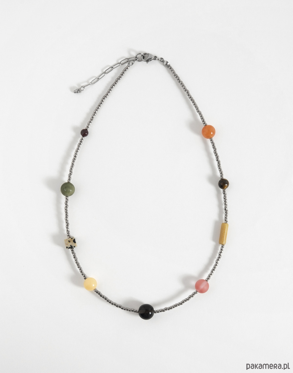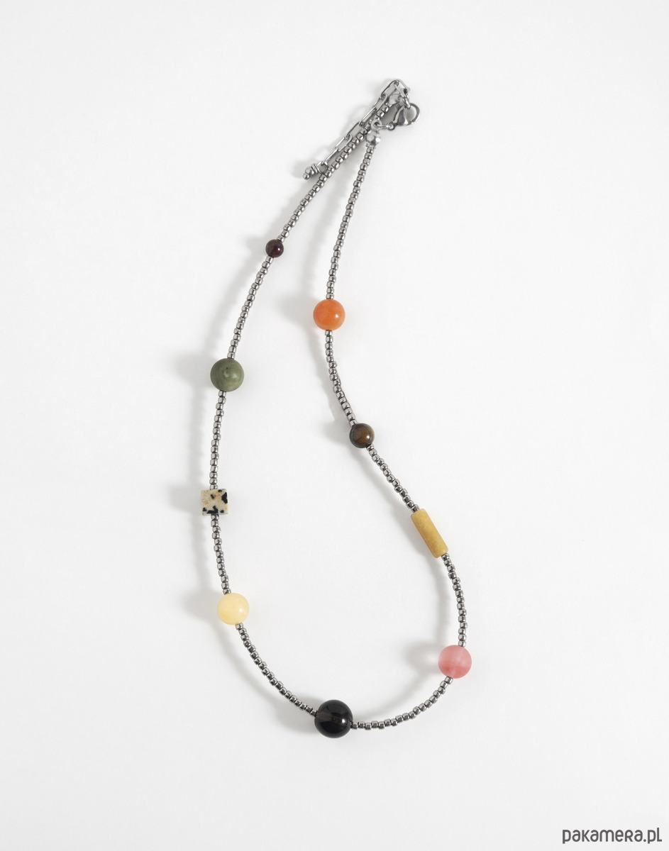 Naszyjnik wykonano ze srebrnych japońskich koralików TOHO, pomiędzy którymi przeplatają się kamienie naturalne o różnych wielkościach.