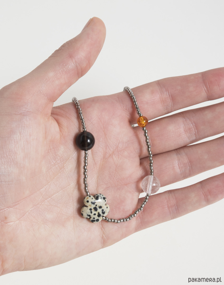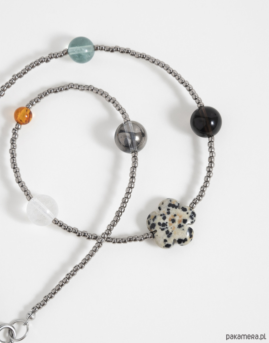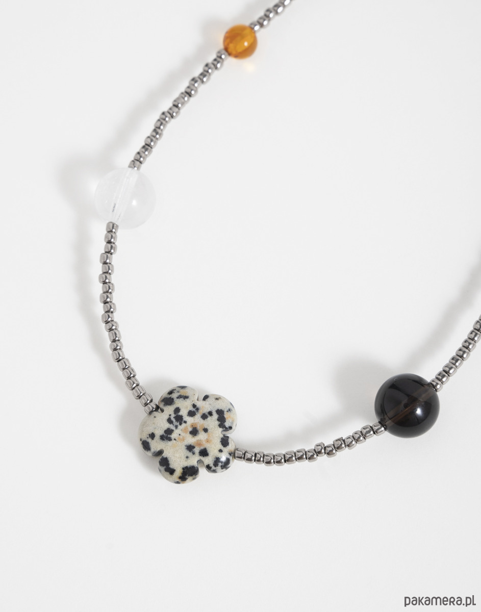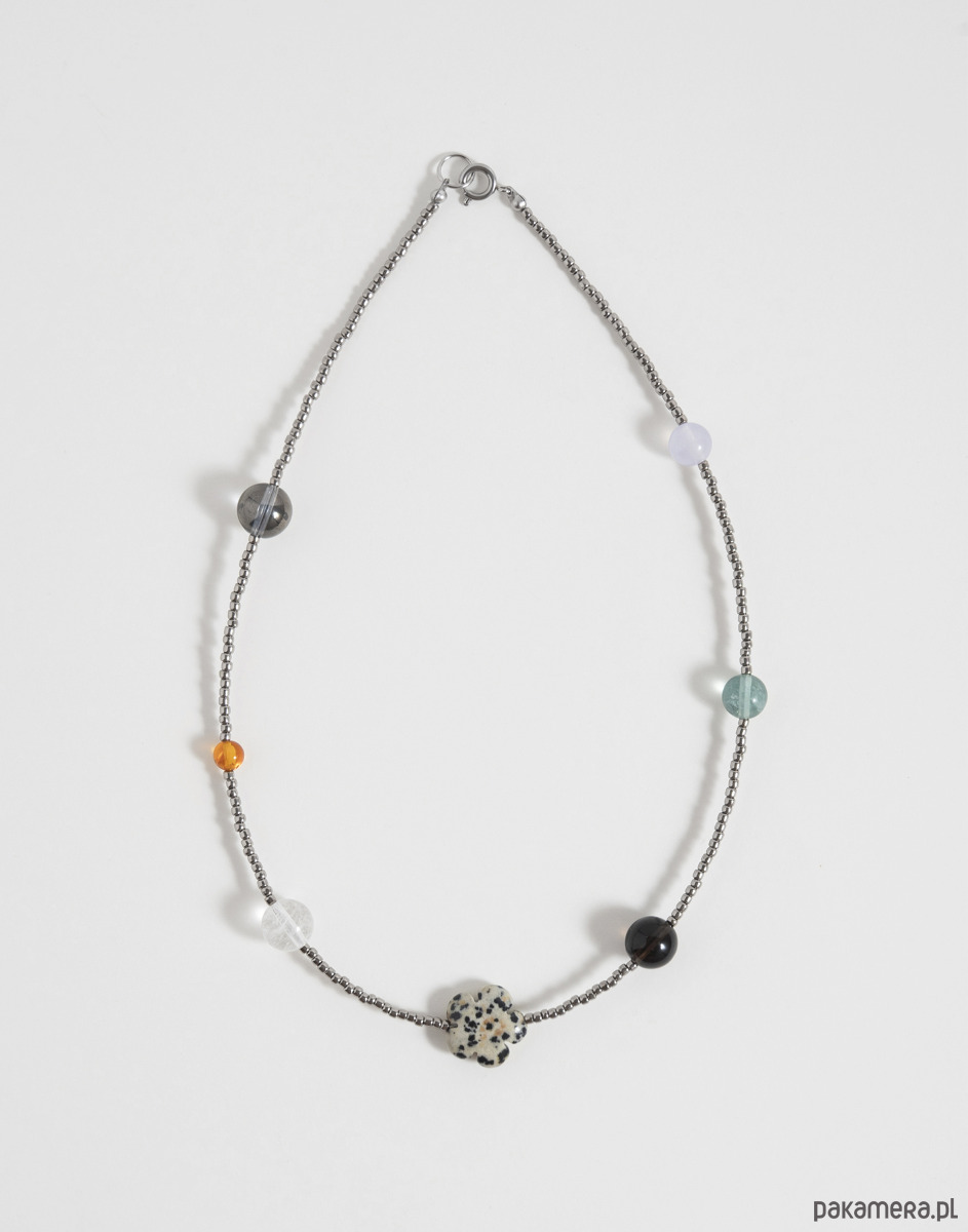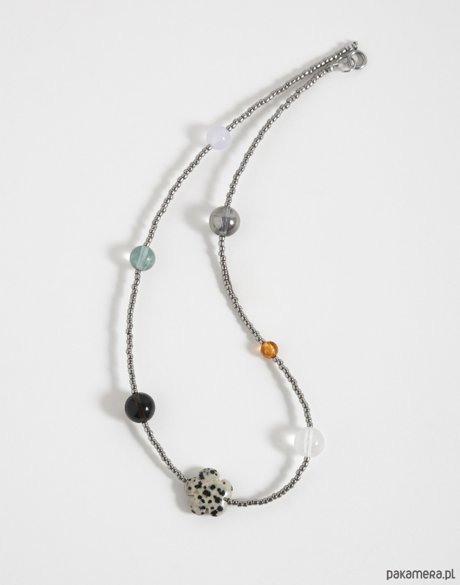 Naszyjnik wykonano ze srebrnych japońskich koralików TOHO, pomiędzy którymi przeplatają się okrągłe kamienie naturalne. Całość zdobi koralik w kształcie kwiatka, wykonany z jaspisu dalmatyńskiego.