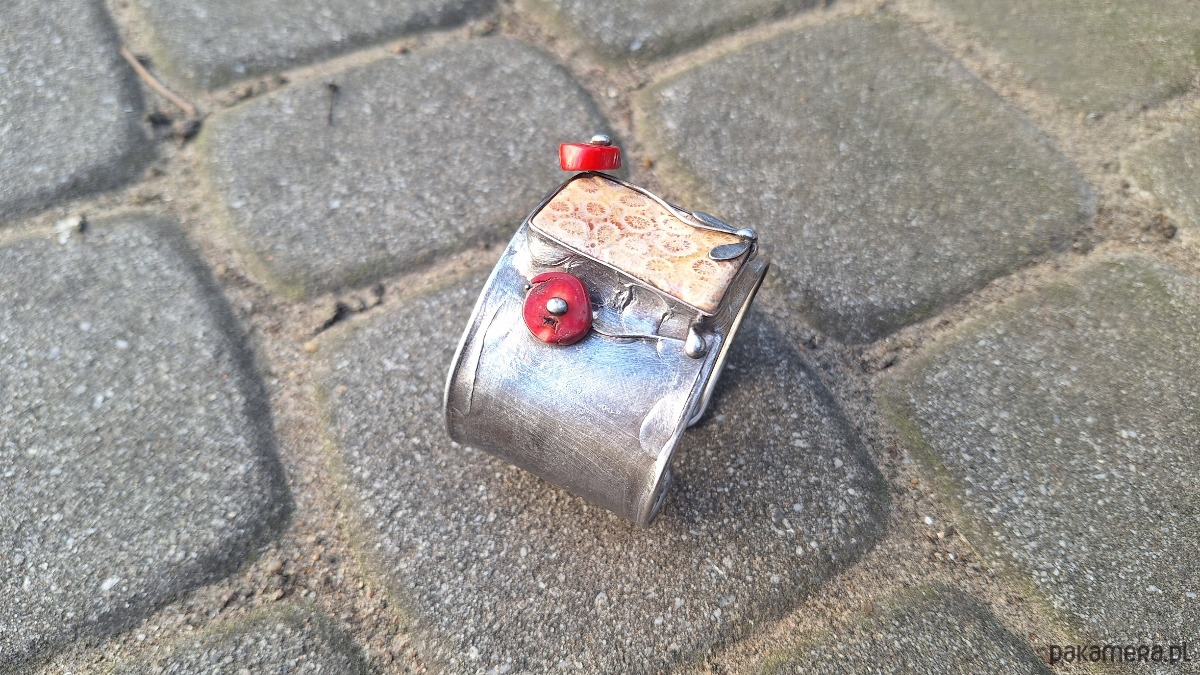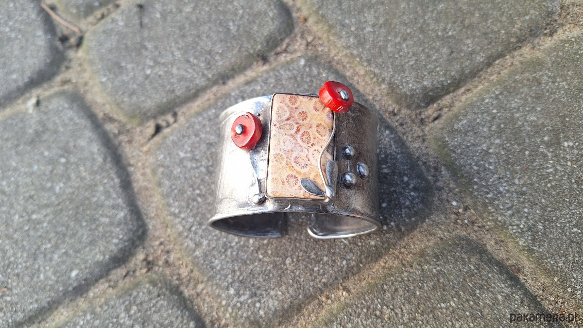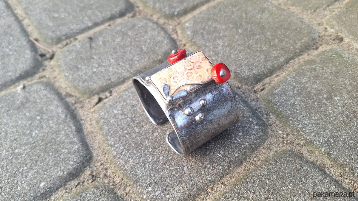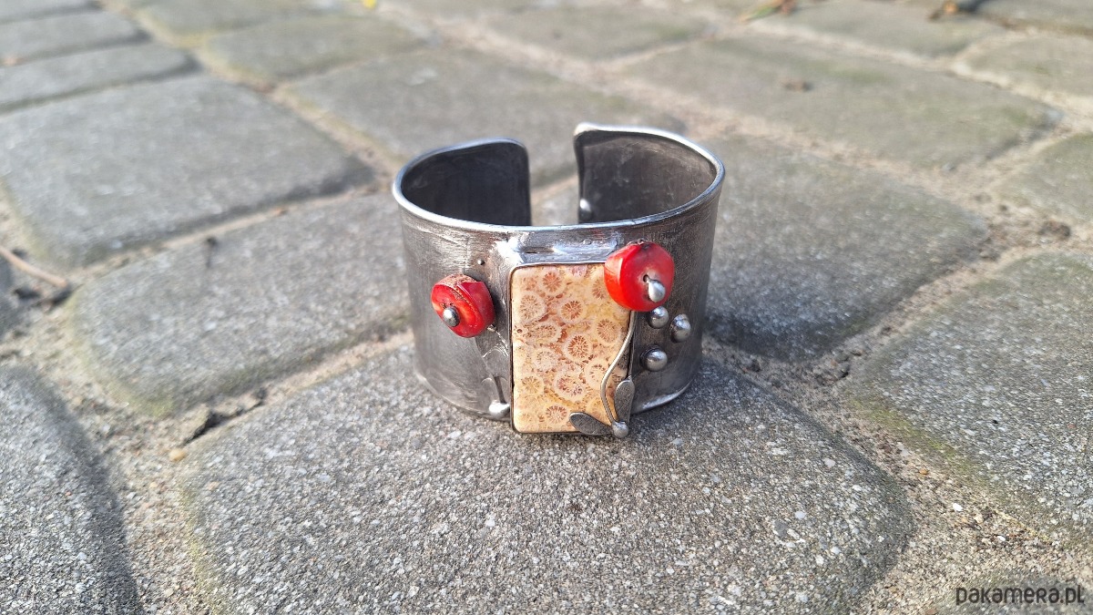 Bransoletka wykonana z miedzi, cyny i koralowców. Szerokość ok. 4.3 cm. Regulowana.