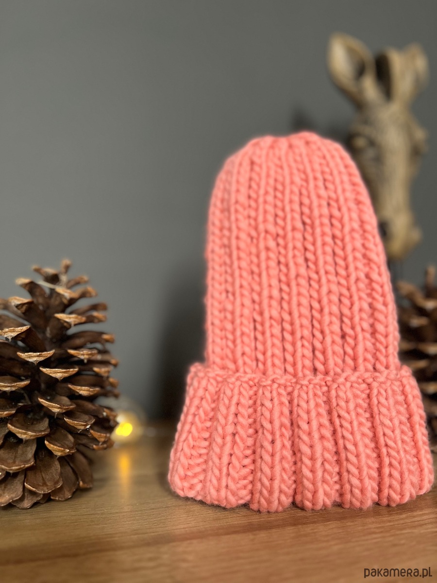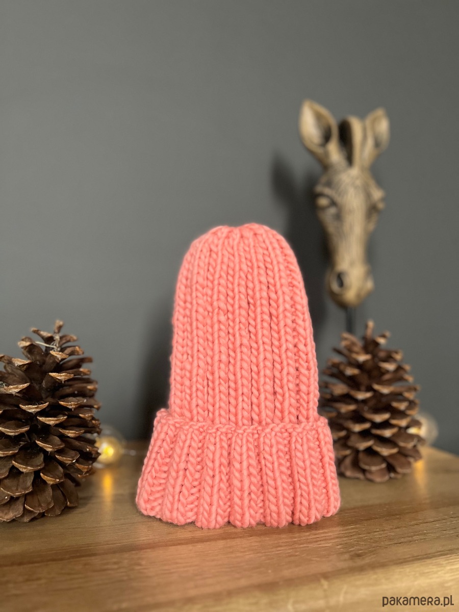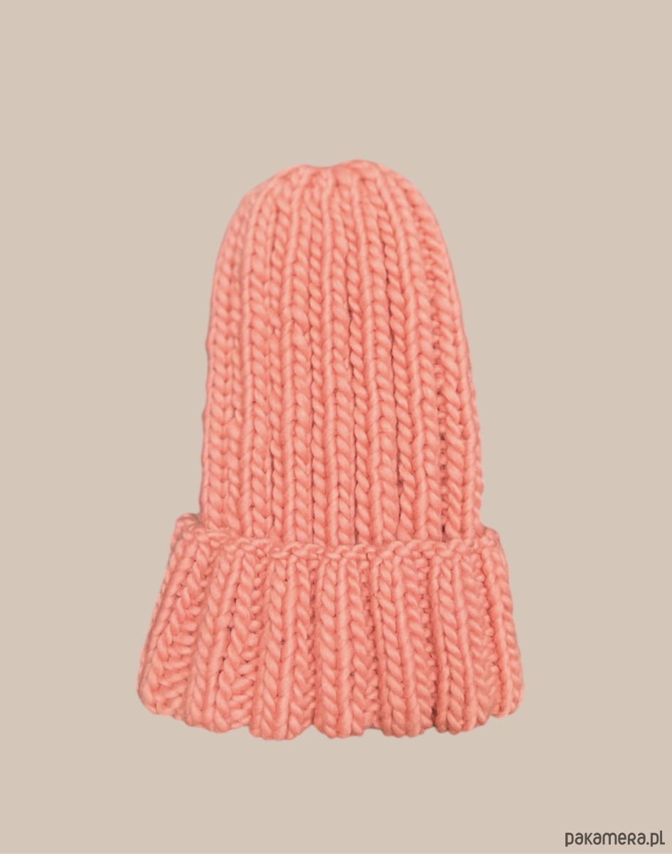 Czapka w kolorze rozbielonego koralu, wykonana z naturalnej włóczki 100% wełna