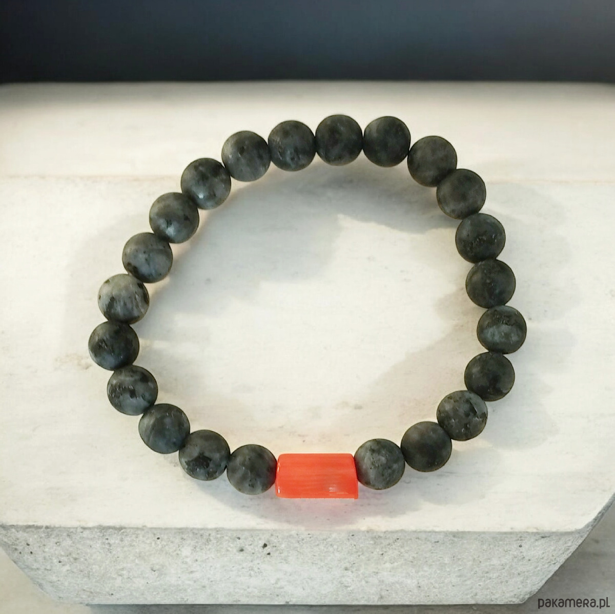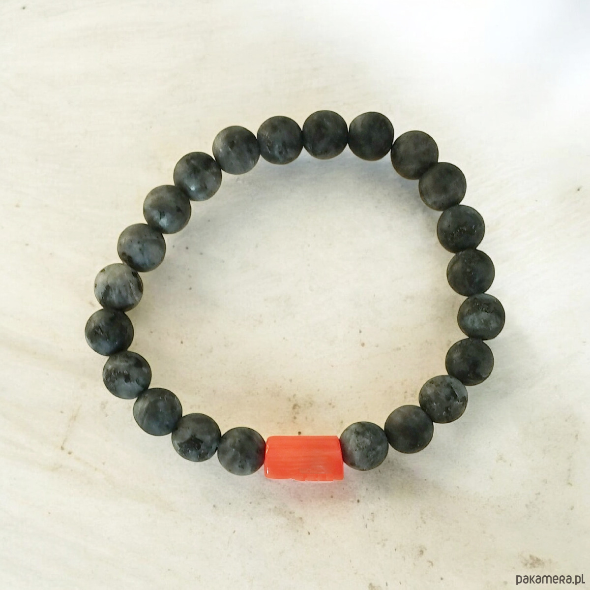 koral łososiowy 13x8 mm, larvikit matowe kulki 8 mm, solidna gumka