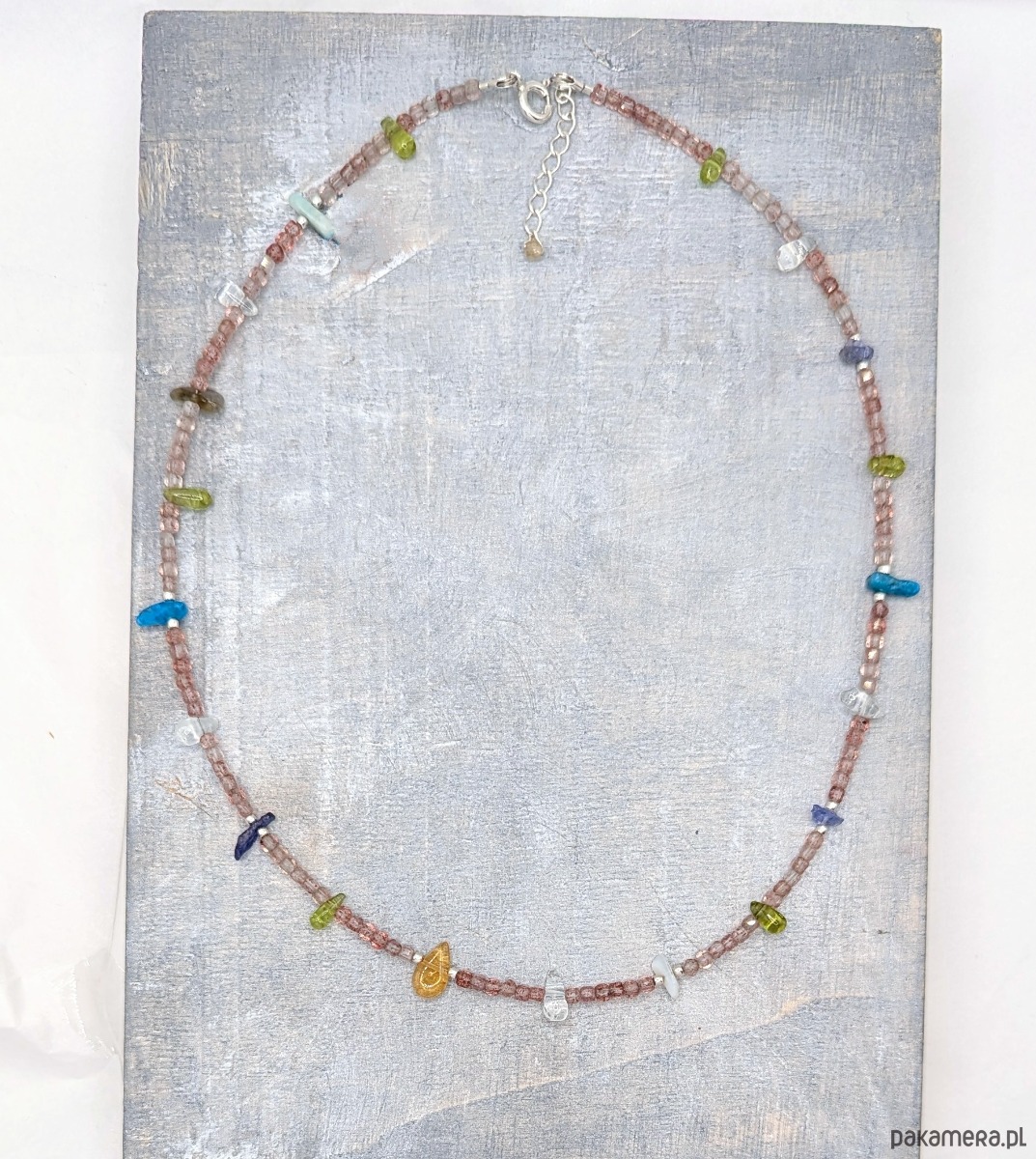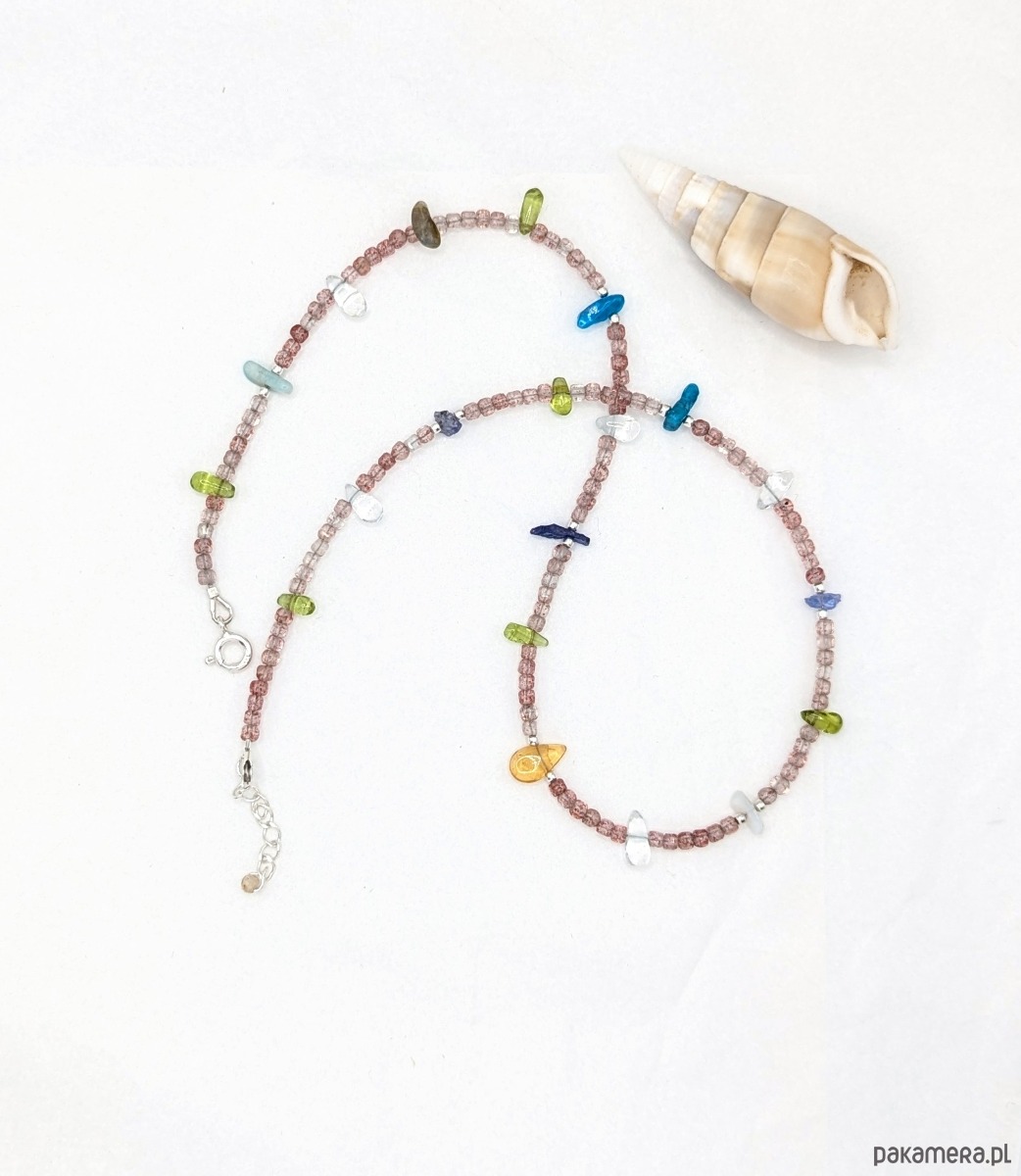 Naszyjnik wykonany z z wielu kolorowych kamieni i srebra. Idealny dla wielbicielek minerałów. Znajduje się tu aż osiem ich rodzajów: bazą jest kwarc truskawkowy, a pomiędzy umieszczone zostały nieregularne bryłki kamieni naturalnych: tanzanit, oliwin, akwamaryn, apatyt, cytryn, amazonit, labradoryt. Kamyki są barwne jak podświetlone morskie koralowce. Bardzo pozytywny i kreatywny.