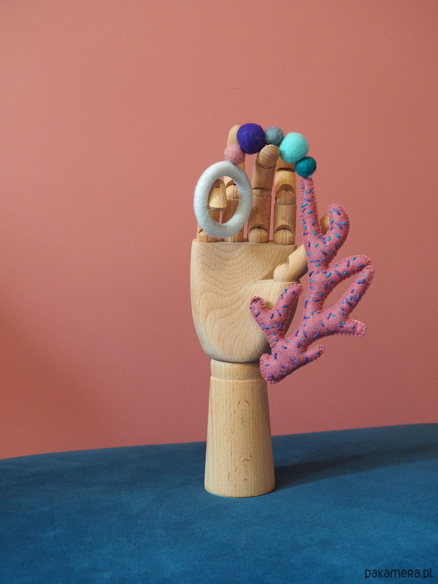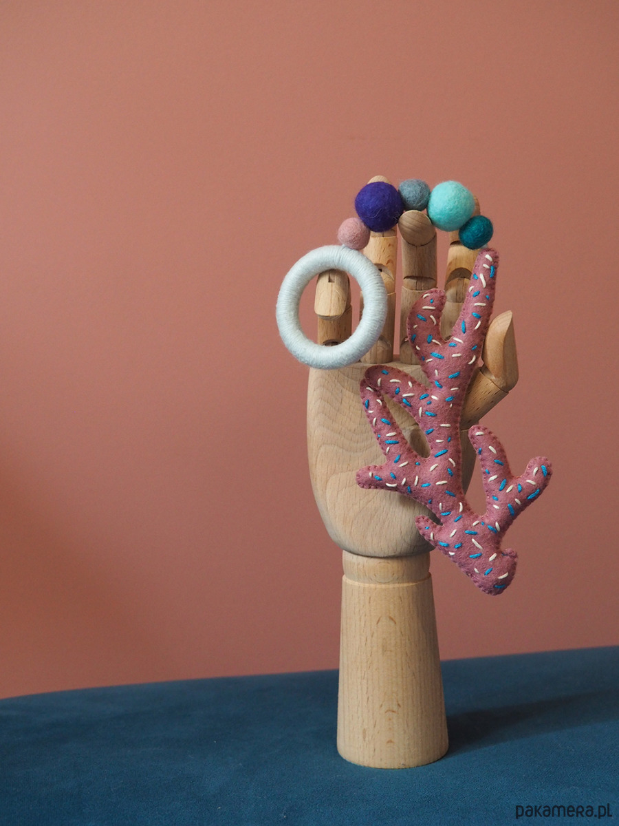 -wielkość koralowca: ok. 16 cm x 10 cm, pomponowy sznur z gryzakiem o długości 14 cm