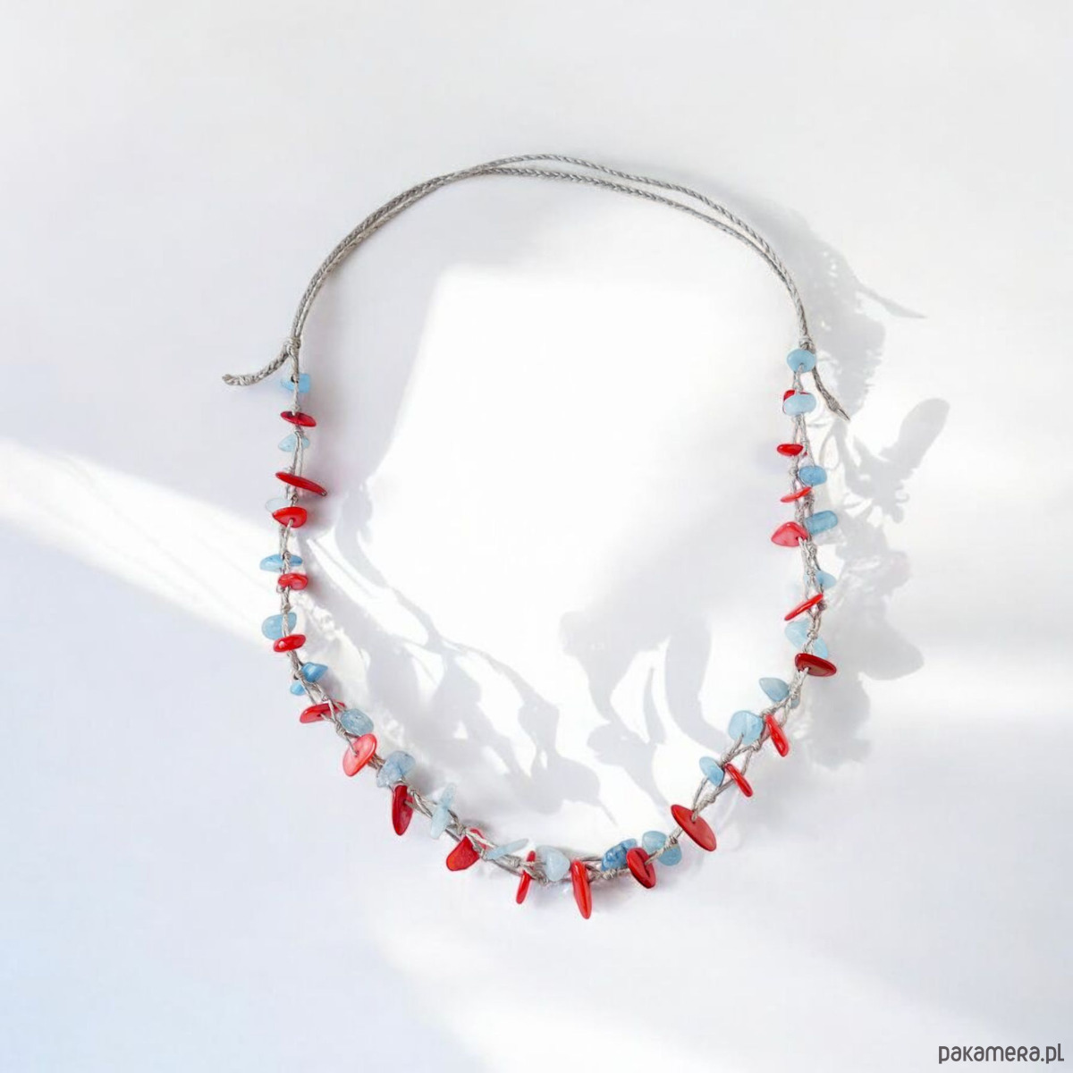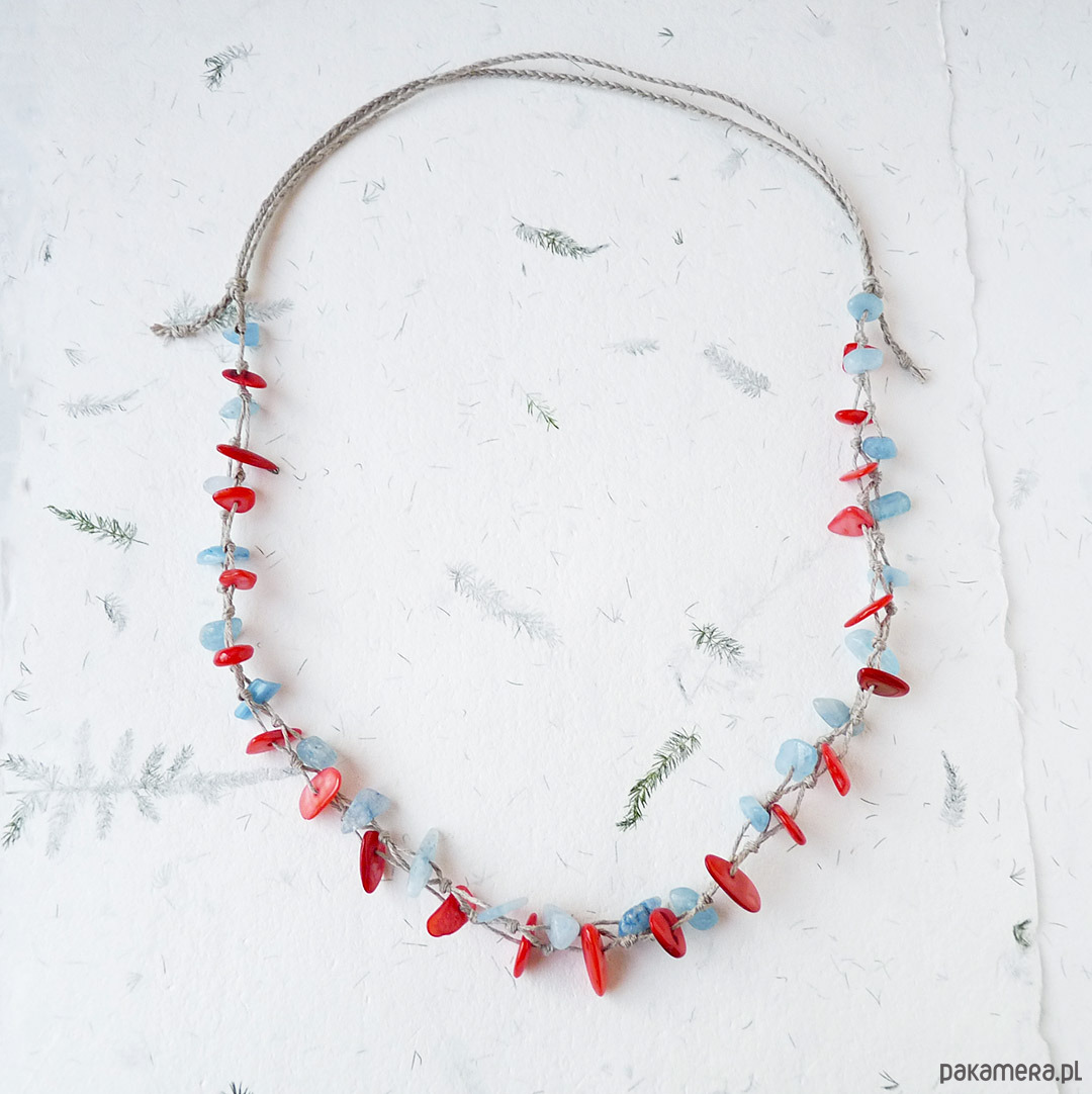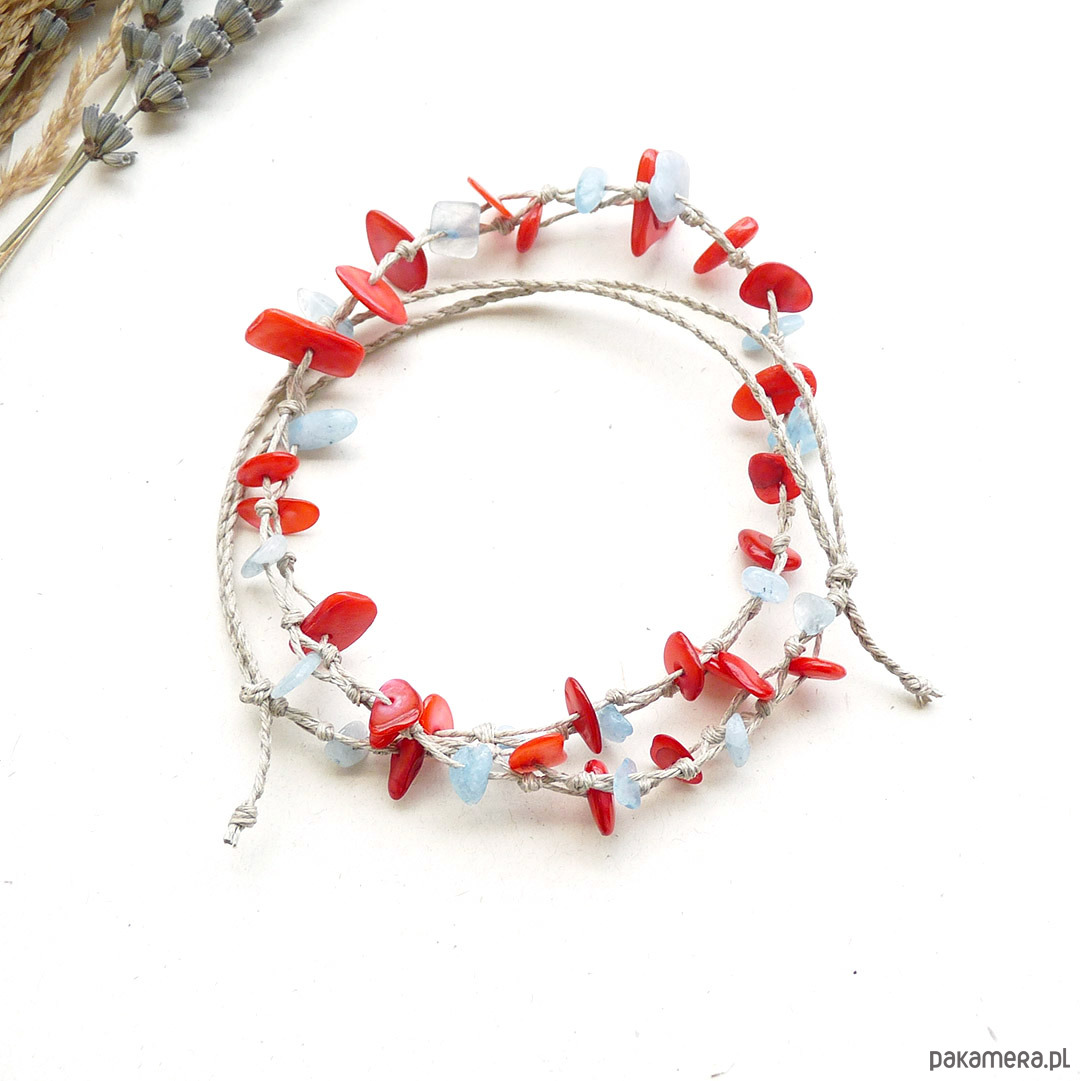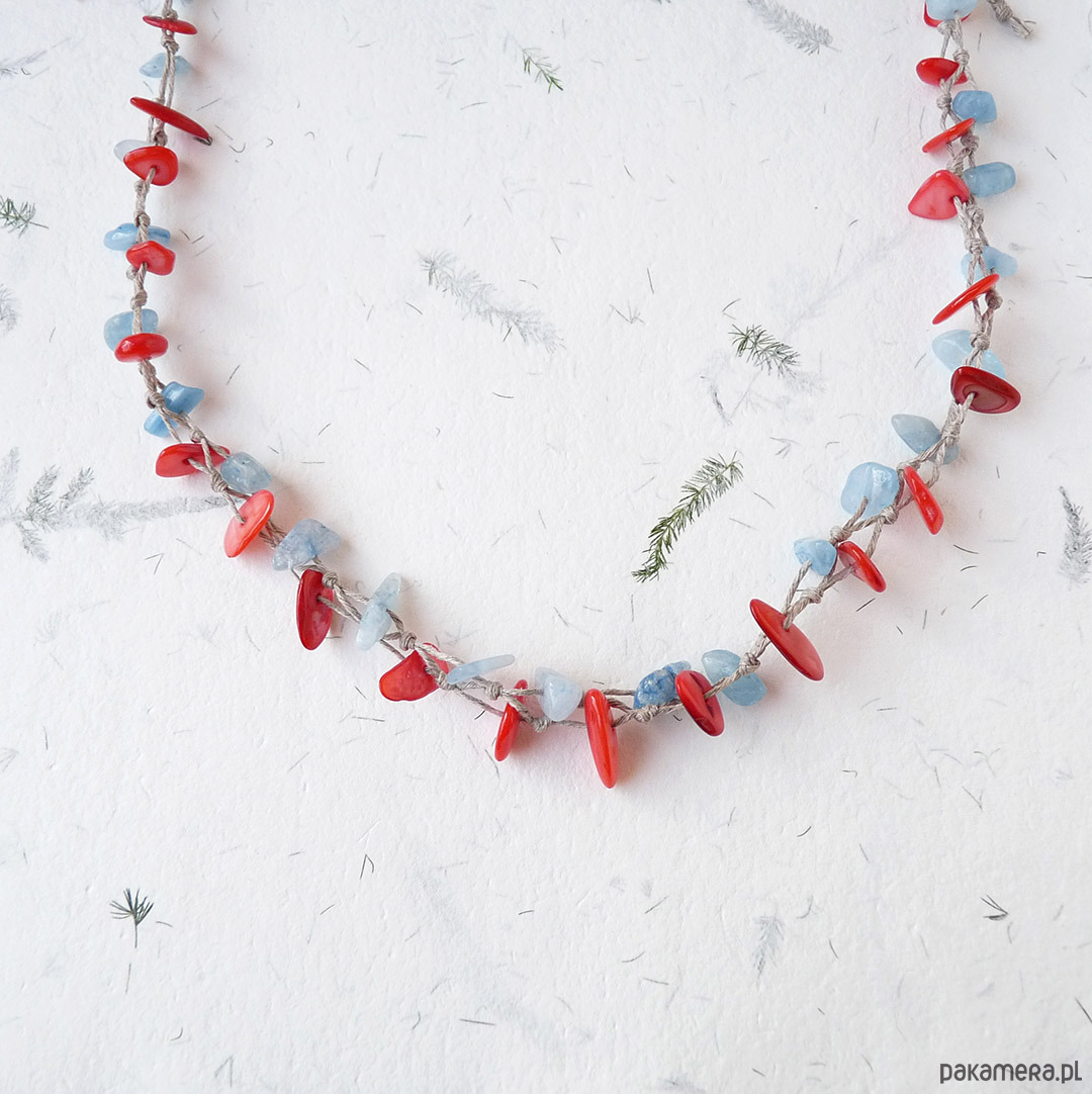 len naturalny, masa perłowa w kolorze koralowym, akwamaryn