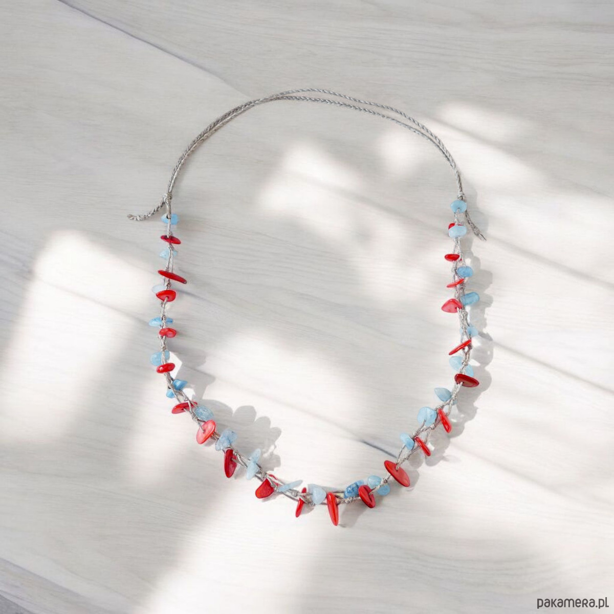 Kamienie jasnoniebieskiego akwamarynu pięknie komponują się z masa perłowa w kolorze korala