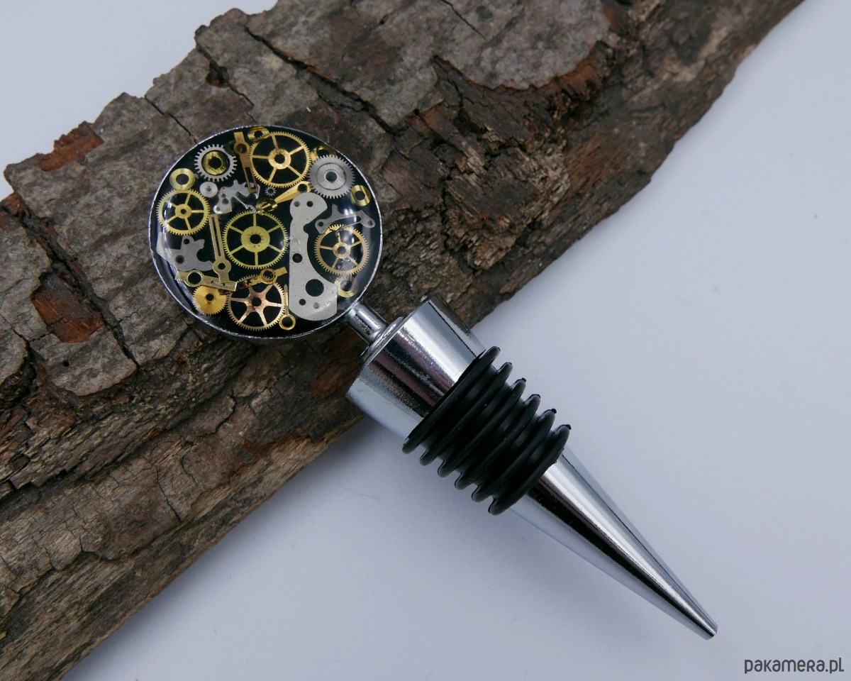 Oto niezwykły korek w stylu steampunk, który łączy funkcjonalność z unikatowym wzornictwem. Pasuje do każdej butelki, a jego niezwykły charakter kryje się w detalach – w metalowej oprawie i silikonowym uszczelnieniu zaklęto elementy mechanizmu zegarka, zatopione w krystalicznej żywicy epoksydowej.