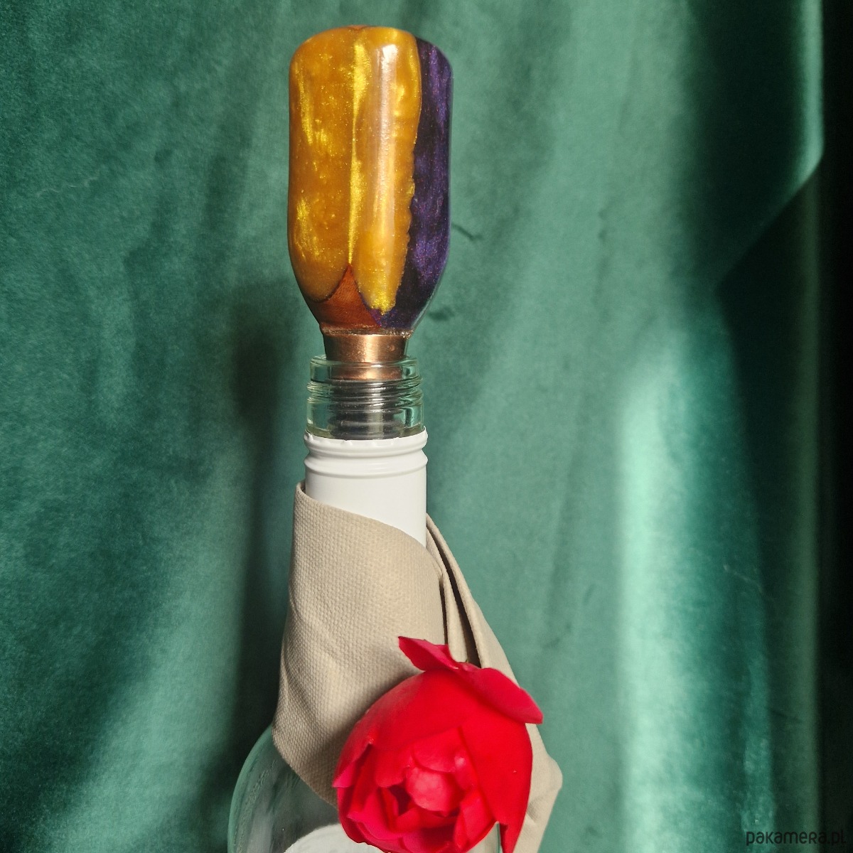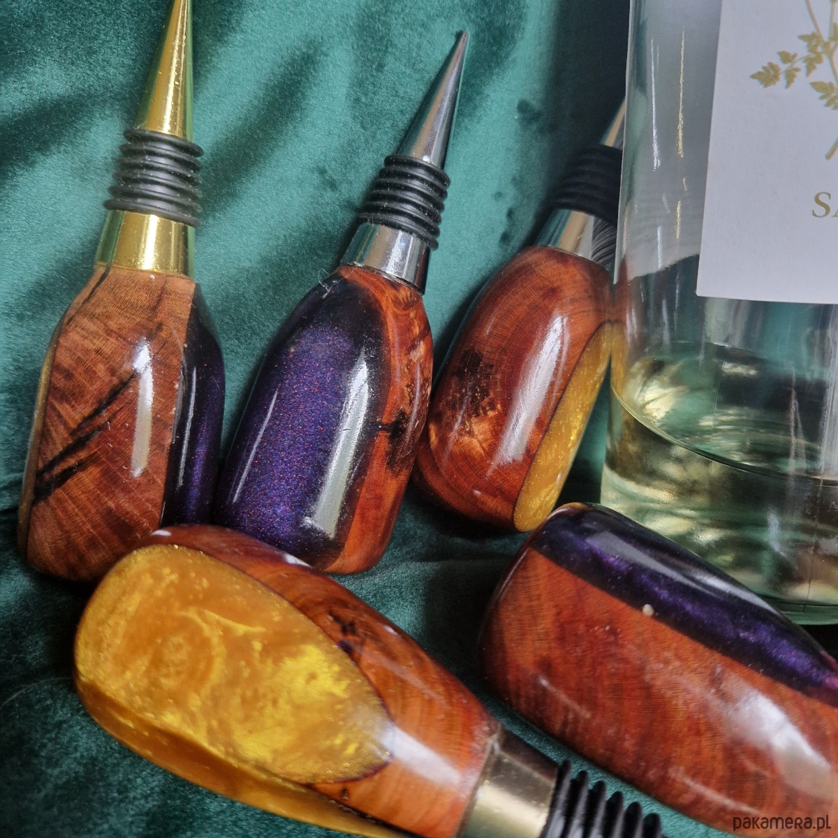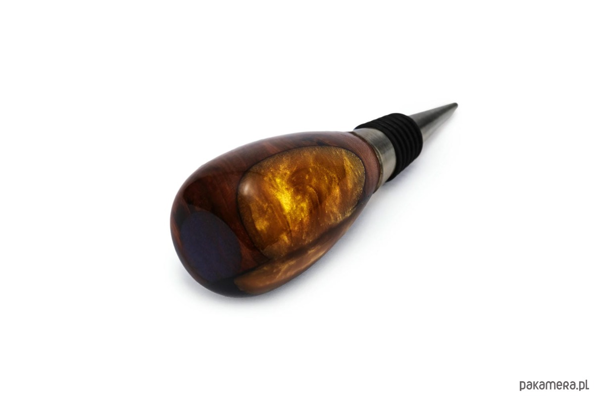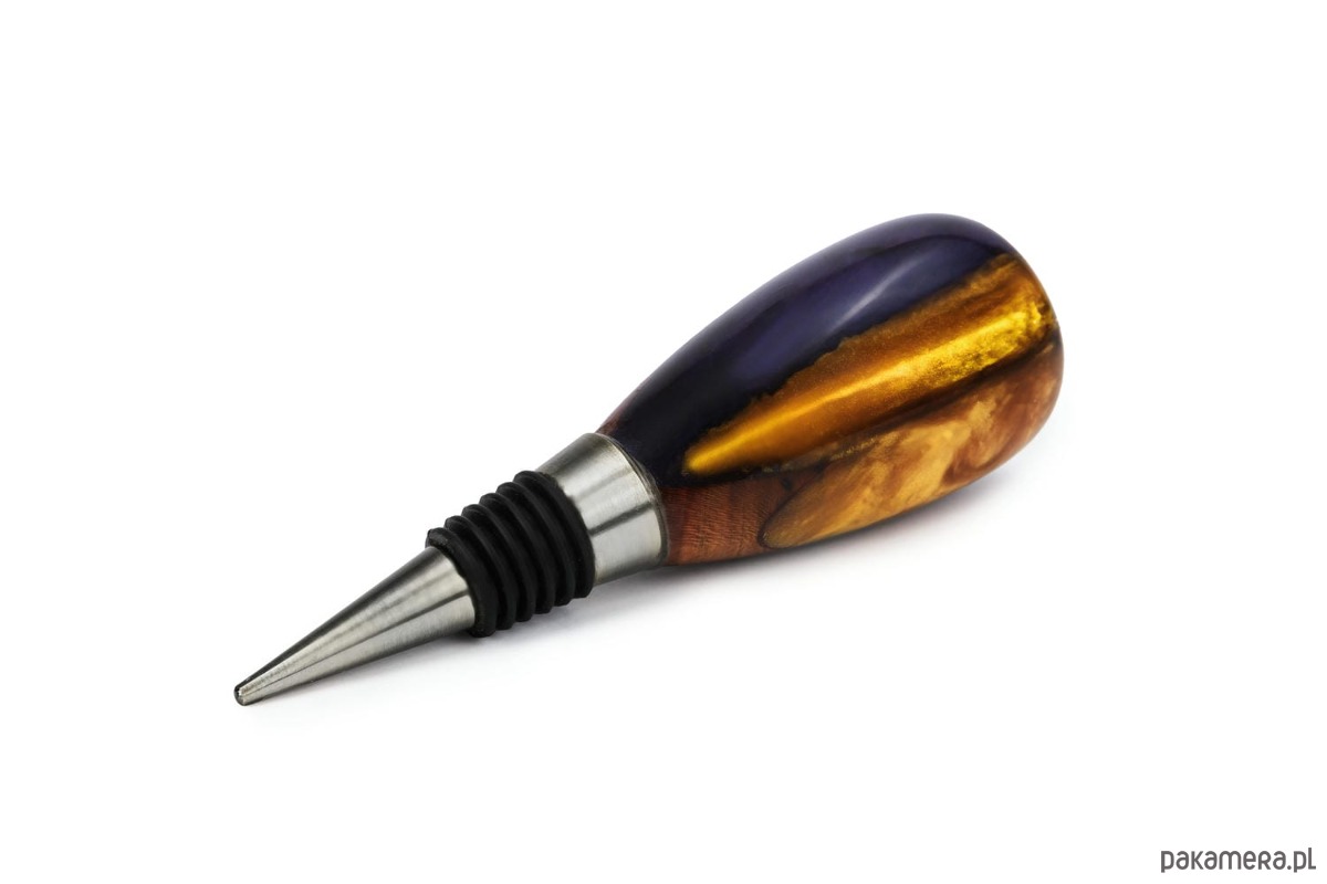 Ten korek, wykonany z kawałków tajemniczego drewna egzotycznego z odzysku, łączy bogate, naturalne tekstury z wirującym złotem i głęboką fioletową żywicą epoksydową. Rezultat jest odważny, przyjemny w dotyku i elegancki. Mały, ale efektowny, pokazuje, że dbasz o swoje wino i jego prezencję.