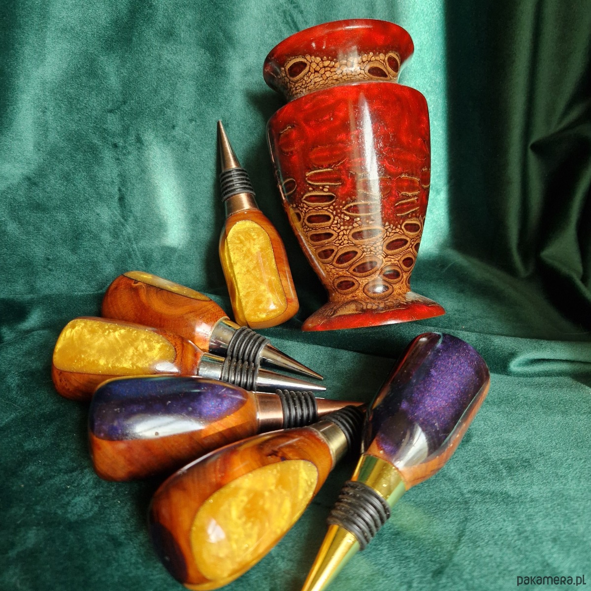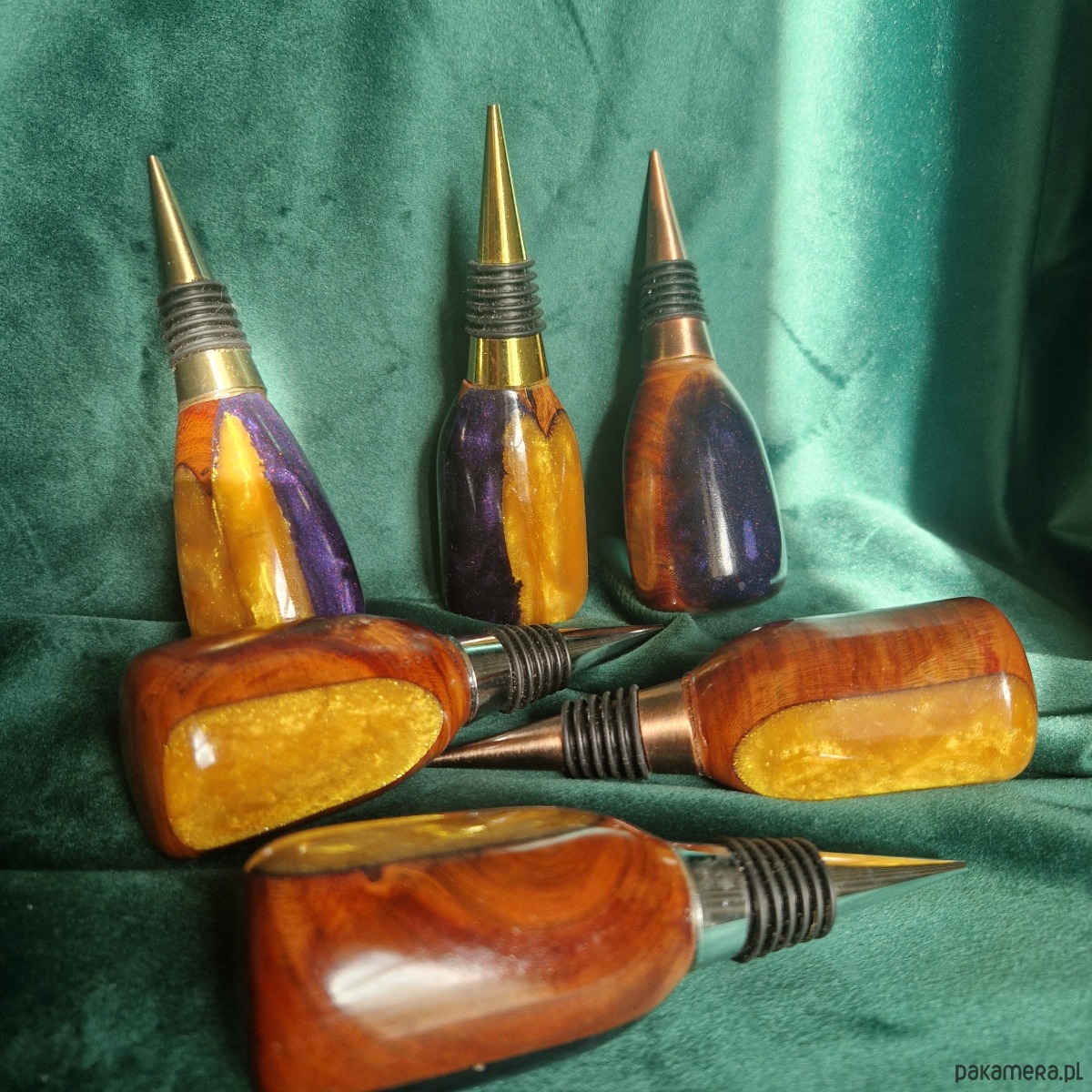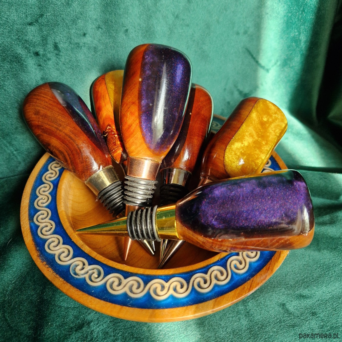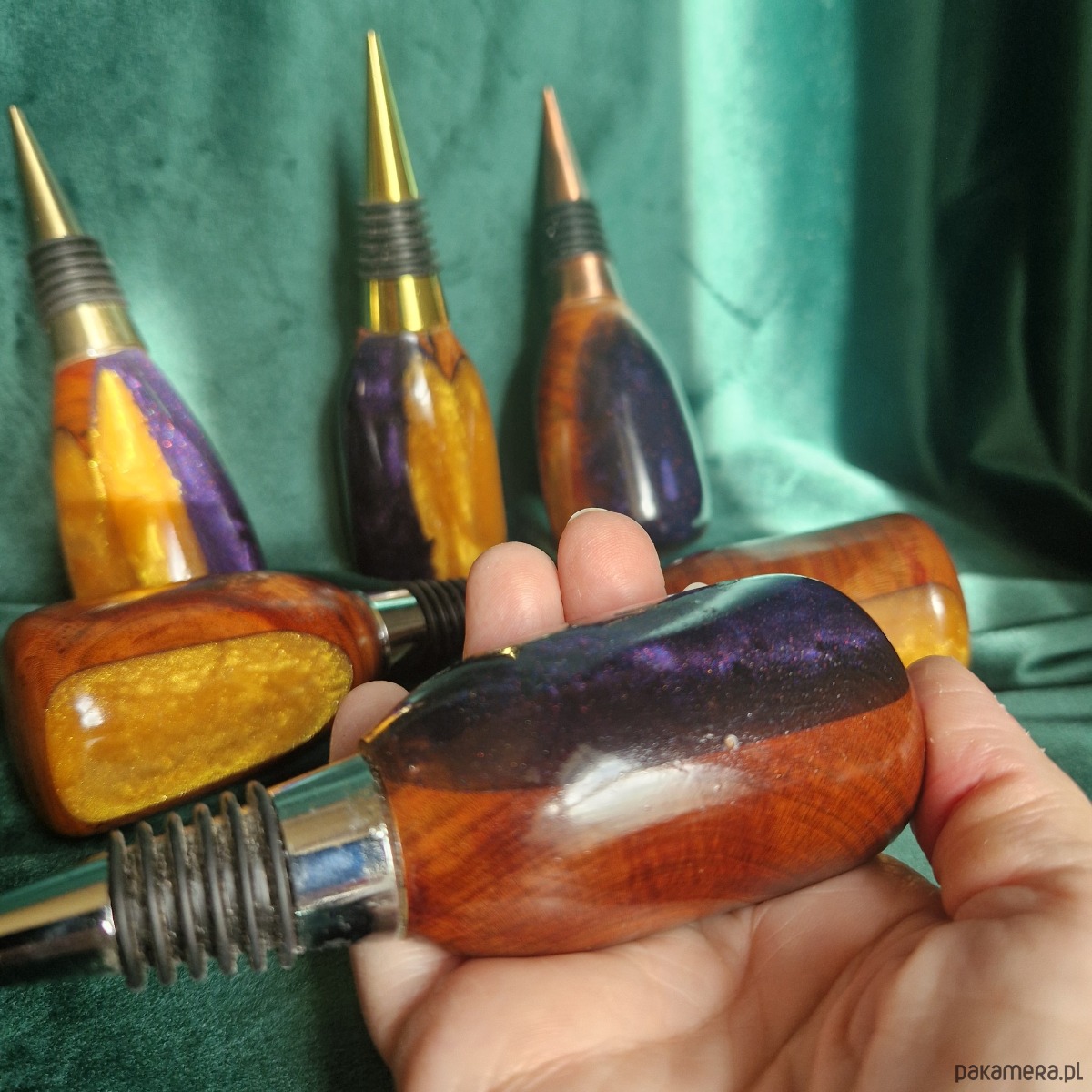Ten korek, wykonany z kawałków tajemniczego drewna egzotycznego z odzysku, łączy bogate, naturalne tekstury z wirującym złotem i głęboką fioletową żywicą epoksydową. Rezultat jest odważny, przyjemny w dotyku i elegancki. Mały, ale efektowny, pokazuje, że dbasz o swoje wino i jego prezencję.