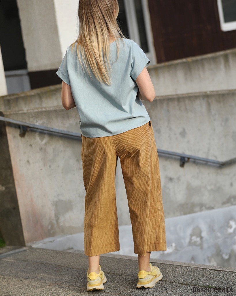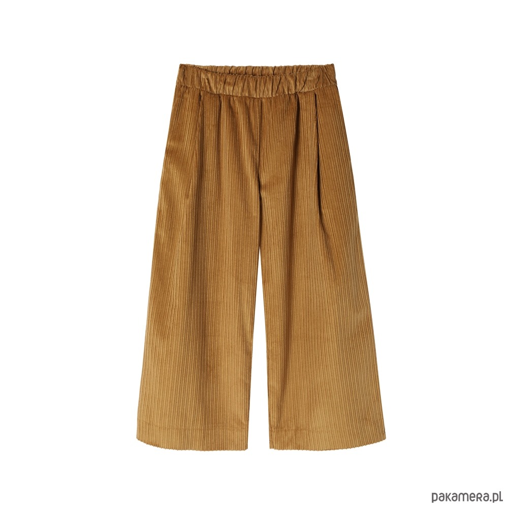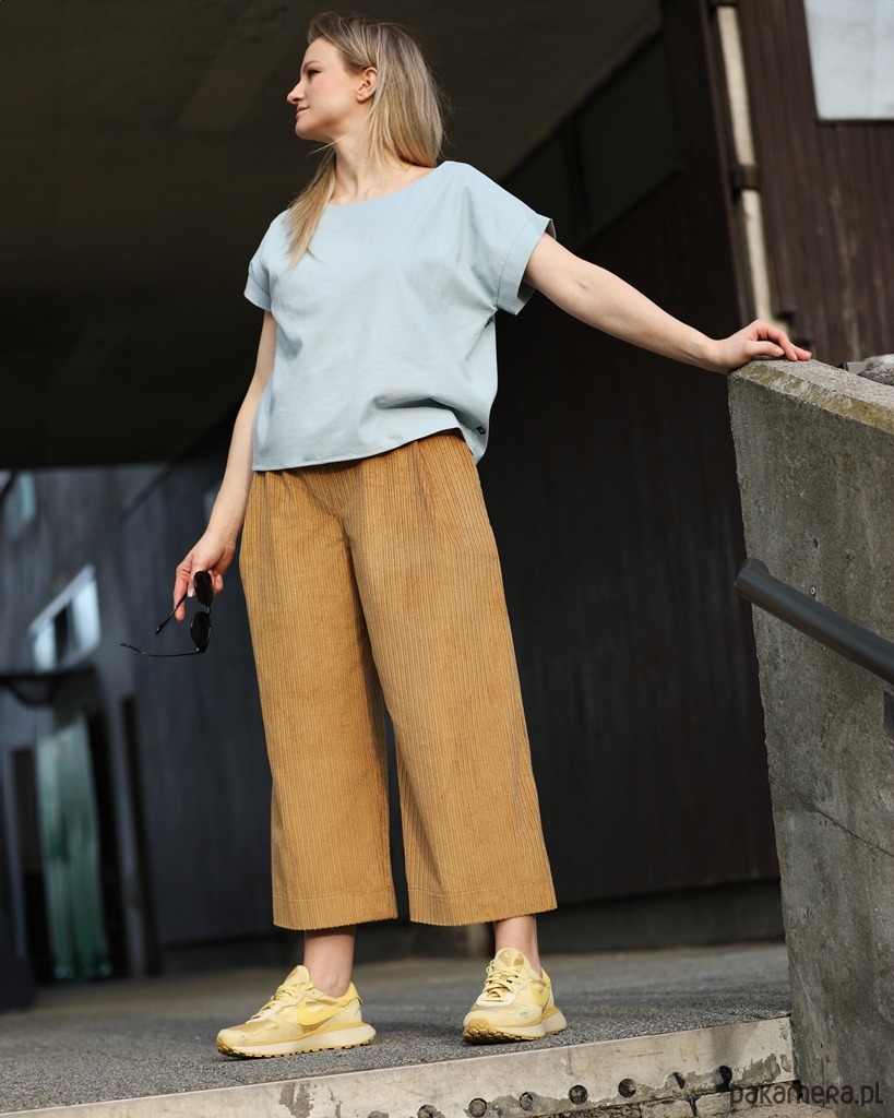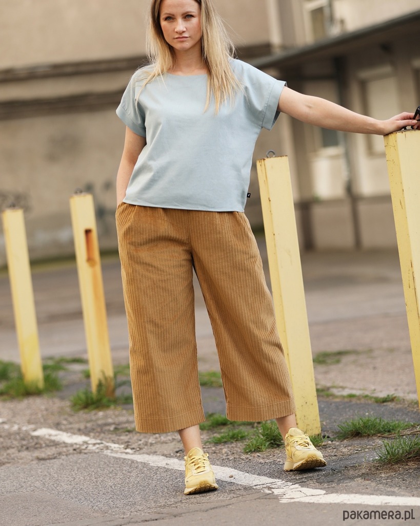 Wyjątkowo wygodne szerokie spodnie typu culotte o długości 7/8. Wykonane z bawełnianego sztruksu. Spodnie świetnie się układają i są bardzo przyjemne w użytkowaniu. Tkanina, z której uszyty jest model Korna jest zwarta i stabilna, co powoduje, że spodnie świetnie trzymają formę.