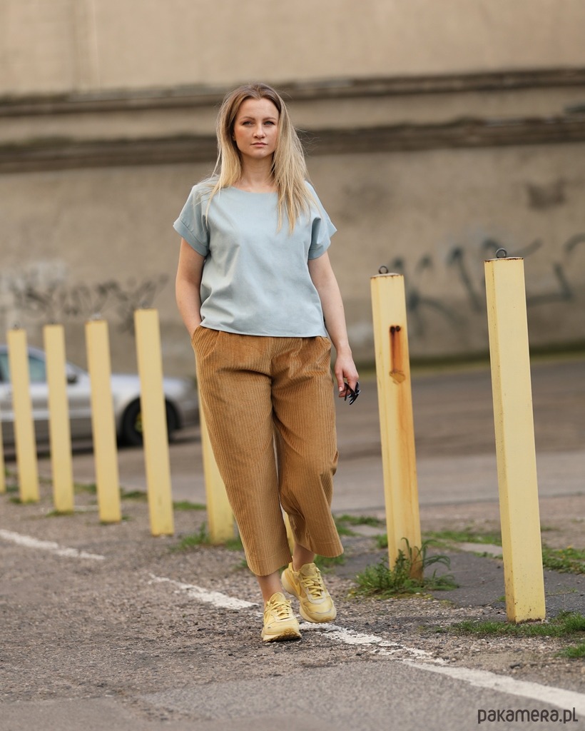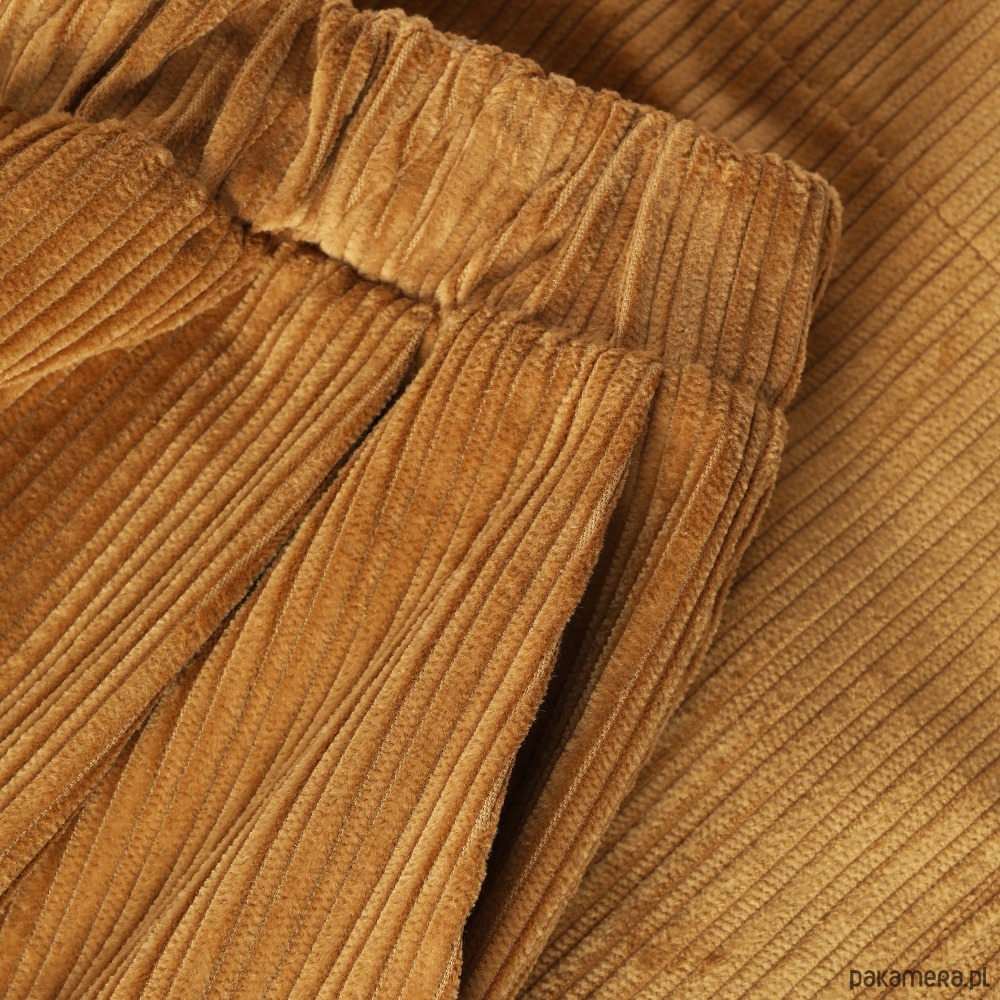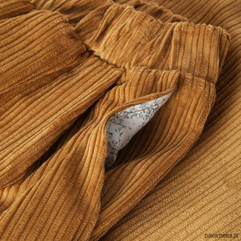 Wyjątkowo wygodne szerokie spodnie typu culotte o długości 7/8. Wykonane z bawełnianego sztruksu. Spodnie świetnie się układają i są bardzo przyjemne w użytkowaniu. Tkanina, z której uszyty jest model Korna jest zwarta i stabilna, co powoduje, że spodnie świetnie trzymają formę.