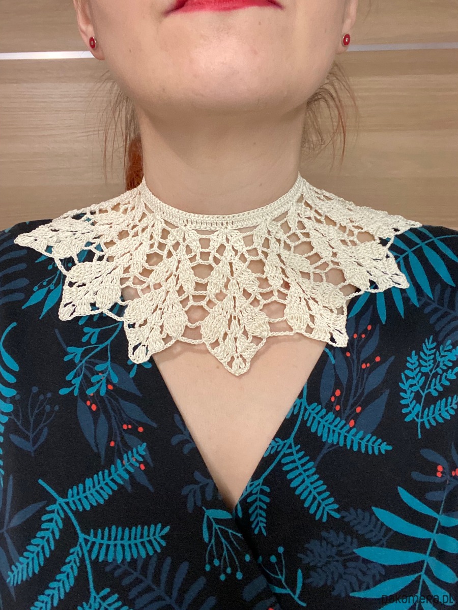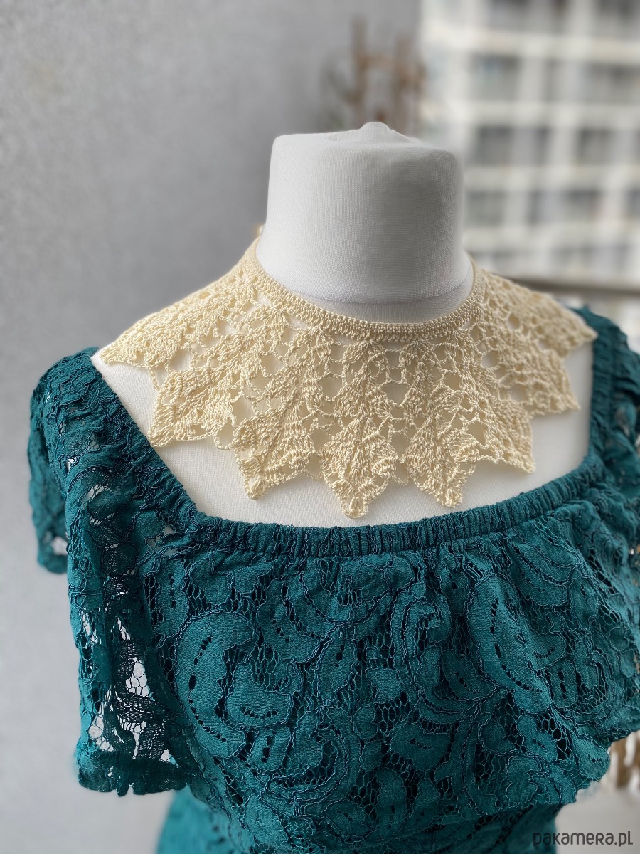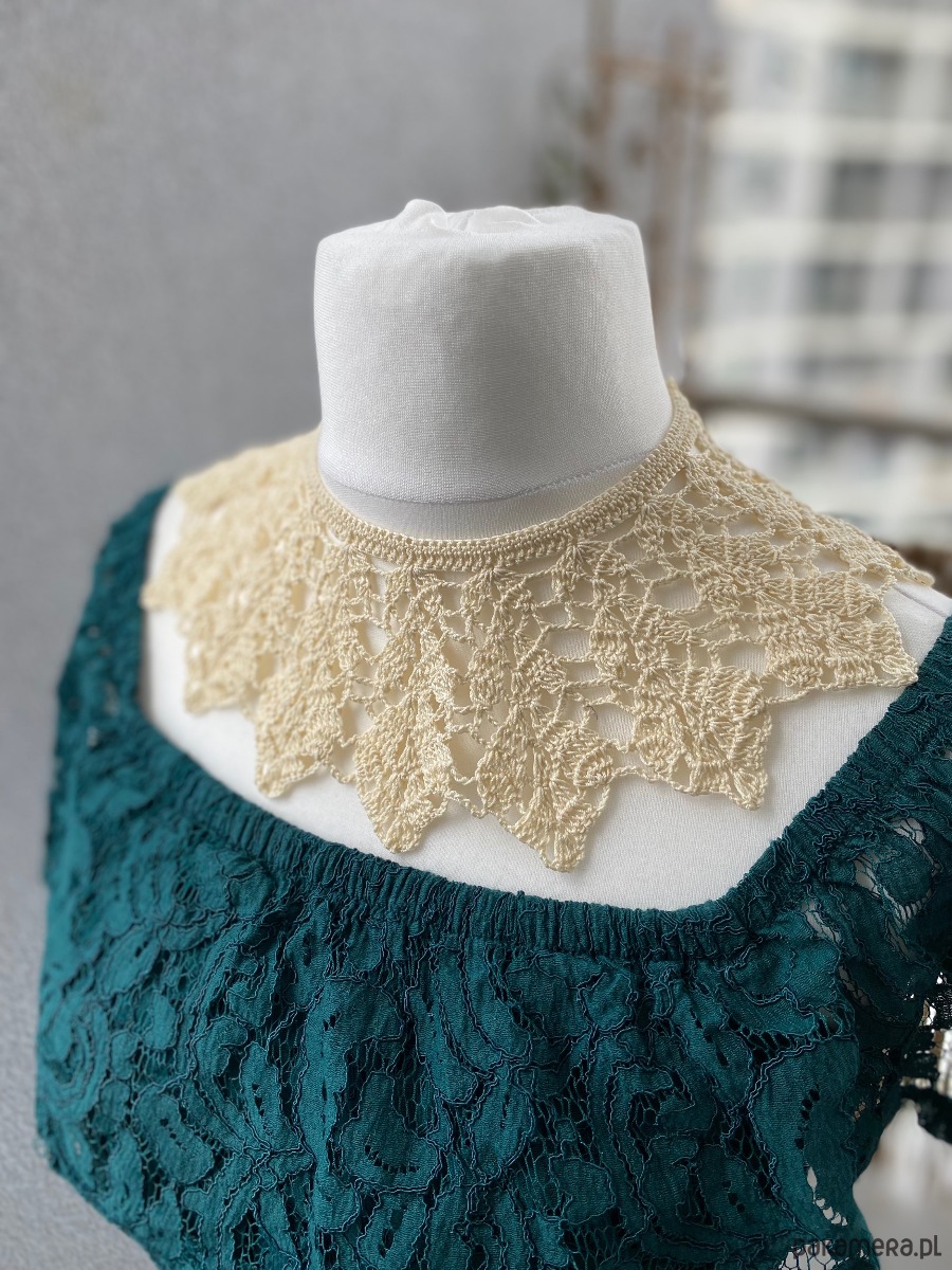 Delikatna, kremowa koronka układa się w elegancki wachlarzowy wzór, pięknie podkreślając szyję i dekolt. Lekki, a jednocześnie efektowny, kołnierzyk zapinany na drobny dekoracyjny guziczek, który dodaje mu wyjątkowego uroku. To idealny dodatek do sukienek i bluzek – sprawdzi się zarówno na co dzień, jak i na wyjątkowe okazje.