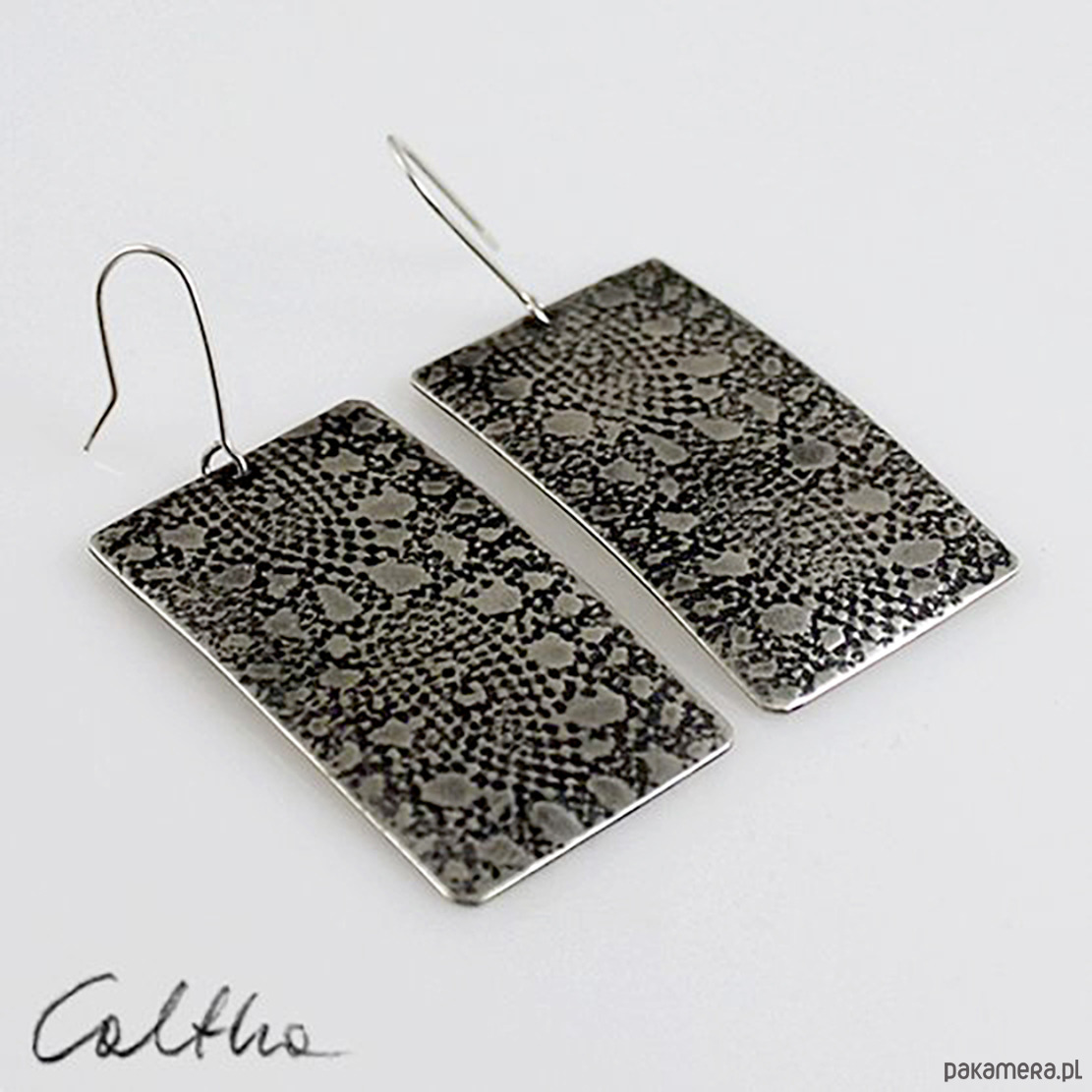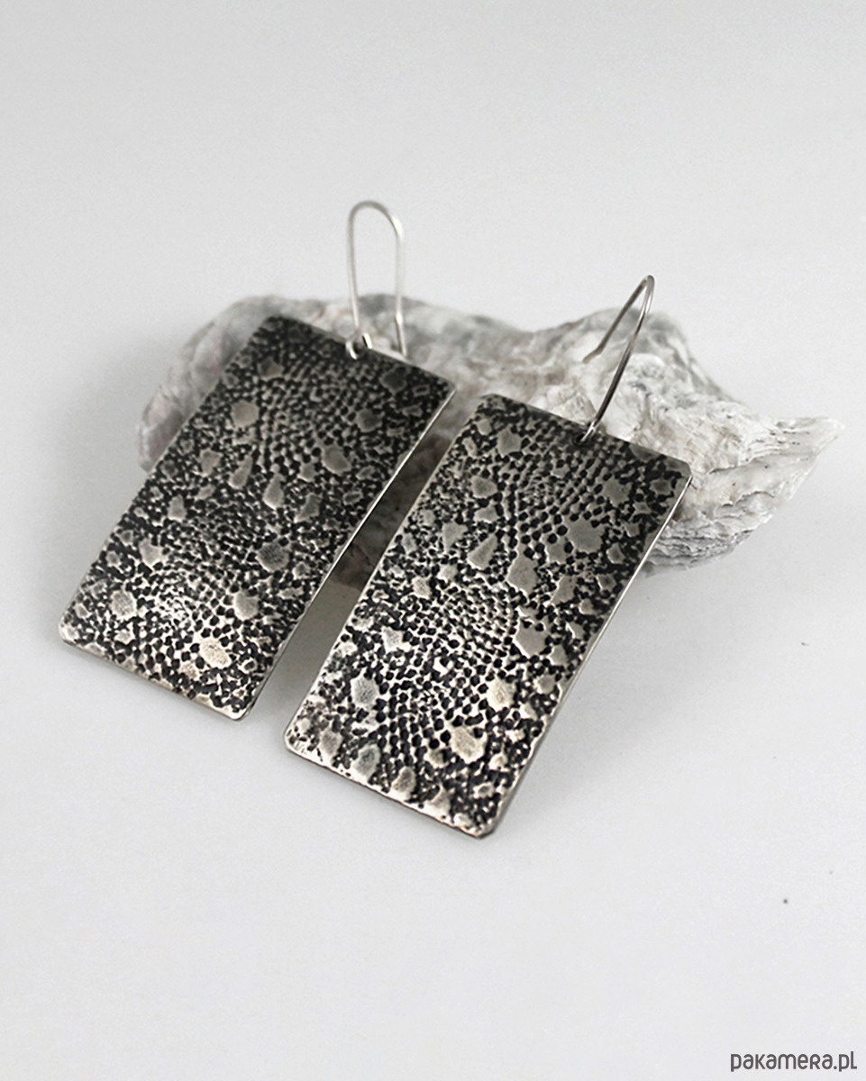 Kolczyki zostały wykonane ręcznie z metalu (alpaka – nowe srebro). Moją ciekawą fakturę i są lekko patynowane w procesie oksydacji (bez użycia sztucznych barwników). Całkowita długość kolczyka to ok 6 cm. Bigle również są srebrne. Na zamówienie mogę je wymienić na eleganckie srebrne klipsy (przy zamówieniu proszę wybrać odpowiednią opcję).