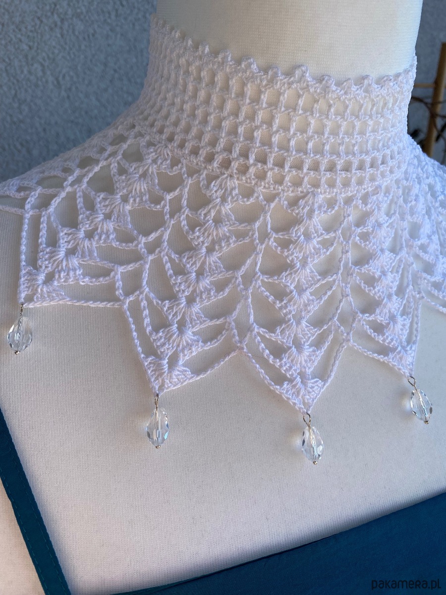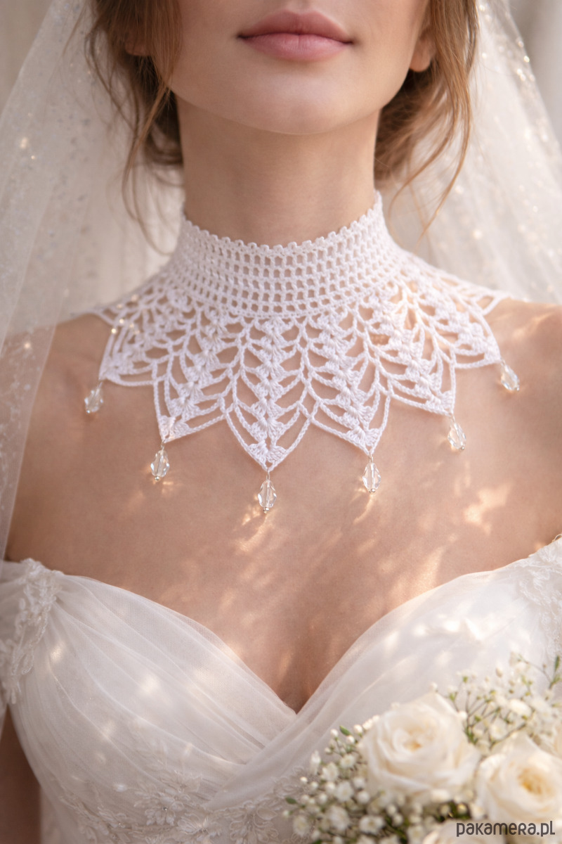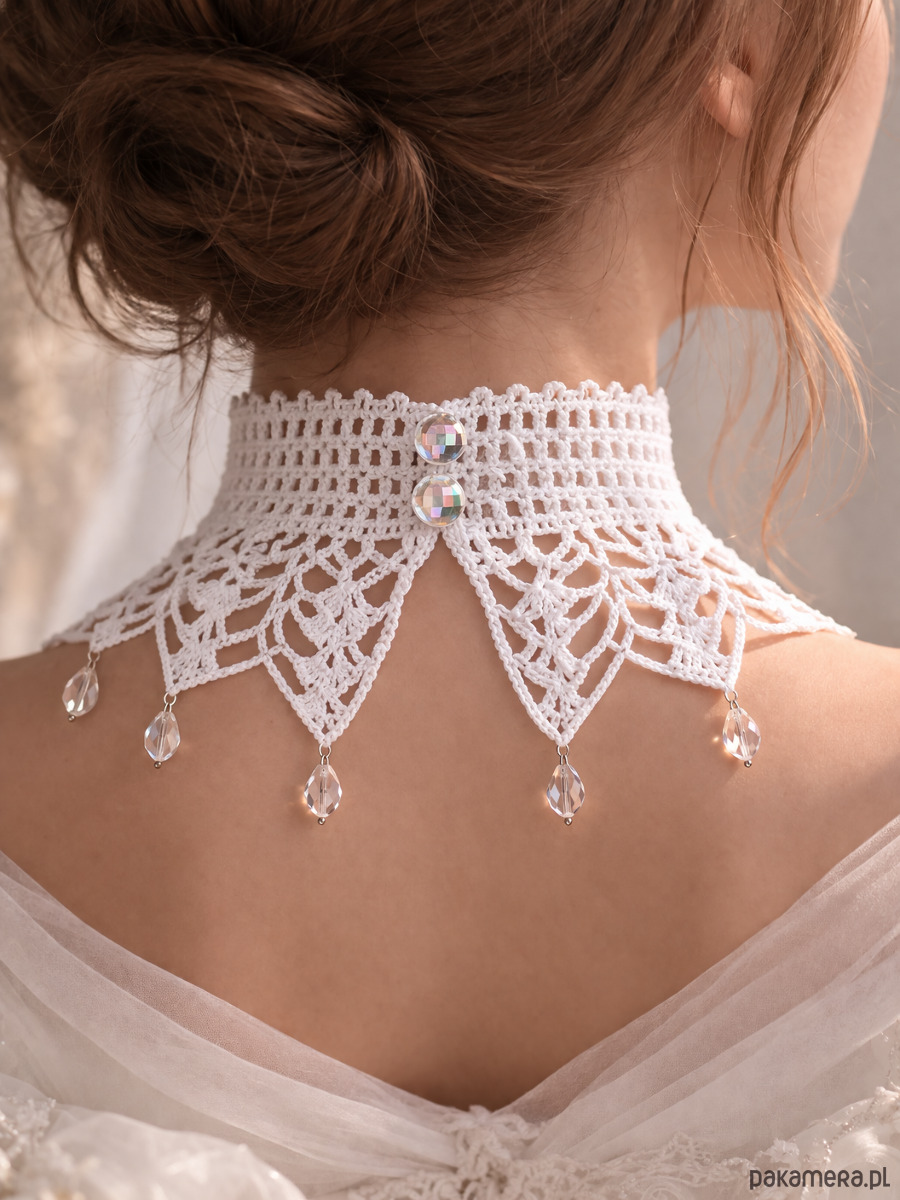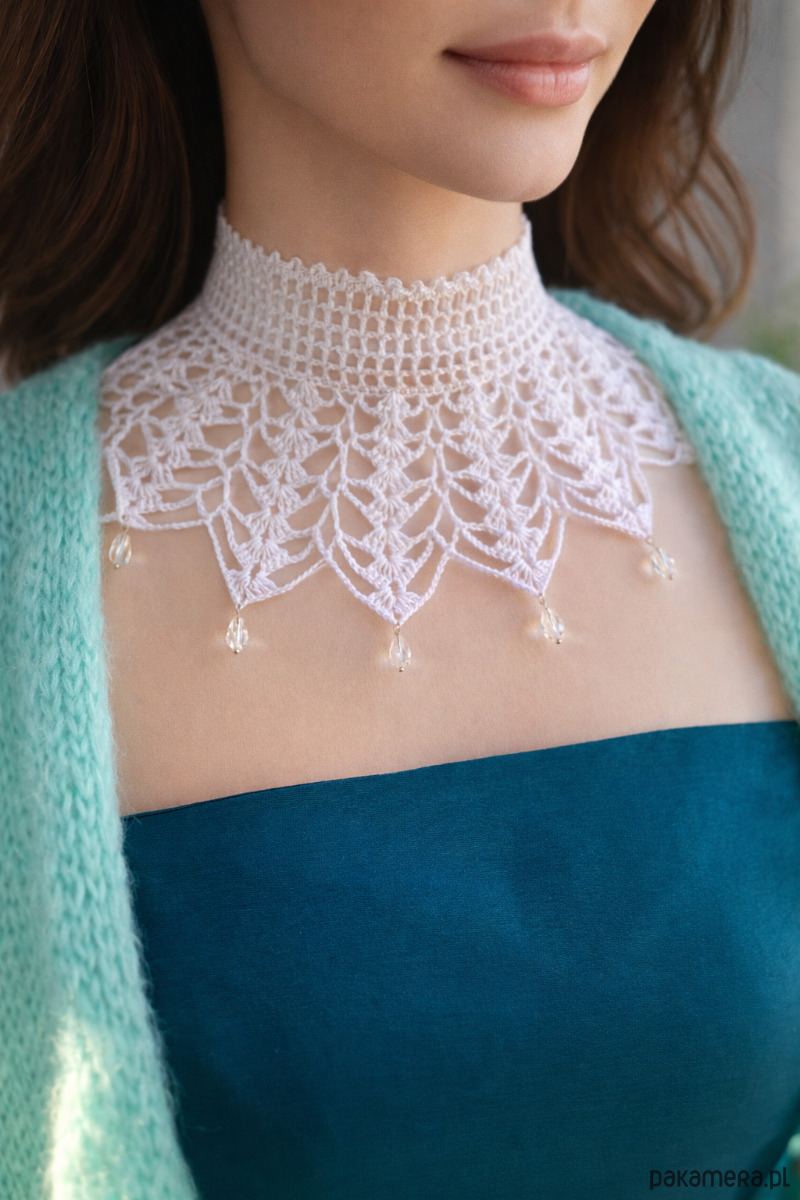Delikatny, ręcznie wykonany naszyjnik w formie koronkowej koli.