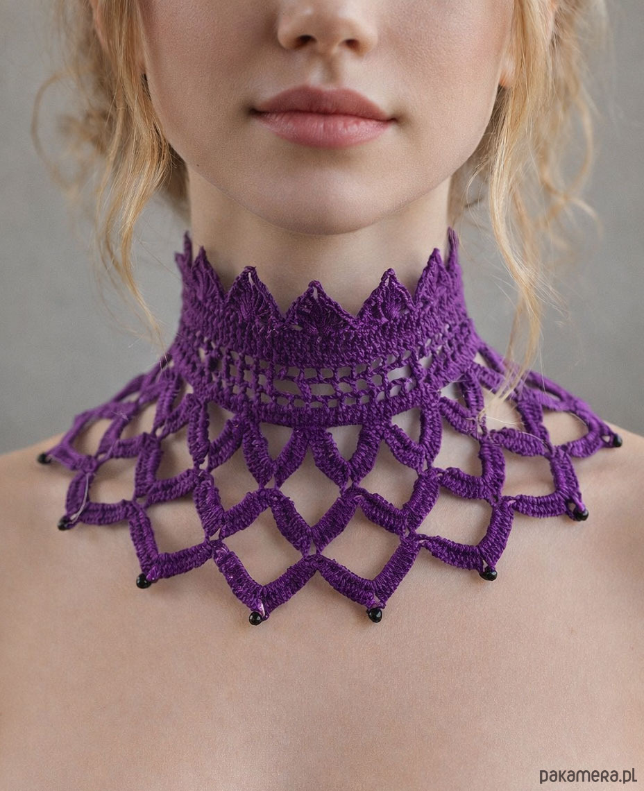 Unikatowy naszyjnik szydełkowy w odcieniu głębokiego fioletu, ozdobiony subtelnymi czarnymi koralikami. Jego koronkowy wzór układa się niczym pajęcza sieć światła i cienia, nadając każdej stylizacji aurę tajemnicy i elegancji.