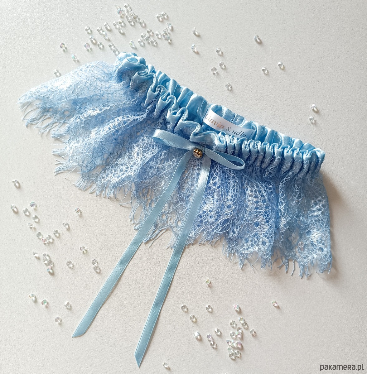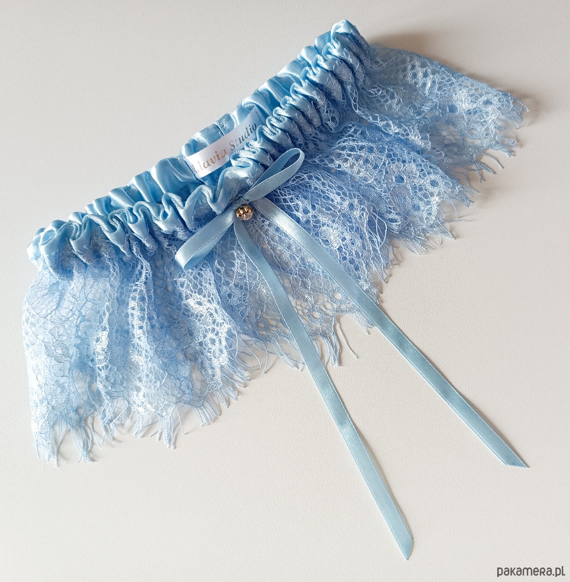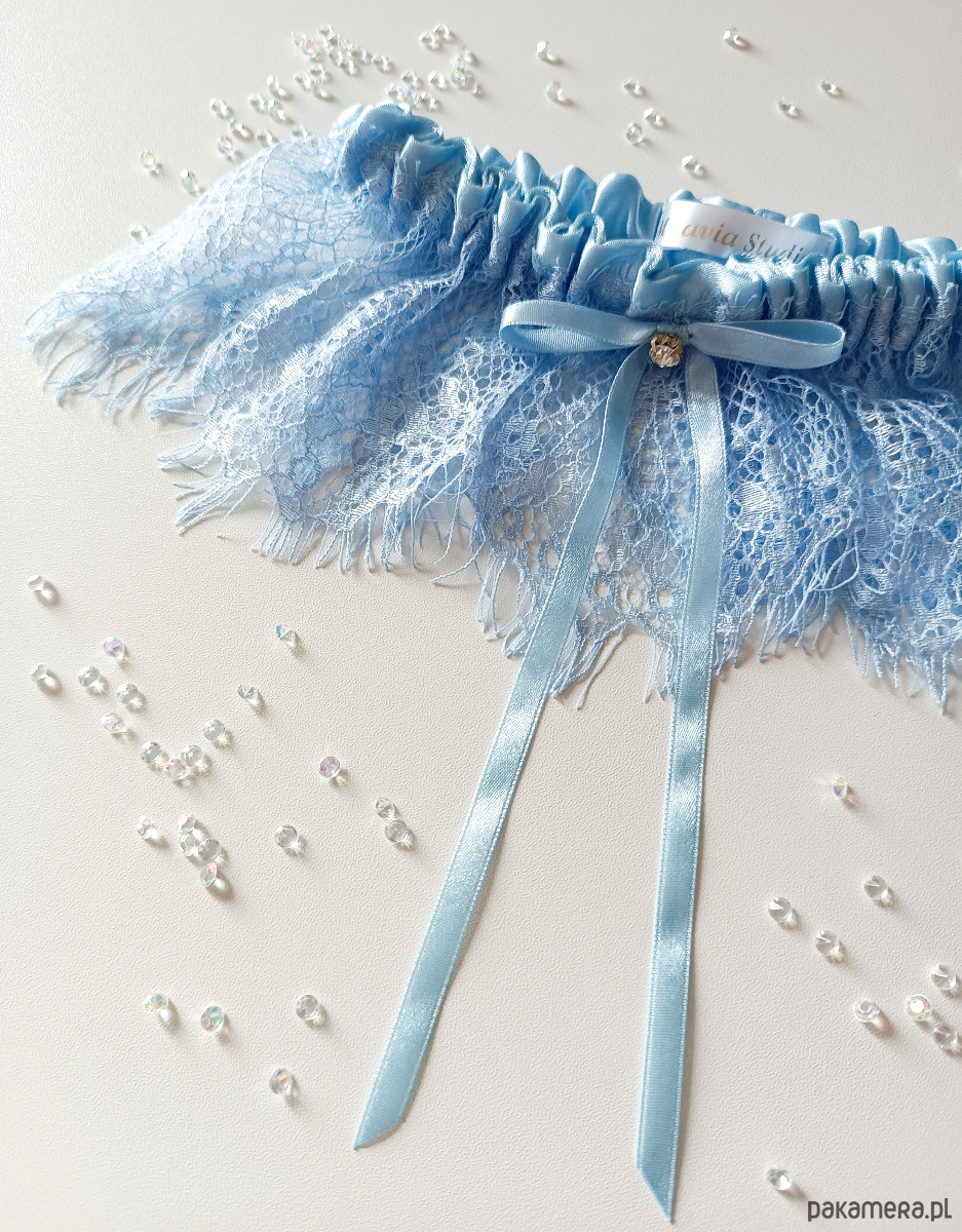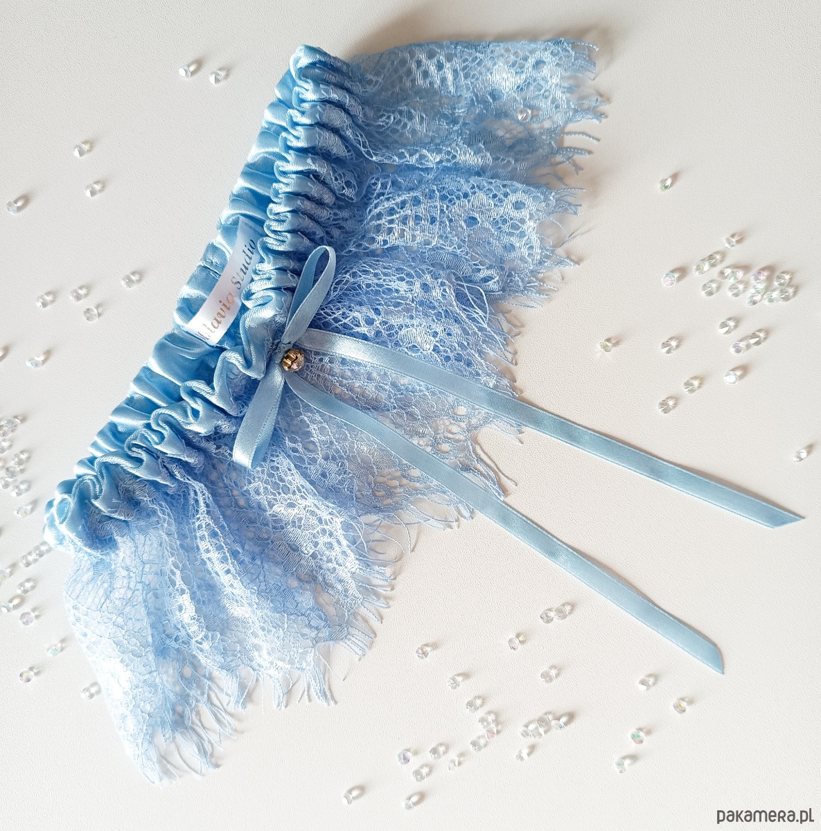 Niebieska podwiązka ślubna Eliza Blue została uszyta z miękkiej, niebieskiej satyny oraz z wysokiej jakości koronki.
