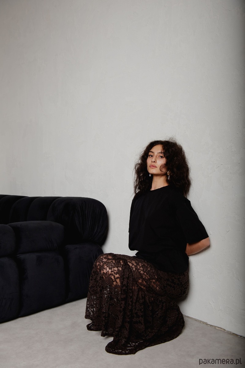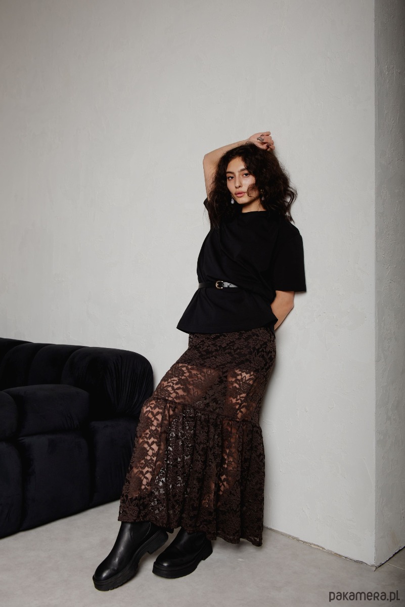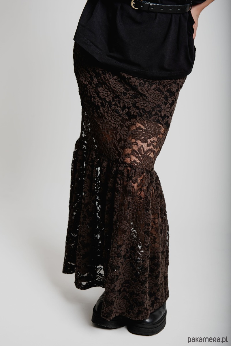 Koronkowa spódnica maxi w kolorze czekoladowym to połączenie zmysłowej kobiecości, komfortu i ponadczasowej elegancji. Wykonana z delikatnej, a jednocześnie wyrazistej koronki, subtelnie pracuje z ruchem ciała, tworząc lekki, płynny efekt na sylwetce.