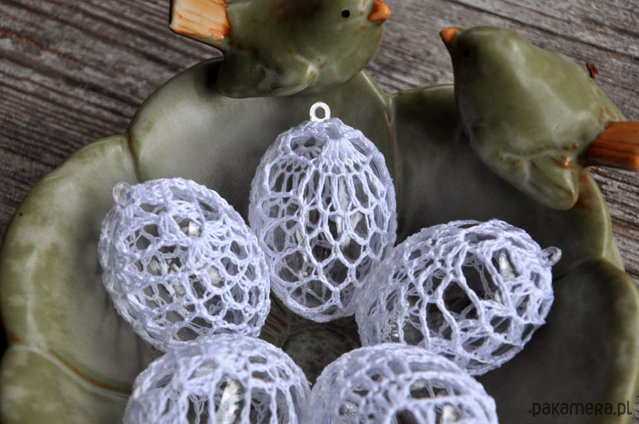Piękne i wyjątkowe, koronkowe pisanki na akrylowej bazie wysokiej przejrzystości (wygląd szkła); w zestawie 5szt; wielkość ok 8cm; kolor koronki- biały; jajeczka posiadaja zawieszki; zapraszam