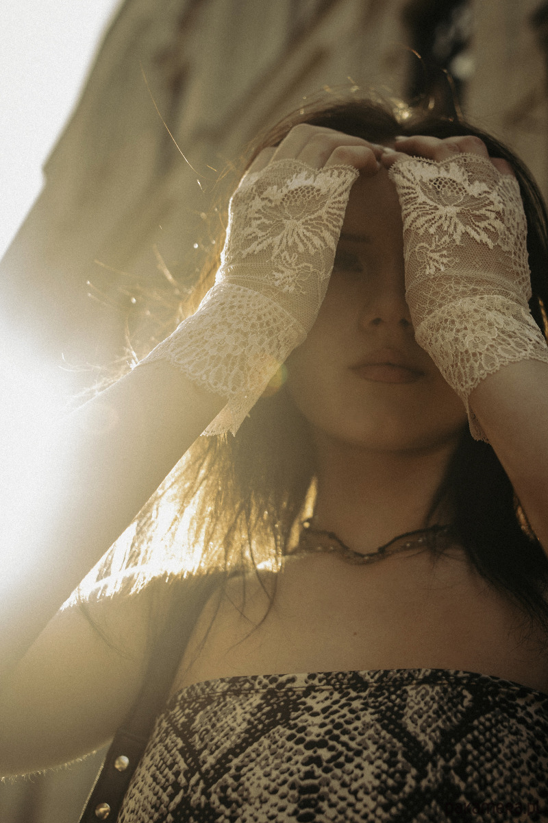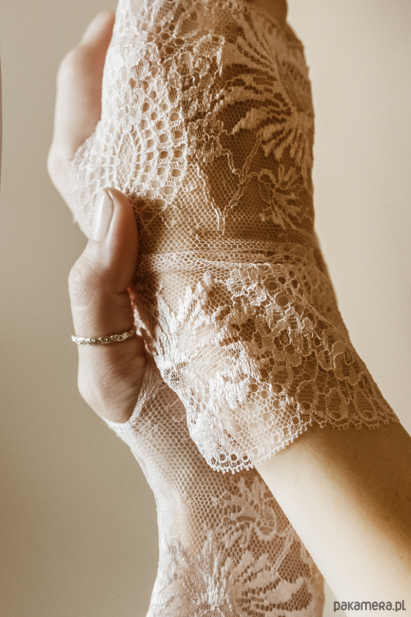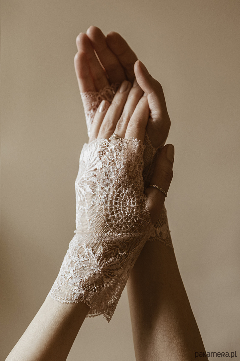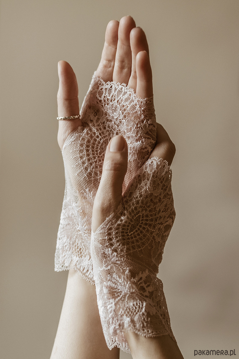 Koronkowe rękawiczki mitenki - Pudrowy Dotyk to elegancki dodatek, który doda niezwykłego uroku każdej stylizacji. Wykonane z delikatnej koronki w odcieniu jasnego perłowego różu, te krótkie rękawiczki o długości za kostkę łączą w sobie romantyzm i subtelność.