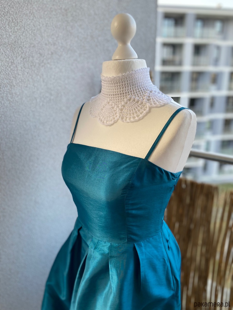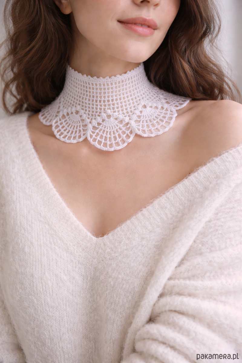 Koronkowy choker o wyrazistej, kołnierzykowej formie — lekki, a jednocześnie przyciągający uwagę.