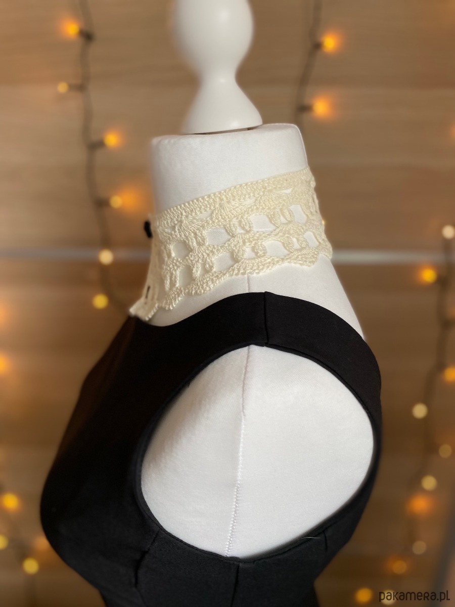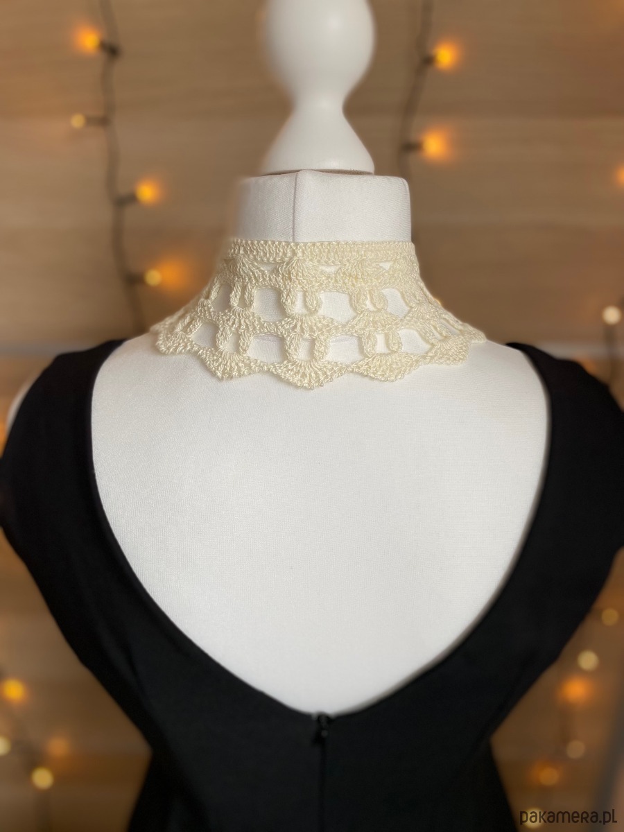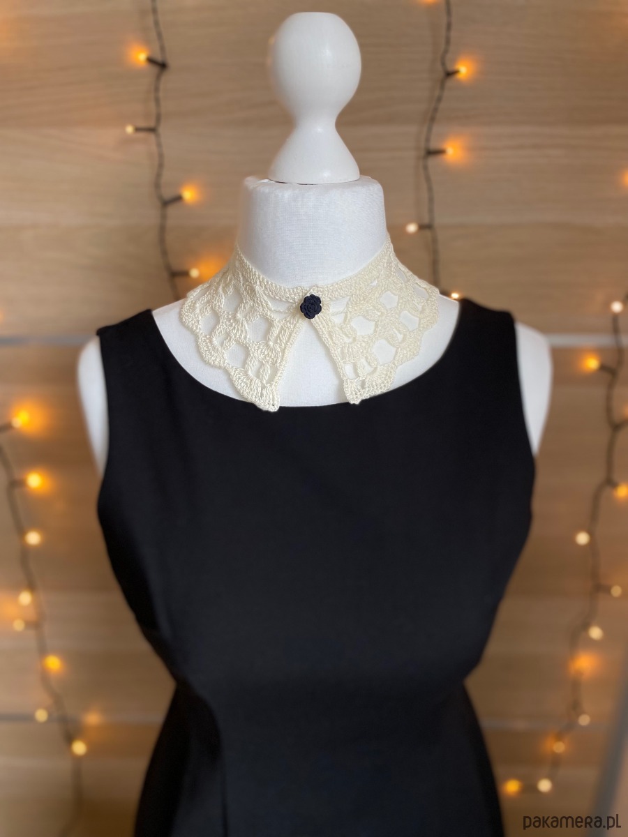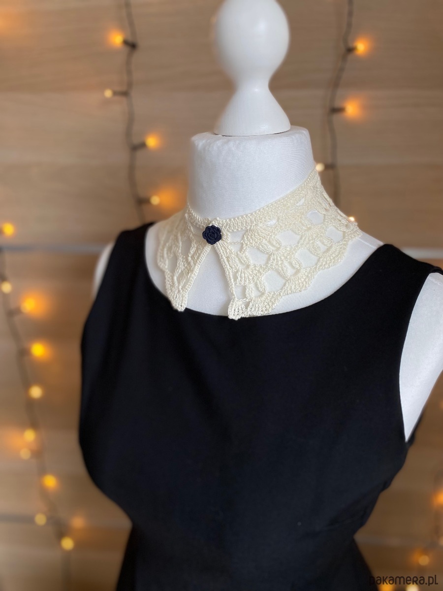 Koronkowy kołnierzyk w kolorze ecru zapinany na czarny guziczek różę.