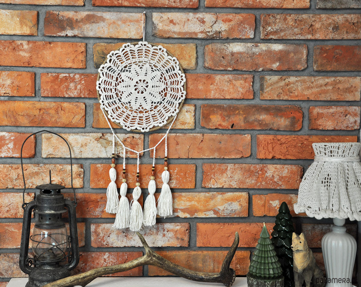 ozdobiony chwostami i drewnianymi koralikami, obręcz opleciona jutowym sznurkiem w kolorze naturalnym;