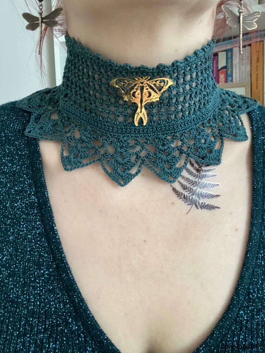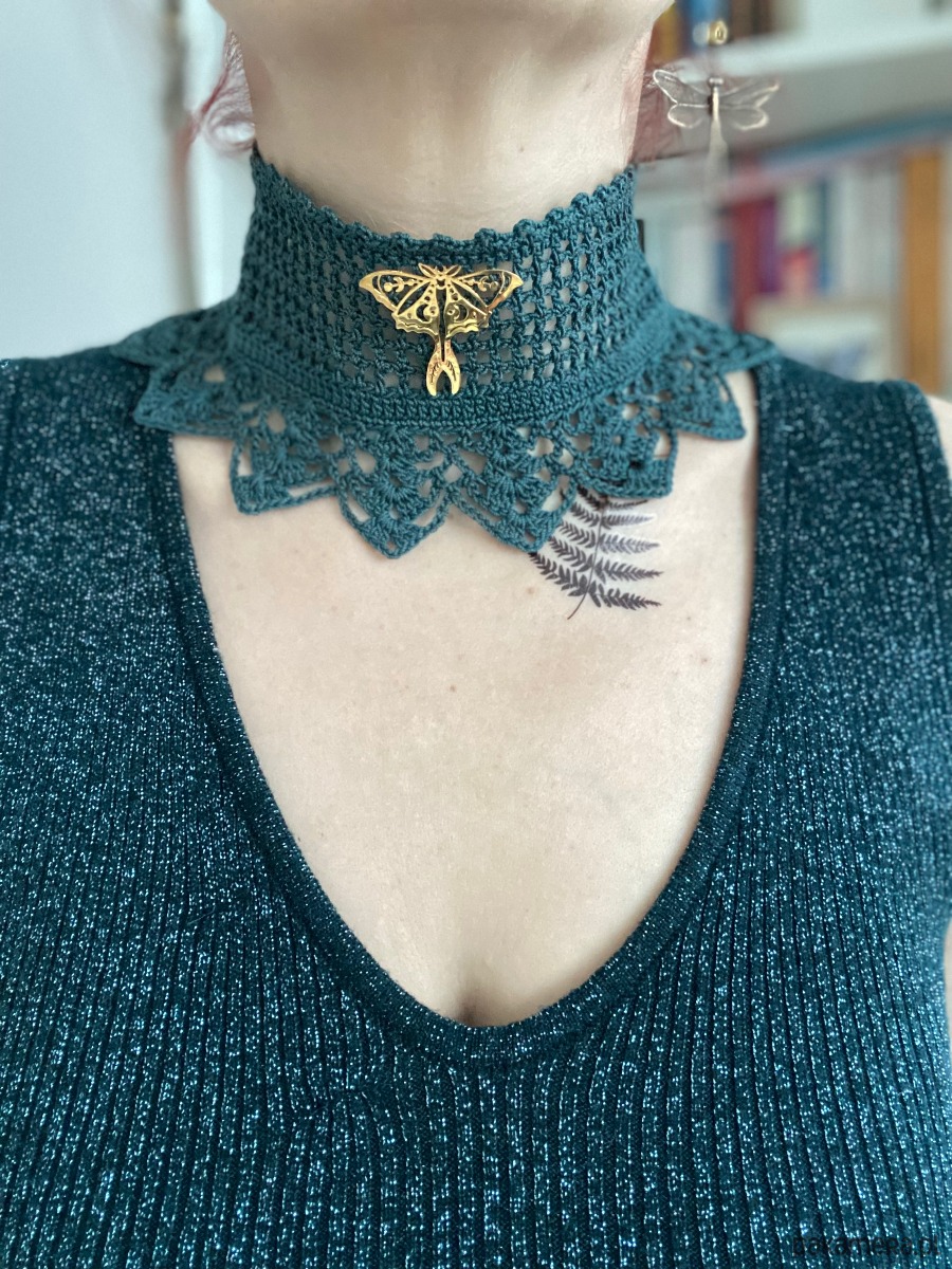 Koronkowy naszyjnik boho zielony z Ćmą