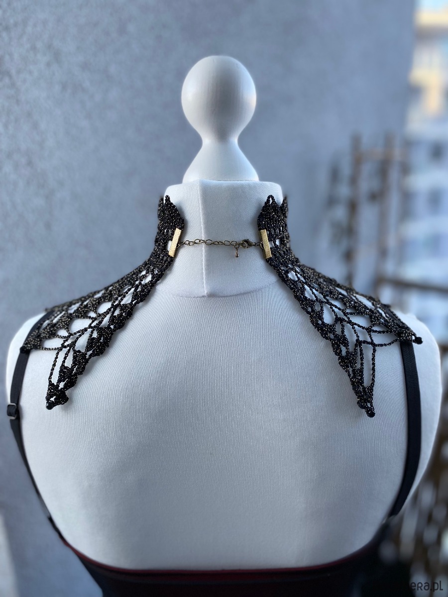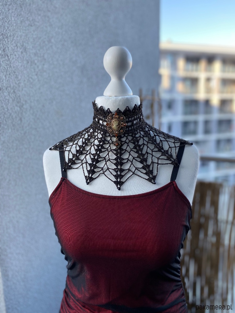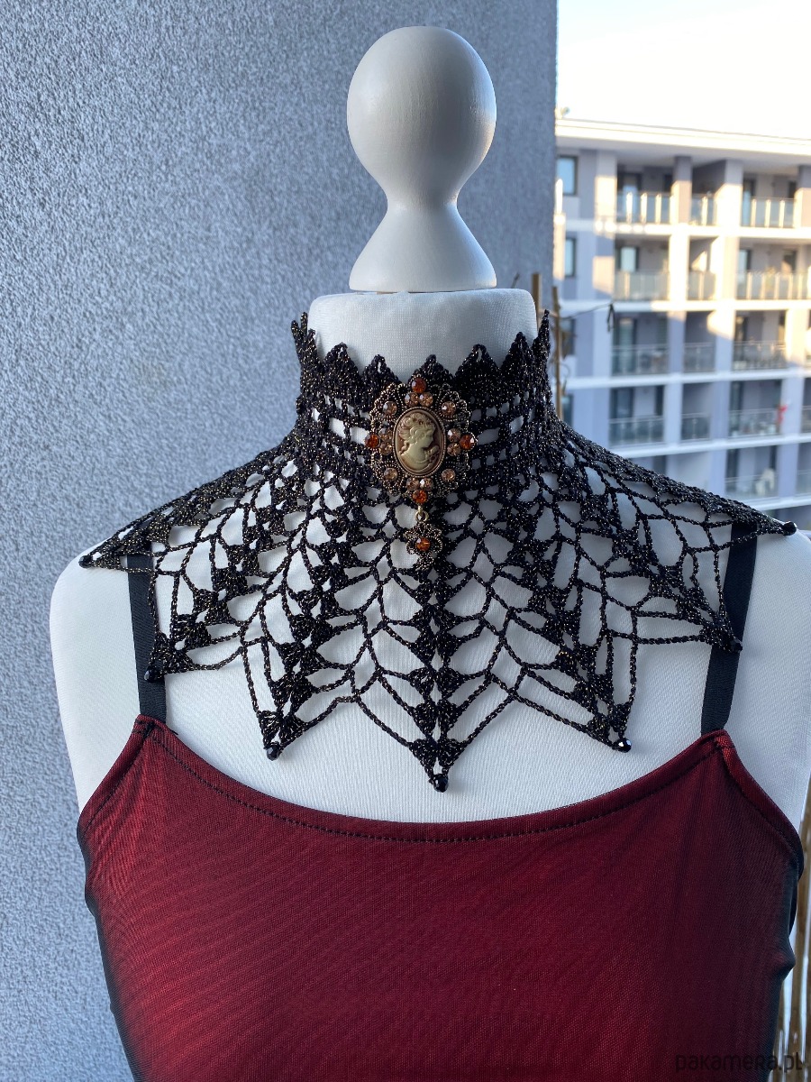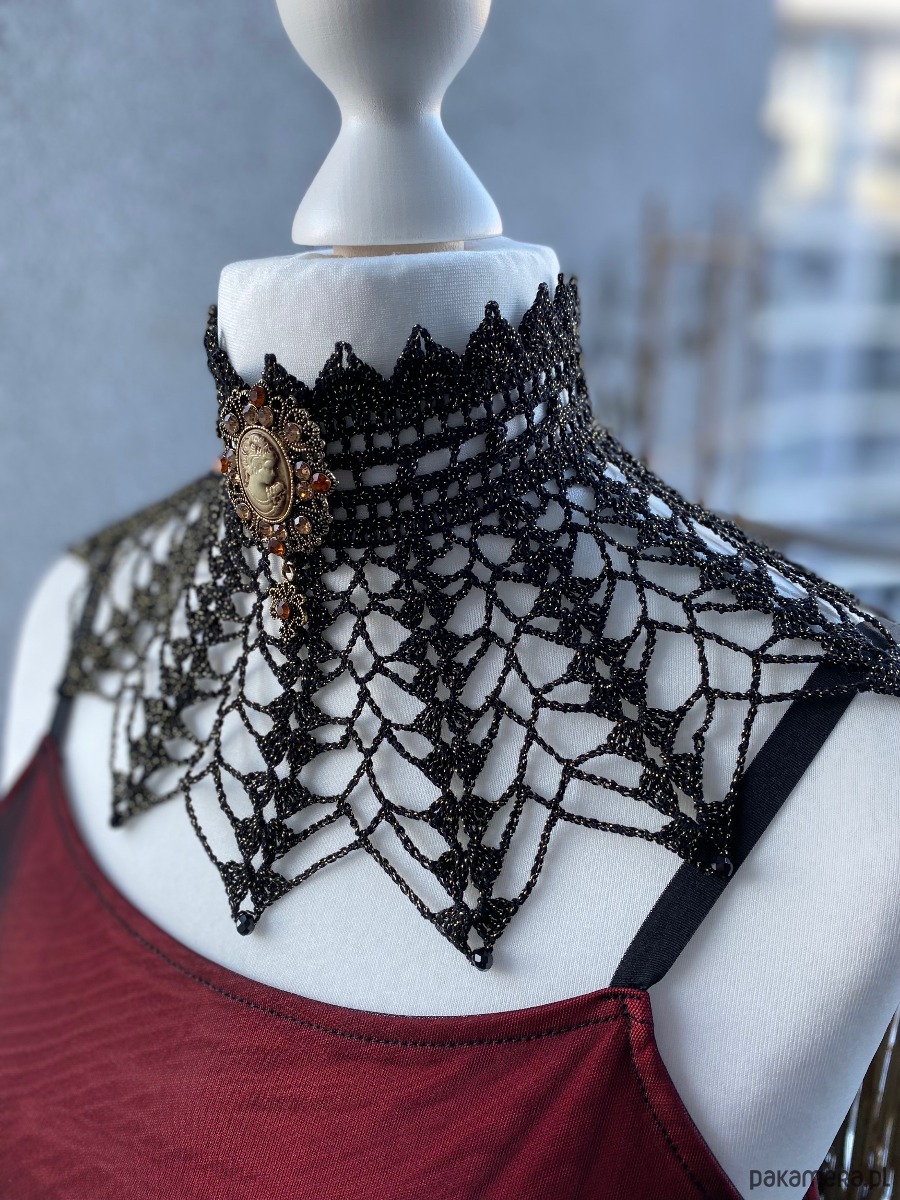 Koronkowy naszyjnik Golden hour, czerń ze złotą nitką, niczym wieczorne przyjęcie✨Unikatowy, pięknie wygląda do sukni lub bluzki ze stójką 💕Na brzegach koronki 6mm koraliki fasetowane w kolorze czerni, w centrum piękna Kamea brosza którą można odpiąć.