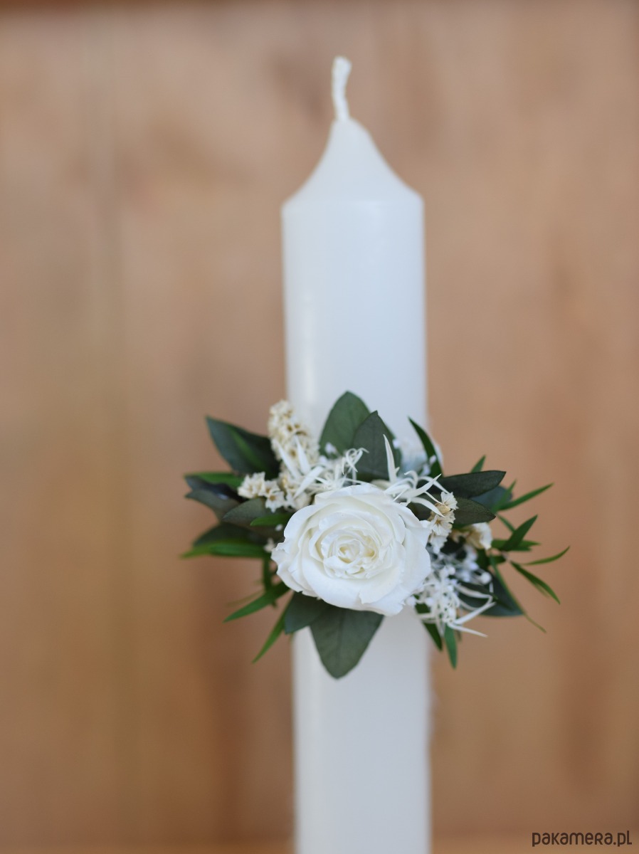 Korsarz komunijny na rękę z białą różą, ozdoba na świecę