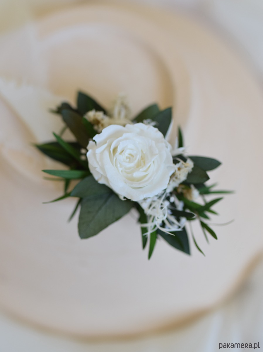 Korsarz komunijny na rękę wykonany z naturalnych roślin stabilizowanych i suszonych w klasycznej biało-zielonej kolorystyce. Centralnym elementem kompozycji jest stabilizowana biała róża, uzupełniona drobnymi kwiatami i zielonymi dodatkami.