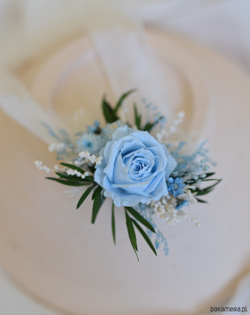 Korsarz komunijny na rękę wykonany z naturalnych roślin stabilizowanych i suszonych, w błękitno-białej kolorystyce. Główną częścią kompozycji jest stabilizowana róża w odcieniu jasnego błękitu, uzupełniona drobnymi kwiatami suszonymi i zielonymi dodatkami.