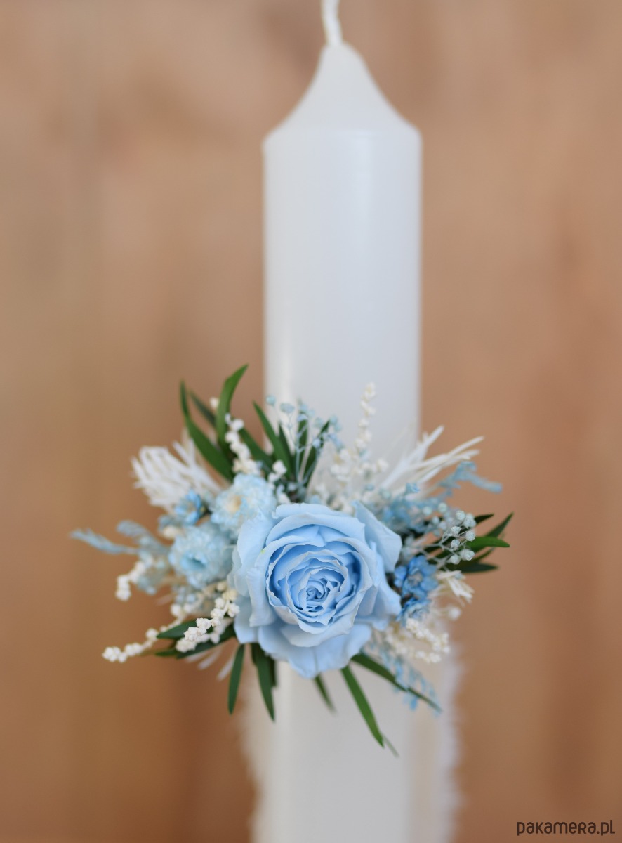 Korsarz komunijny na rękę z błękitną różą, ozdoba na świecę