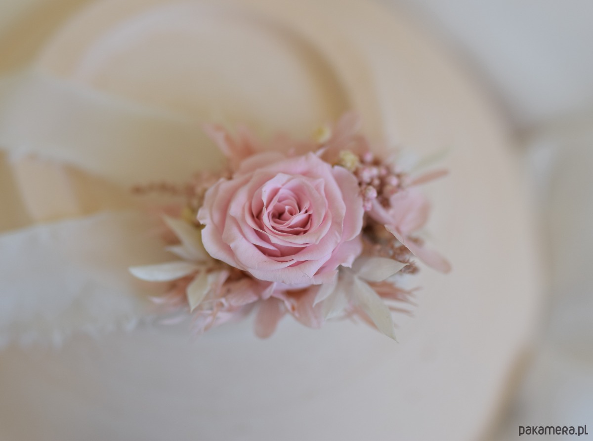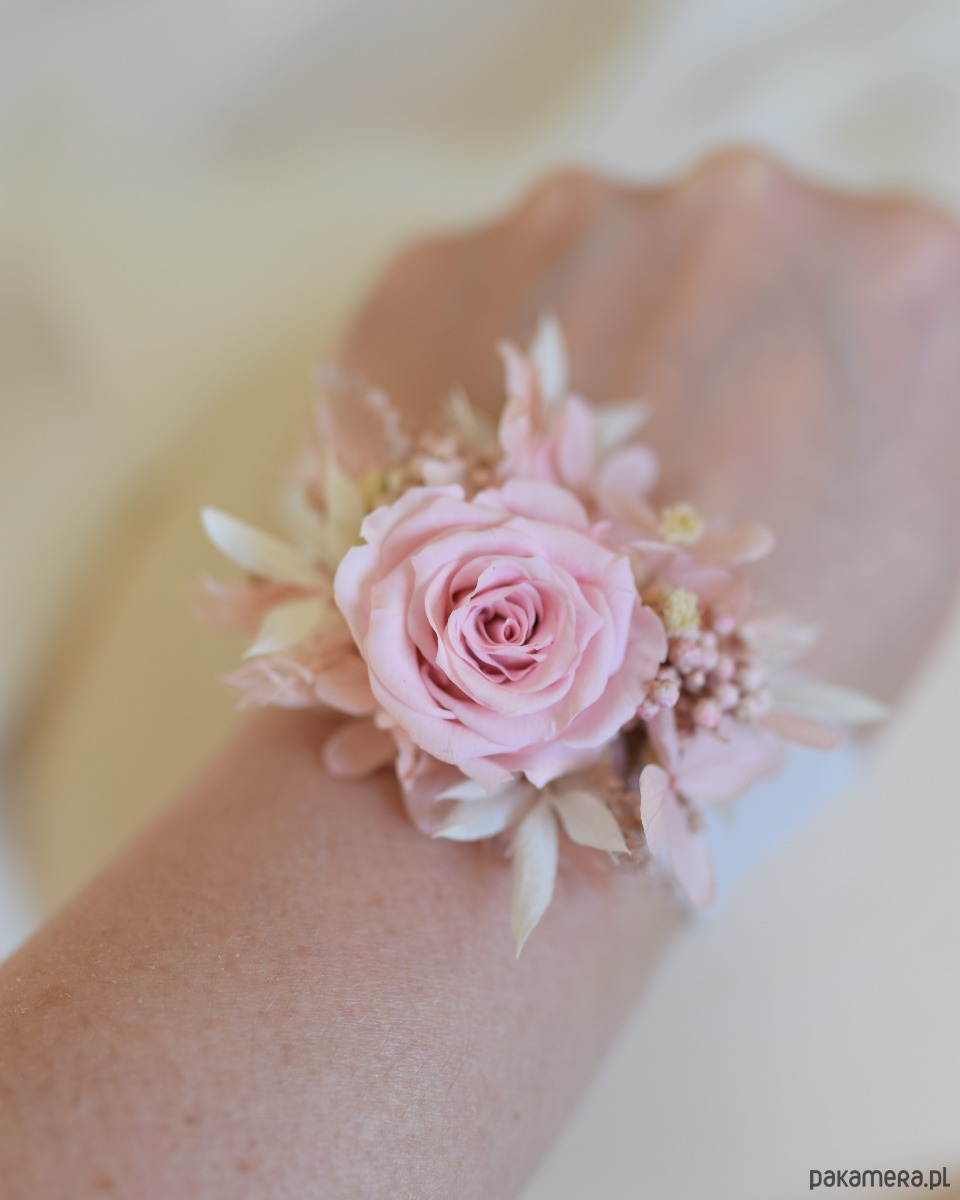 Korsarz komunijny na rękę wykonany z naturalnych roślin stabilizowanych i suszonych w pudrowo-różowej kolorystyce. Centralnym elementem jest stabilizowana róża w odcieniu pudrowego różu, uzupełniona drobnymi kwiatami i jasnymi dodatkami.