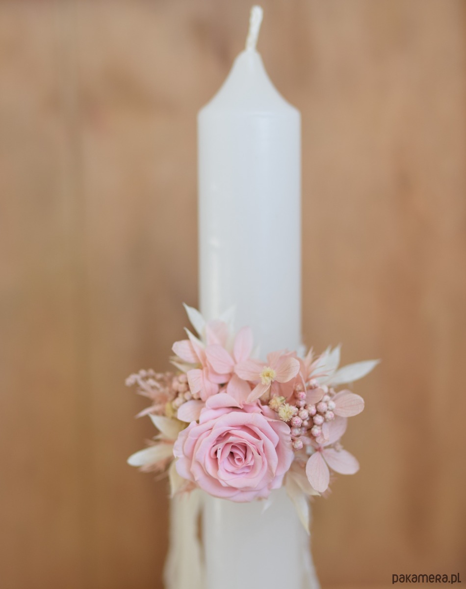 Korsarz komunijny na rękę z pudrową różą, ozdoba na świecę