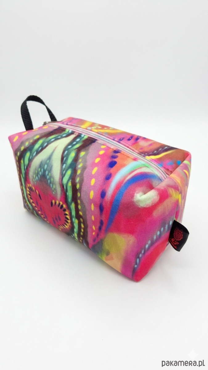 Kosmetyczka w formie kuferka uszyta z tkaniny tapicerskiej welur. W środku podszewka wodoodporna w kolorze jasnym fioletowym. Kosmetyczka posiada wygodny uchwyt.