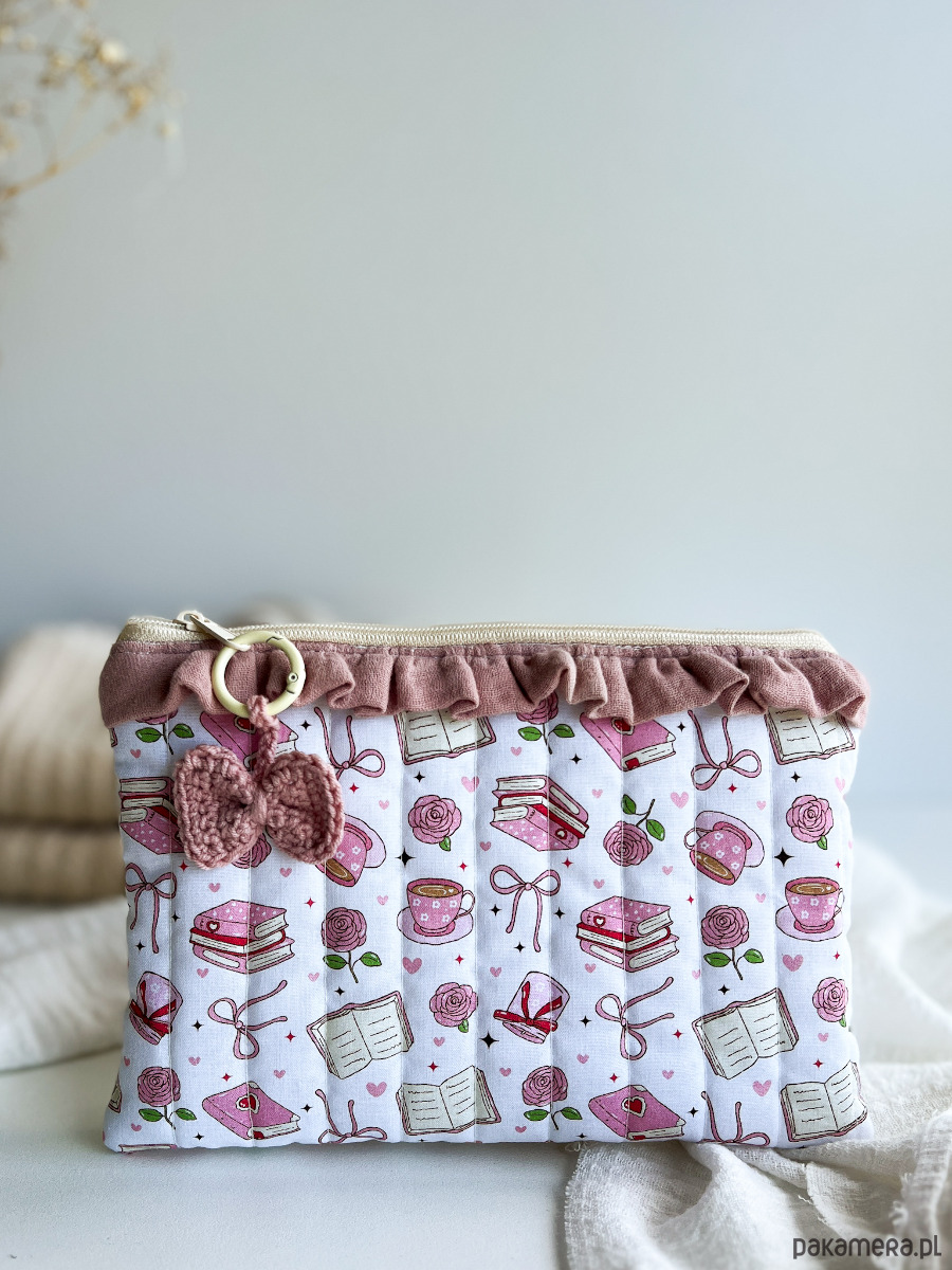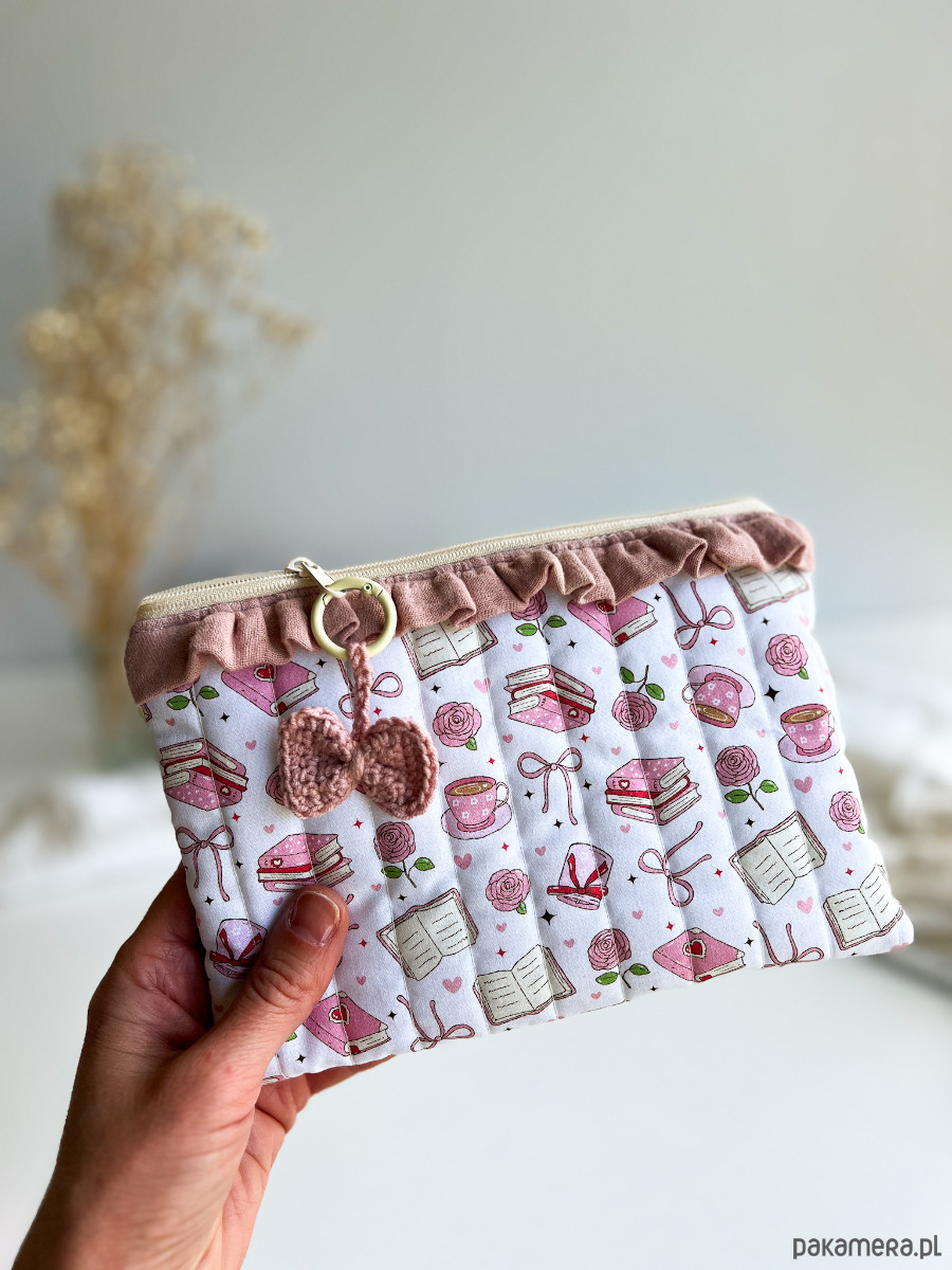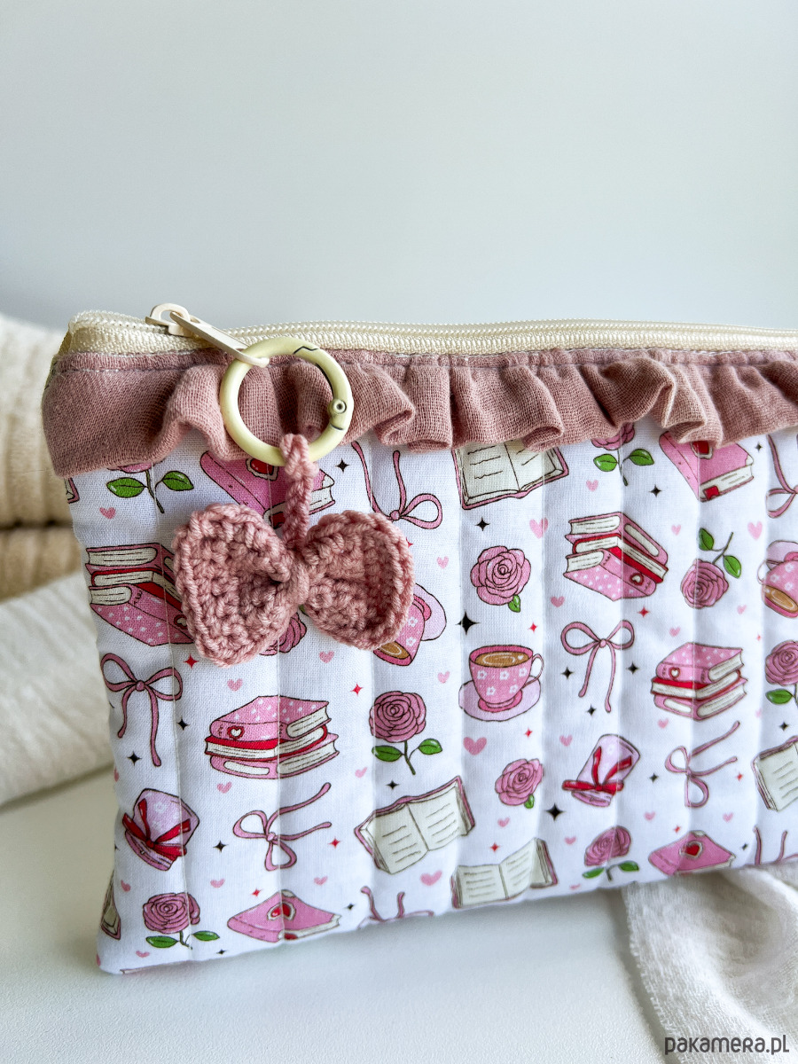 Miękka bawełna, romantyczna falbanka i ręcznie wykonana zawieszka w kształcie kokardki sprawiają, że to nie jest zwykły przedmiot – to coś, co poprawia humor za każdym razem, gdy po nią sięgasz.