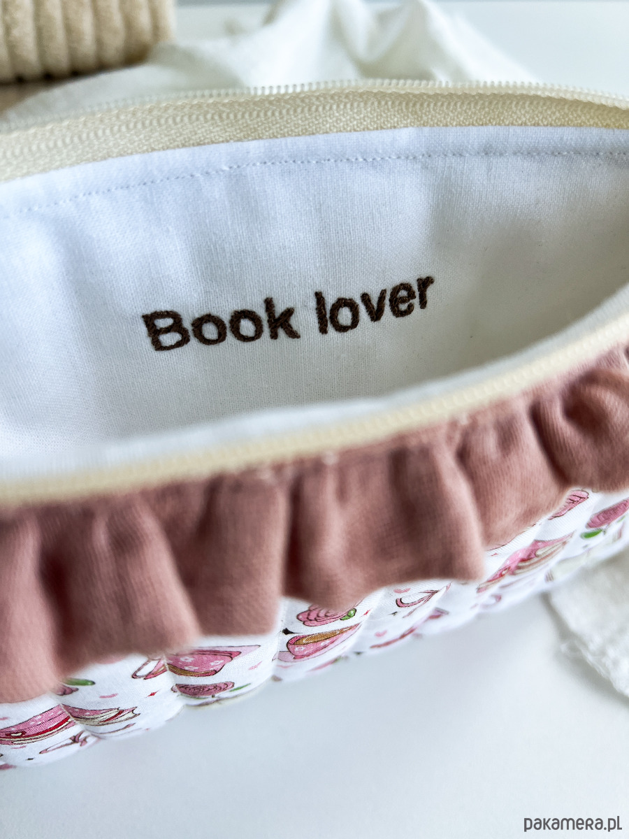 W środku – haft „book lover”. Subtelny, ale znaczący. Jak mały sekret między Tobą a tą kosmetyczką 📖