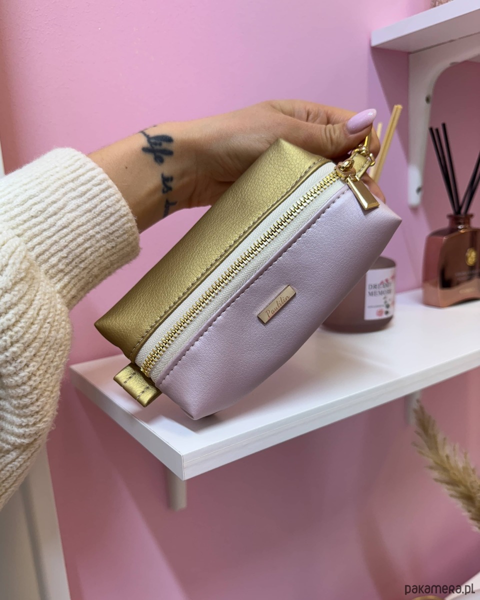 Kosmetyczka damska saszetka dopinana perłowo różowa ze złotem