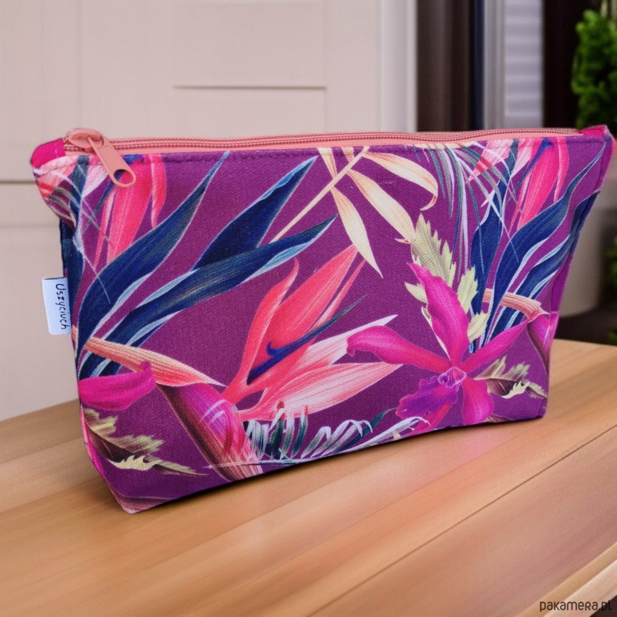 Kosmetyczka uszyta z najwyższej jakości weluru tapicerskiego z kolorowym wzorem. Welur ten jest bardzo przyjemny w dotyku, a jednocześnie wytrzymały i odporny na przetarcia.